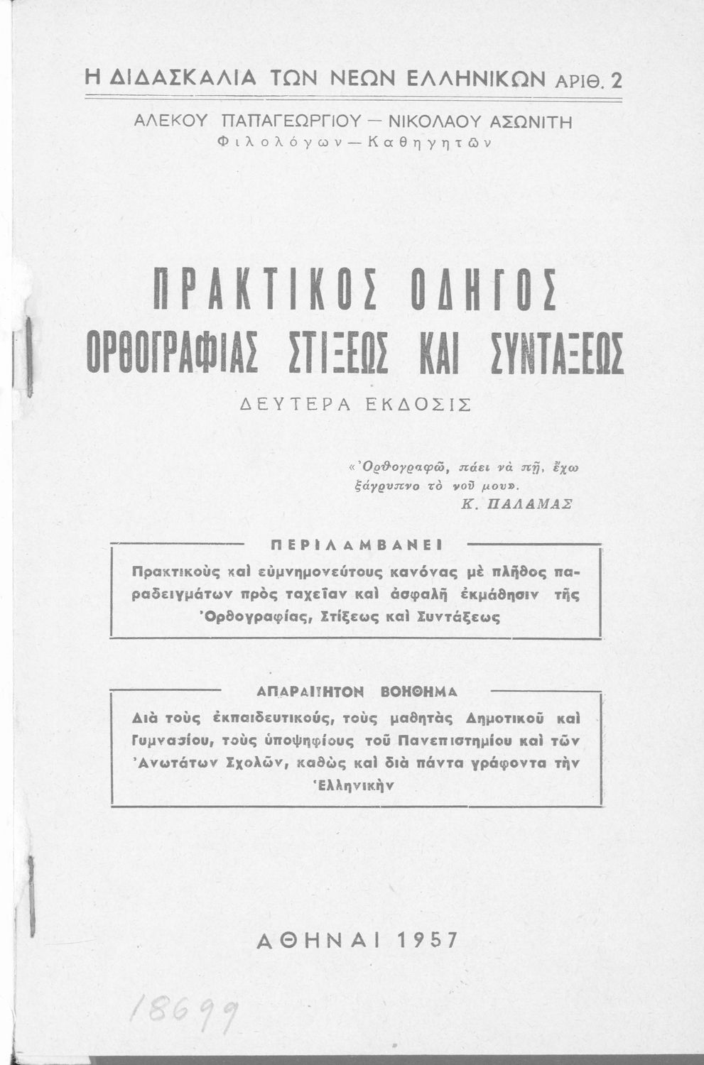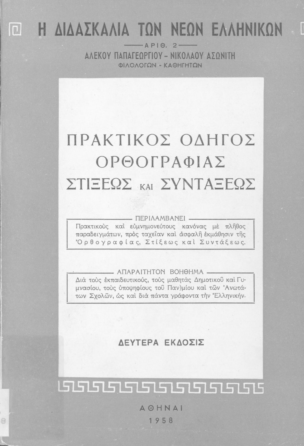Πρακτικός οδηγός ορθογραφίας στίξεως και συντάξεως : απαραίτητον βοήθημα δια τους εκπαιδευτικούς, τους μαθητάς Δημοτικού και Γυμνασίου, τους υποψηφίους του πανεπιστημίου και των ανωτάτων σχολών, καθώς και δια πάντα γράφοντα την ελληνικήν