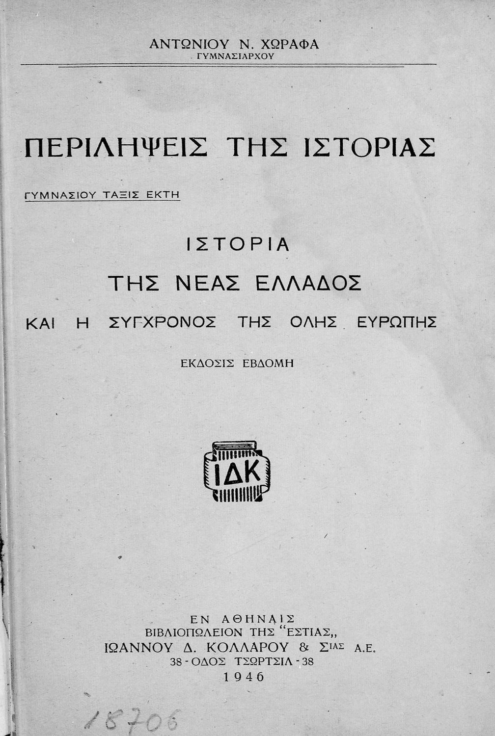 Τίτλος: Περιλήψεις της ιστορίας. Ιστορία της νέας Ελλάδος και η σύγχρονος της όλης Ευρώπης. Γυμνασίου Τάξις Έκτη