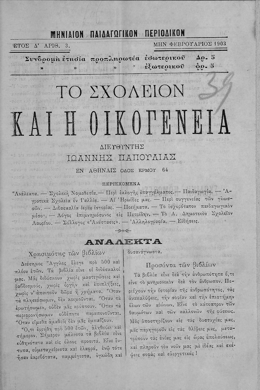 Περιέχει τα τεύχη του μηνιαίου παιδαγωγικού περιοδικού Το Σχολείον και η Οικογένεια που εκδόθηκαν από το Νοέμβριο του 1899 ως τον Οκτώβριο του 1903.