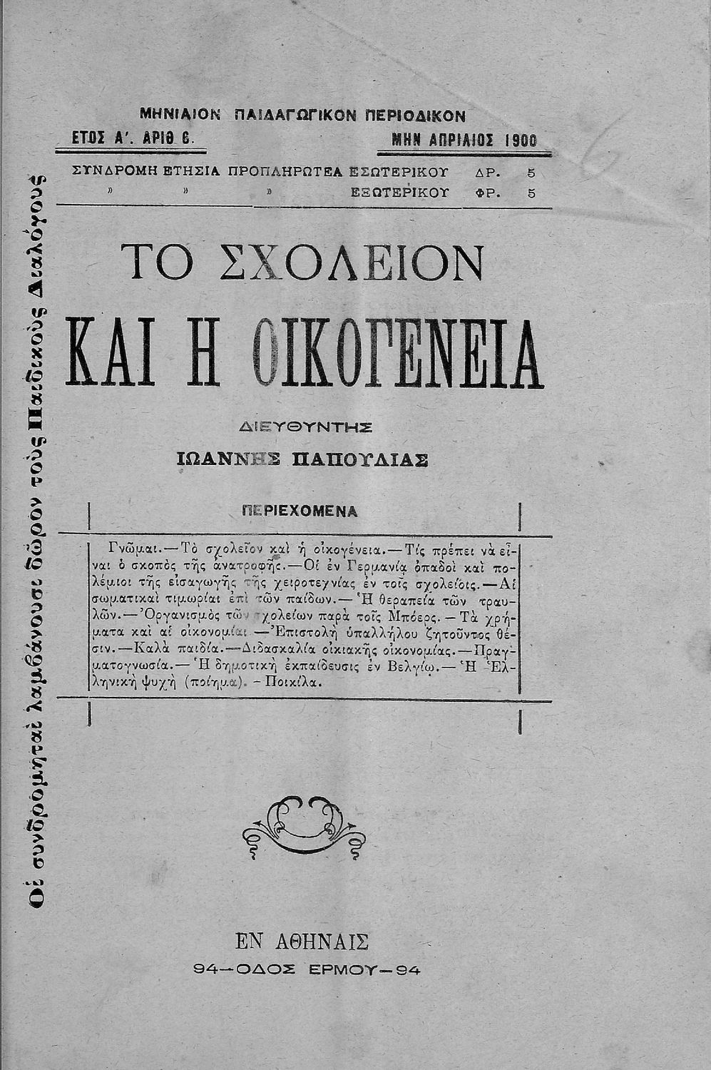 Περιέχει τα τεύχη του μηνιαίου παιδαγωγικού περιοδικού Το Σχολείον και η Οικογένεια που εκδόθηκαν από το Νοέμβριο του 1899 ως τον Οκτώβριο του 1903.