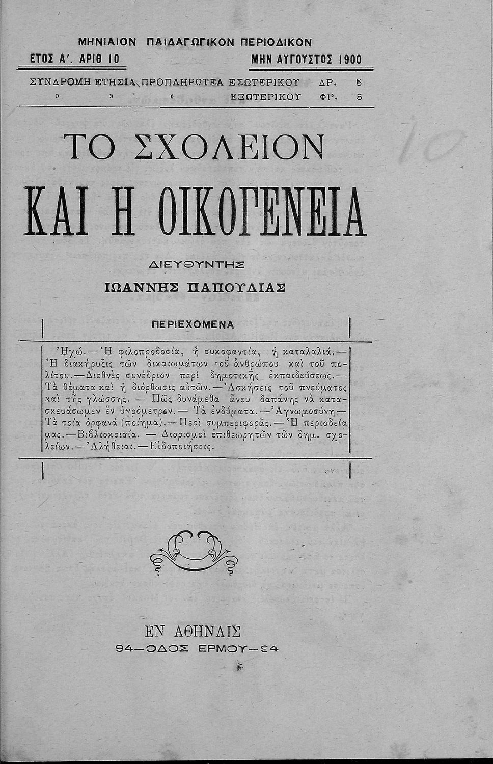 Παρουσίαση περιεχομένου: Περιέχει τα τεύχη του μηνιαίου παιδαγωγικού περιοδικού Το Σχολείον και η Οικογένεια που εκδόθηκαν από το Νοέμβριο του 1899 ως τον Οκτώβριο του 1903.