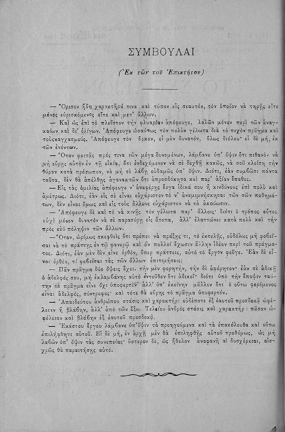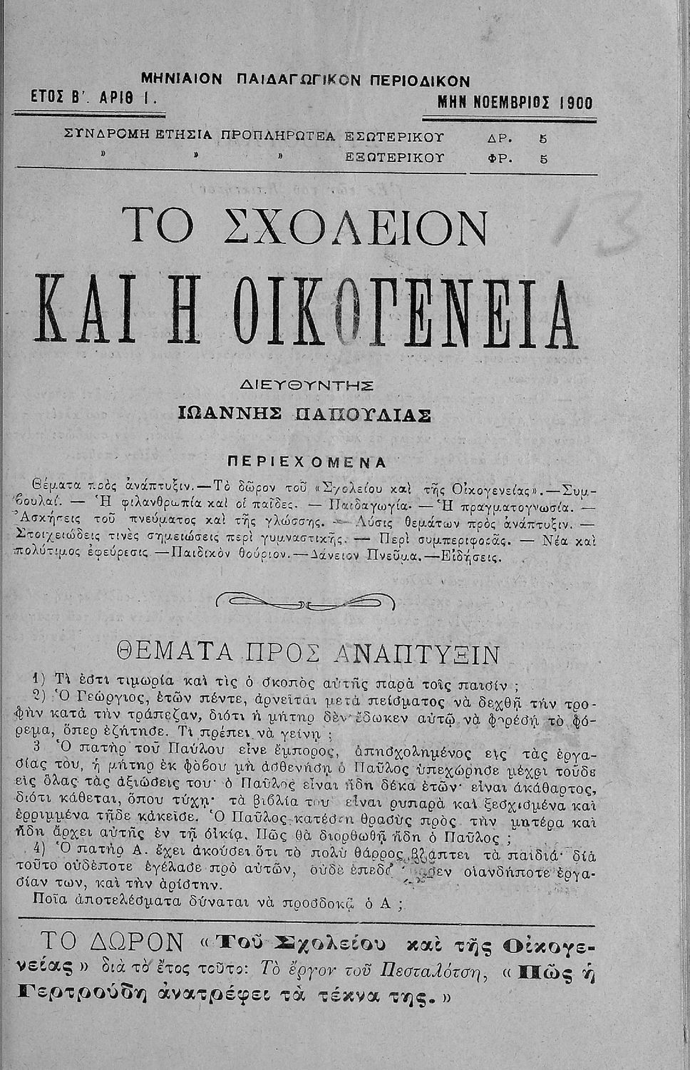 Περιέχει τα τεύχη του μηνιαίου παιδαγωγικού περιοδικού Το Σχολείον και η Οικογένεια που εκδόθηκαν από το Νοέμβριο του 1899 ως τον Οκτώβριο του 1903.