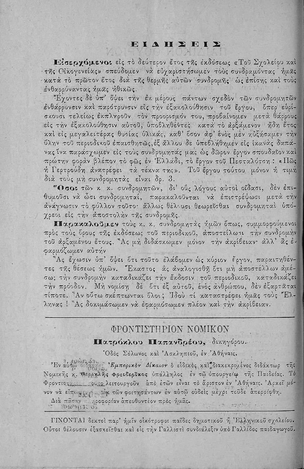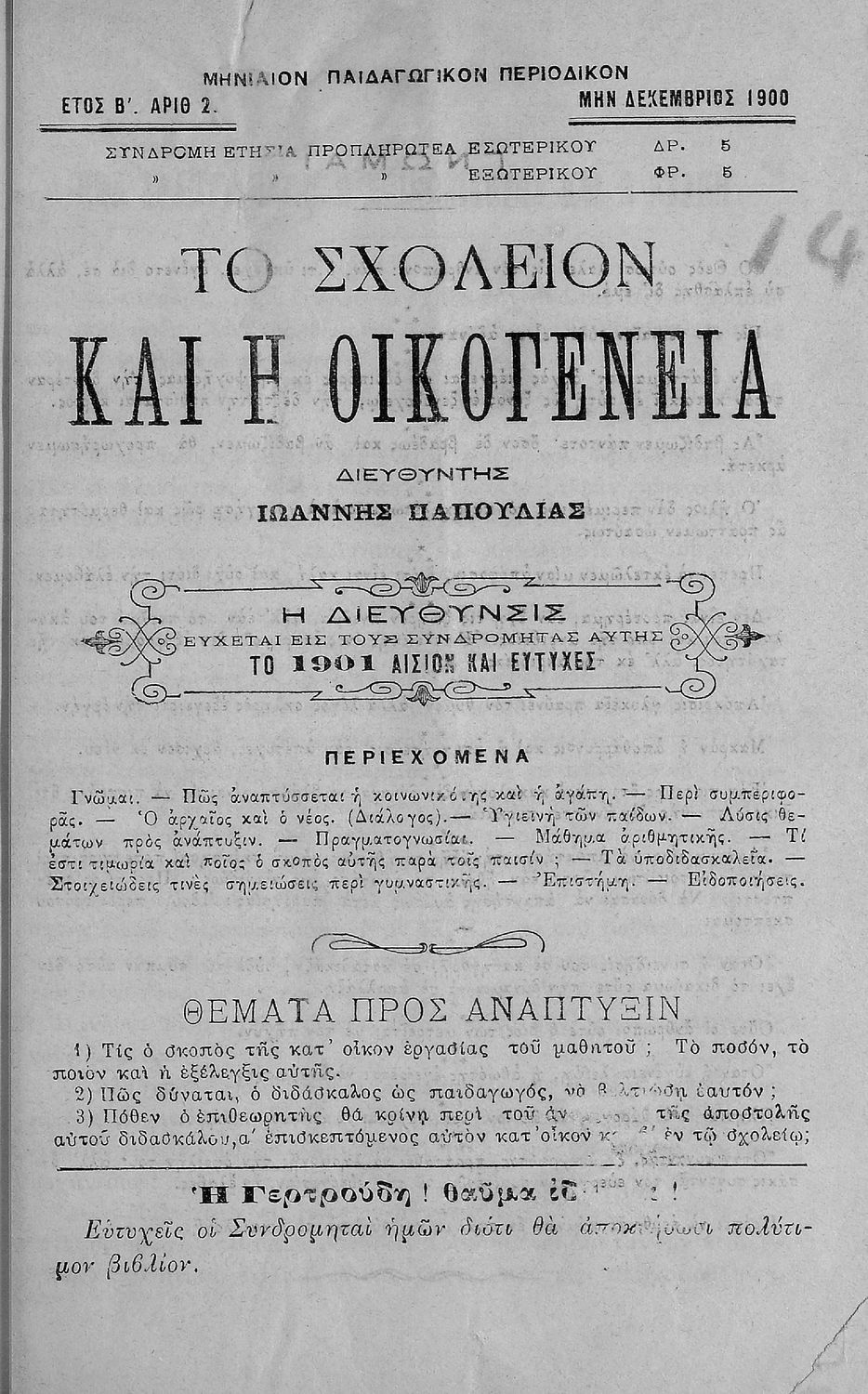 Περιέχει τα τεύχη του μηνιαίου παιδαγωγικού περιοδικού Το Σχολείον και η Οικογένεια που εκδόθηκαν από το Νοέμβριο του 1899 ως τον Οκτώβριο του 1903.