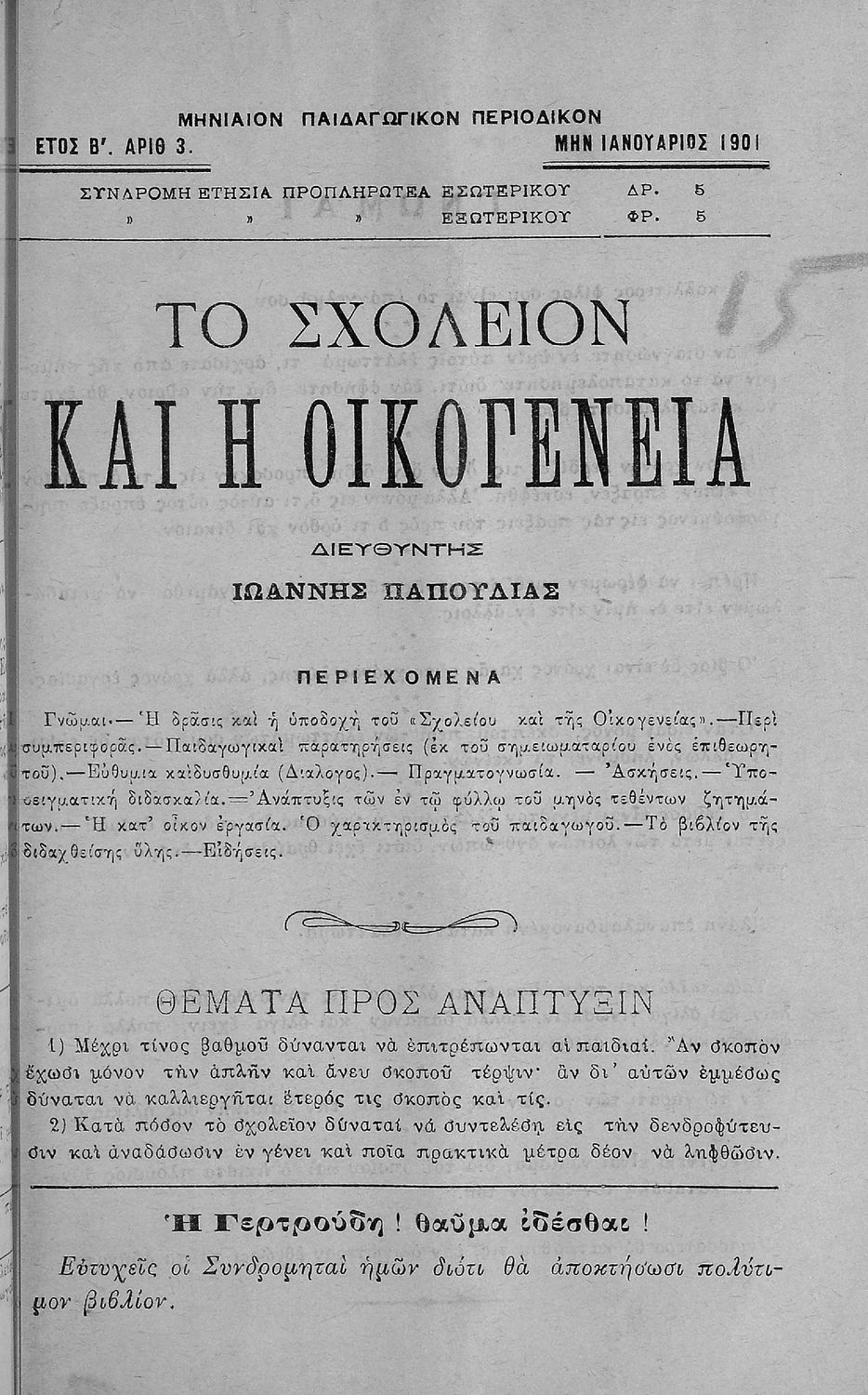 Παρουσίαση περιεχομένου: Περιέχει τα τεύχη του μηνιαίου παιδαγωγικού περιοδικού Το Σχολείον και η Οικογένεια που εκδόθηκαν από το Νοέμβριο του 1899 ως τον Οκτώβριο του 1903.