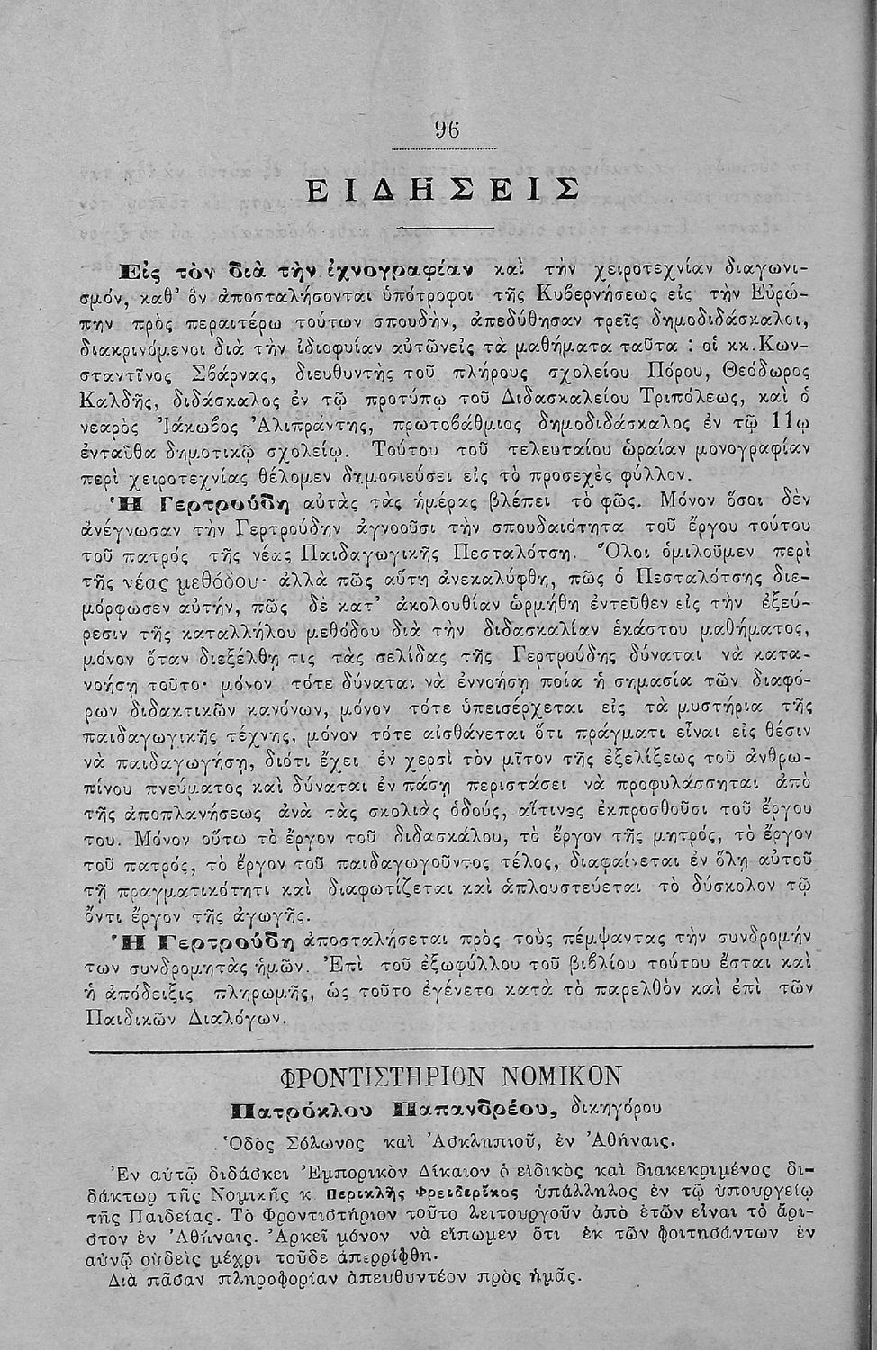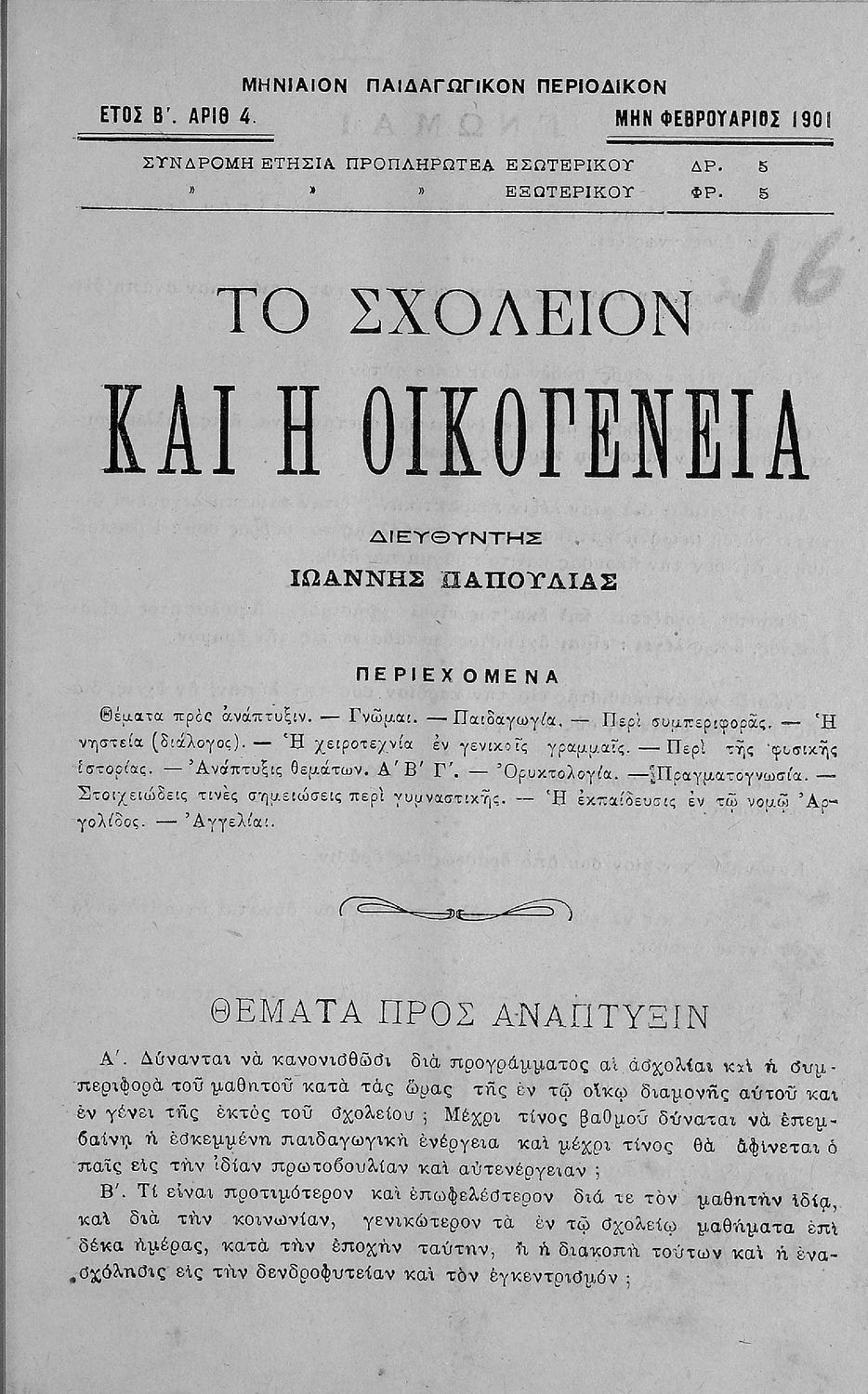 Περιέχει τα τεύχη του μηνιαίου παιδαγωγικού περιοδικού Το Σχολείον και η Οικογένεια που εκδόθηκαν από το Νοέμβριο του 1899 ως τον Οκτώβριο του 1903.