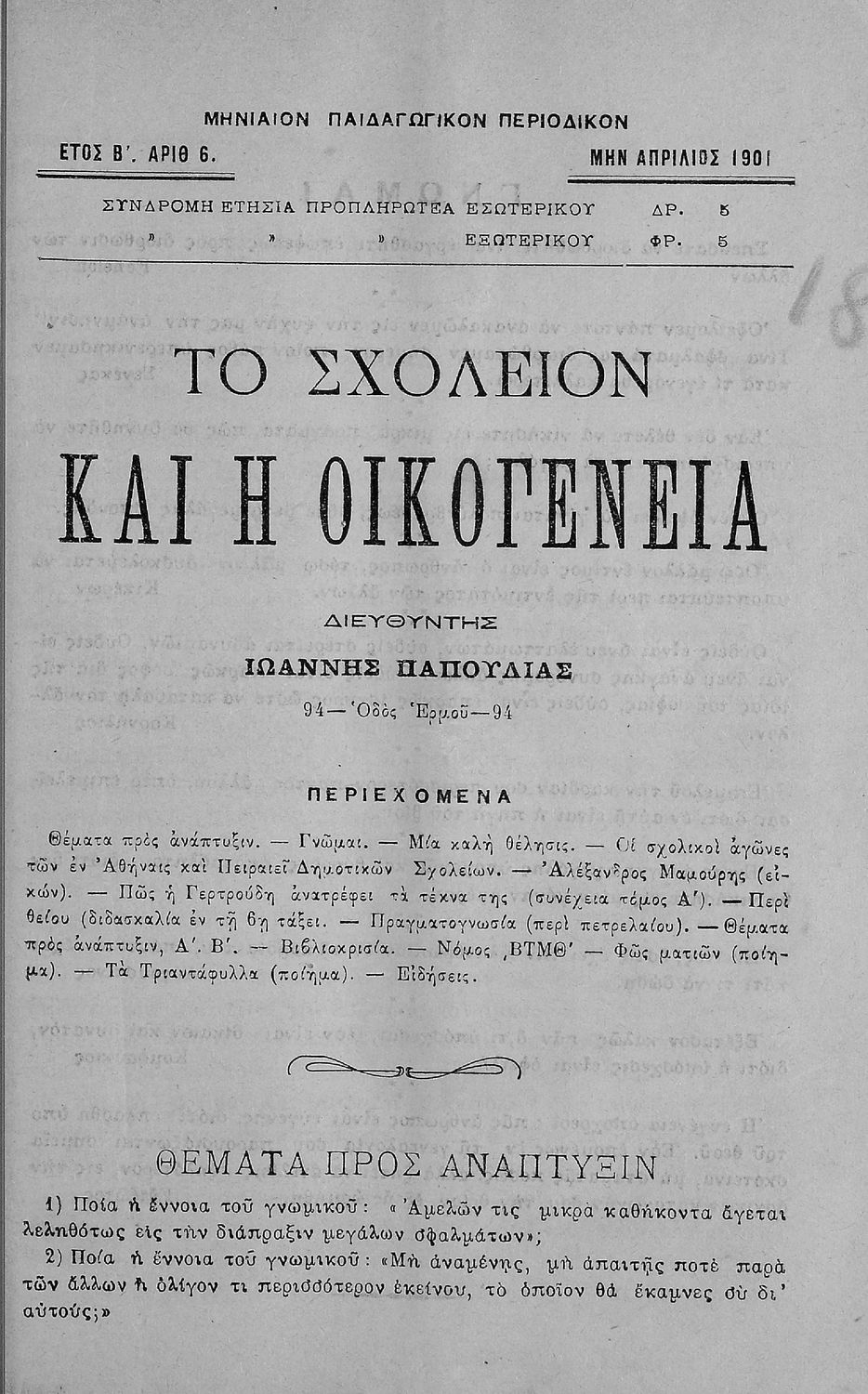 Περιέχει τα τεύχη του μηνιαίου παιδαγωγικού περιοδικού Το Σχολείον και η Οικογένεια που εκδόθηκαν από το Νοέμβριο του 1899 ως τον Οκτώβριο του 1903.