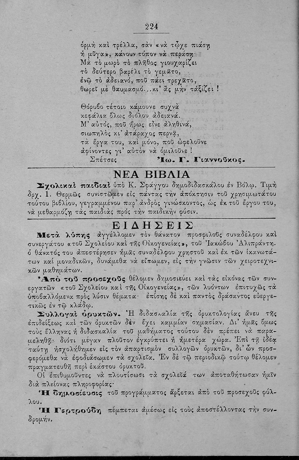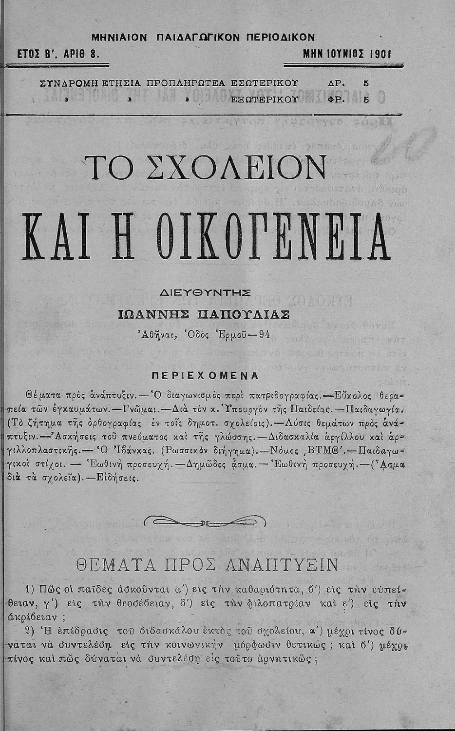 Παρουσίαση περιεχομένου: Περιέχει τα τεύχη του μηνιαίου παιδαγωγικού περιοδικού Το Σχολείον και η Οικογένεια που εκδόθηκαν από το Νοέμβριο του 1899 ως τον Οκτώβριο του 1903.