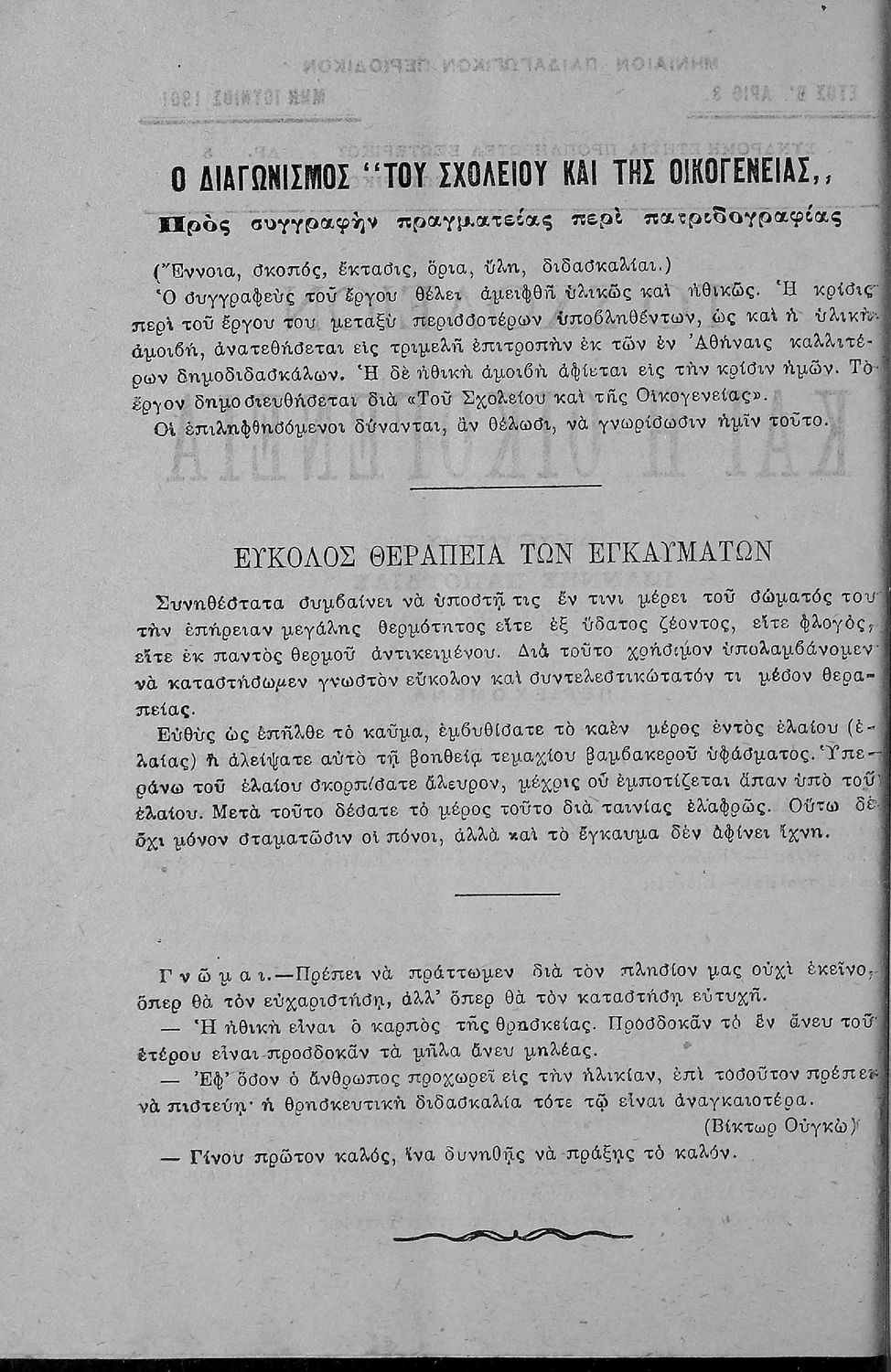 Περιέχει τα τεύχη του μηνιαίου παιδαγωγικού περιοδικού Το Σχολείον και η Οικογένεια που εκδόθηκαν από το Νοέμβριο του 1899 ως τον Οκτώβριο του 1903.