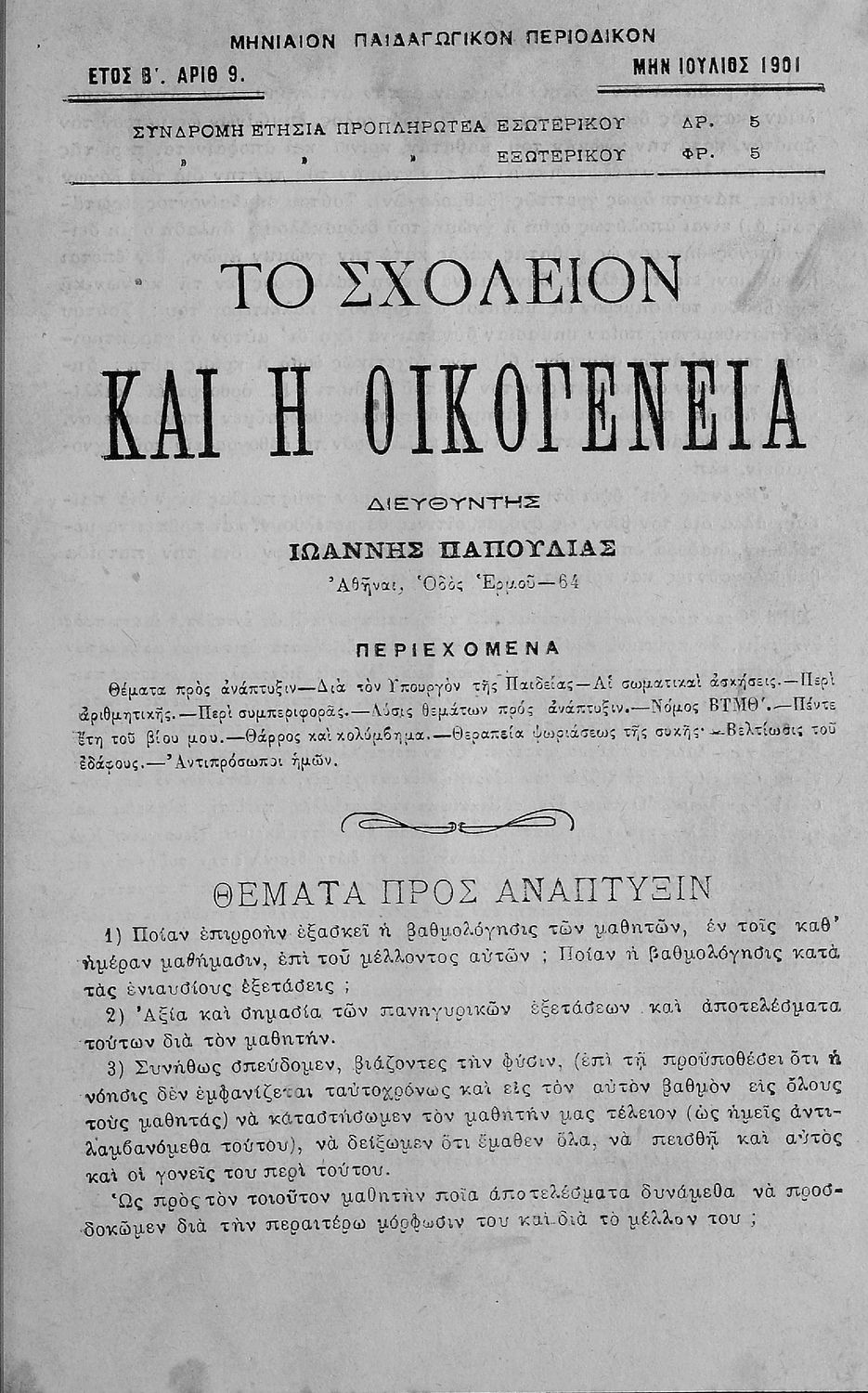 Παρουσίαση περιεχομένου: Περιέχει τα τεύχη του μηνιαίου παιδαγωγικού περιοδικού Το Σχολείον και η Οικογένεια που εκδόθηκαν από το Νοέμβριο του 1899 ως τον Οκτώβριο του 1903.