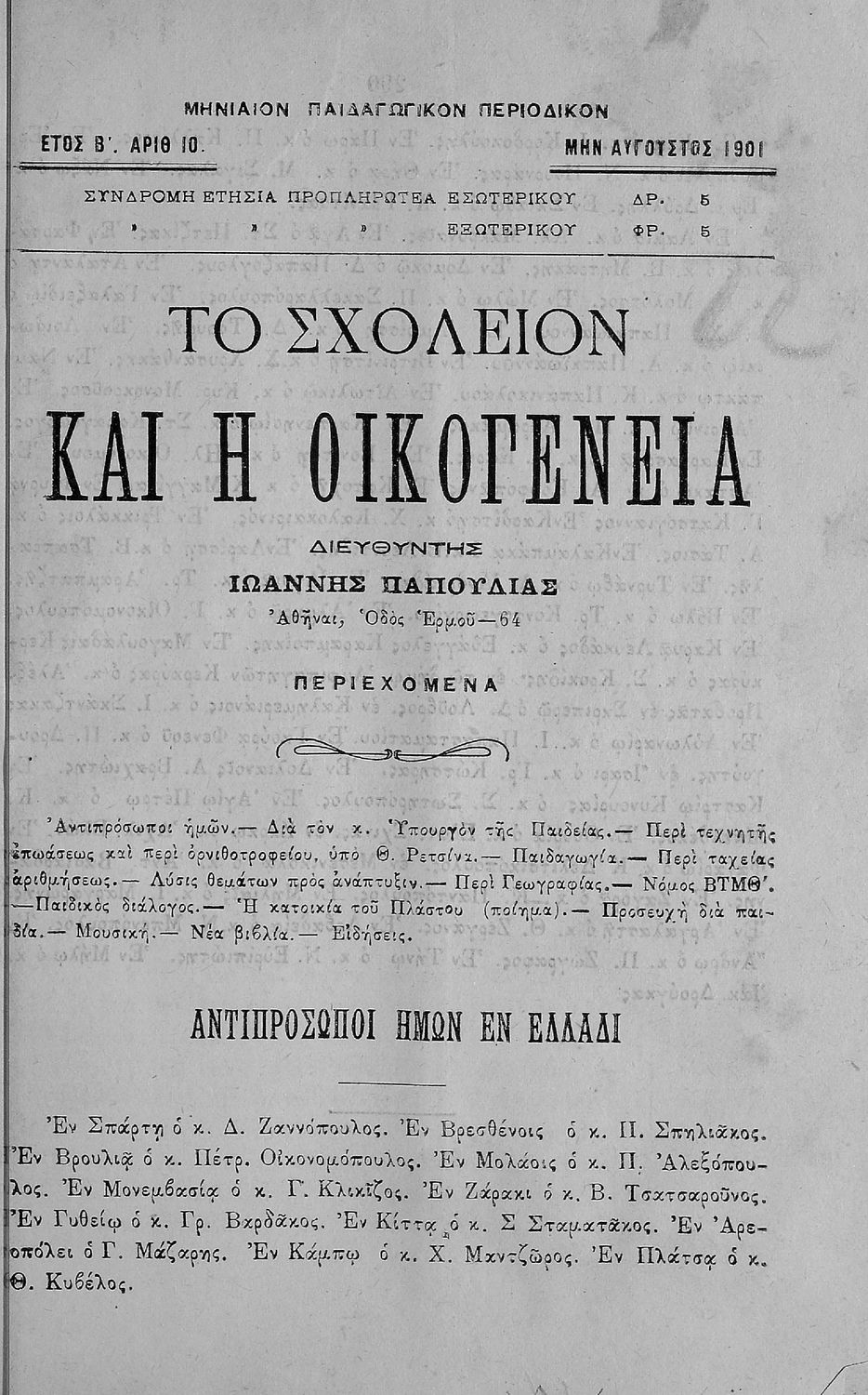 Παρουσίαση περιεχομένου: Περιέχει τα τεύχη του μηνιαίου παιδαγωγικού περιοδικού Το Σχολείον και η Οικογένεια που εκδόθηκαν από το Νοέμβριο του 1899 ως τον Οκτώβριο του 1903.