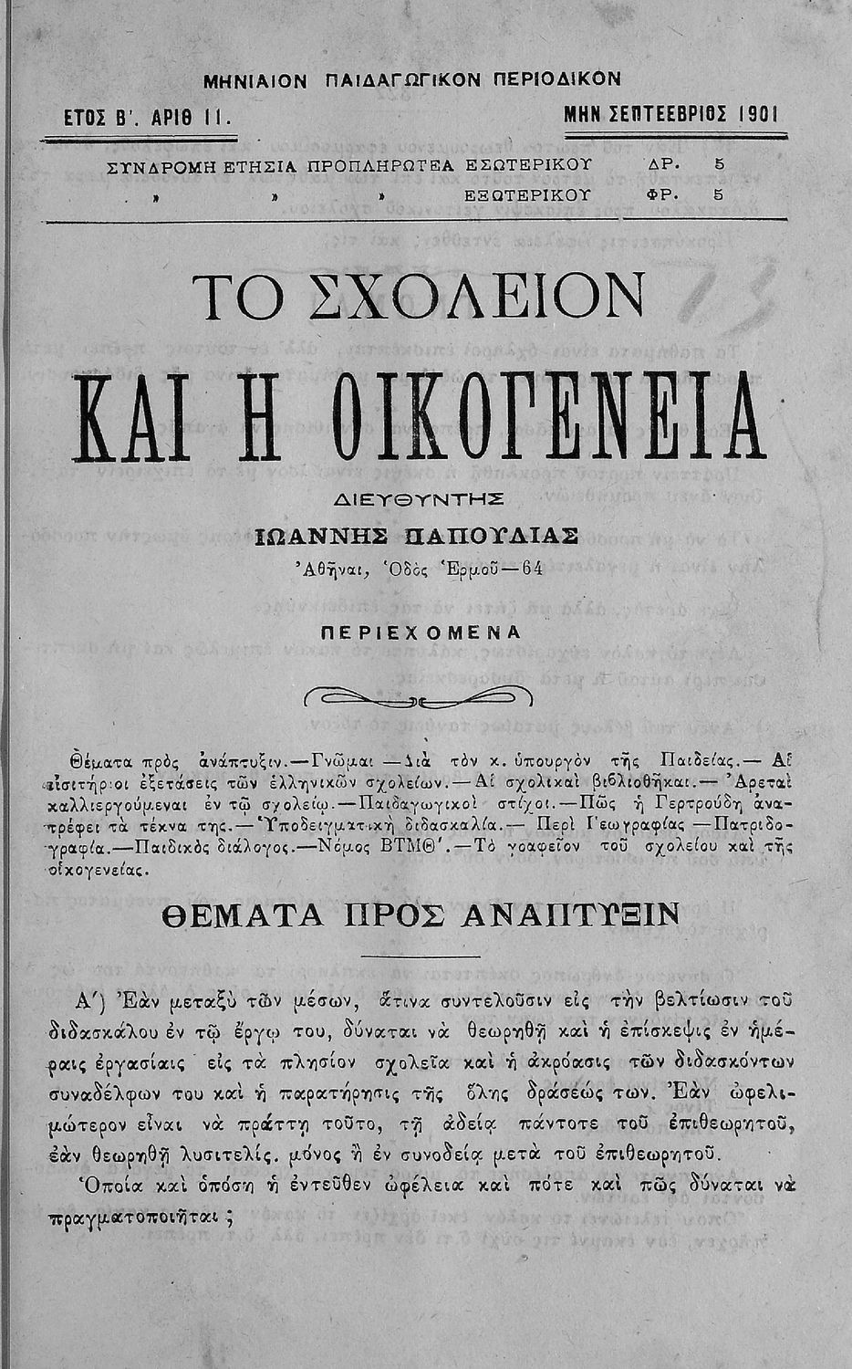 Παρουσίαση περιεχομένου: Περιέχει τα τεύχη του μηνιαίου παιδαγωγικού περιοδικού Το Σχολείον και η Οικογένεια που εκδόθηκαν από το Νοέμβριο του 1899 ως τον Οκτώβριο του 1903.