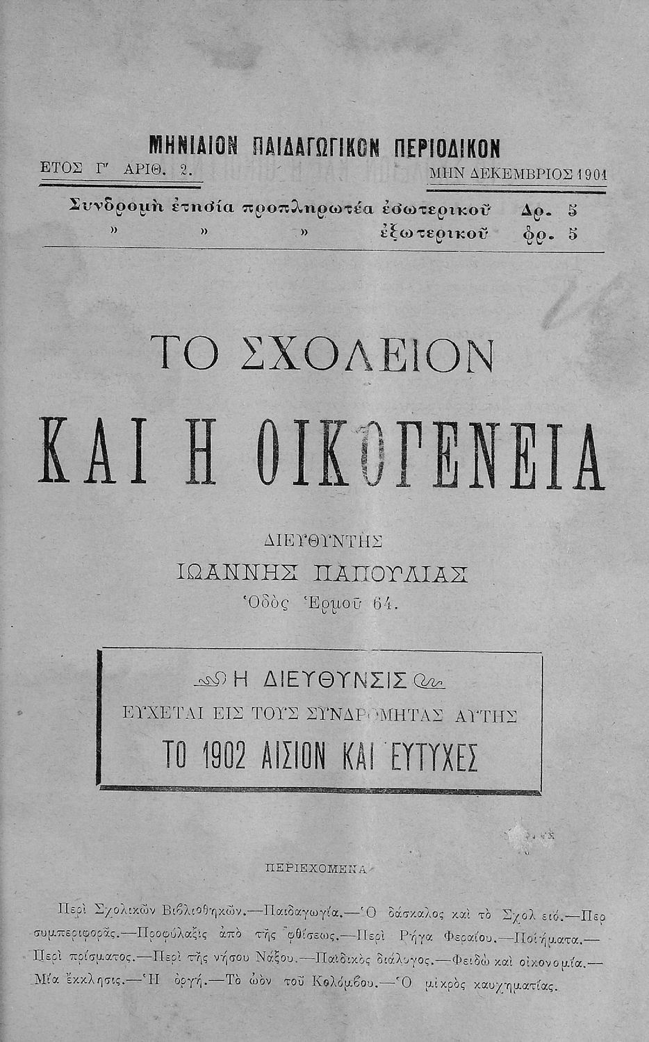 Παρουσίαση περιεχομένου: Περιέχει τα τεύχη του μηνιαίου παιδαγωγικού περιοδικού Το Σχολείον και η Οικογένεια που εκδόθηκαν από το Νοέμβριο του 1899 ως τον Οκτώβριο του 1903.
