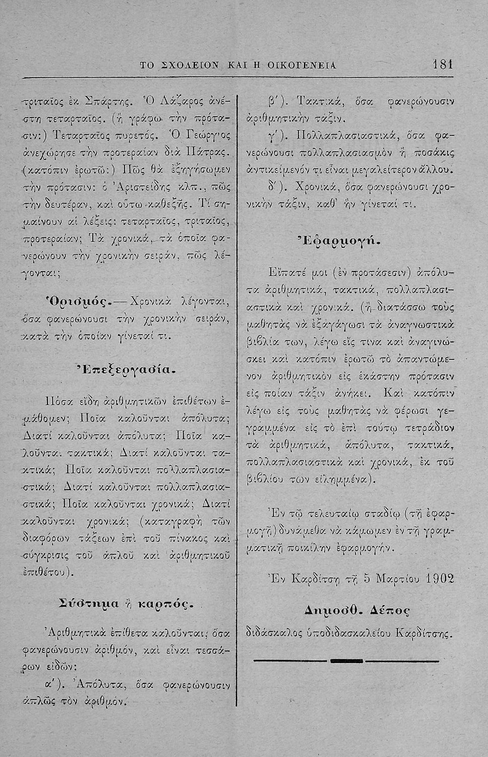Τάξη:  Γ' Ελληνικού Σχολείου / Α' Αστικού Σχολείου Θηλέων