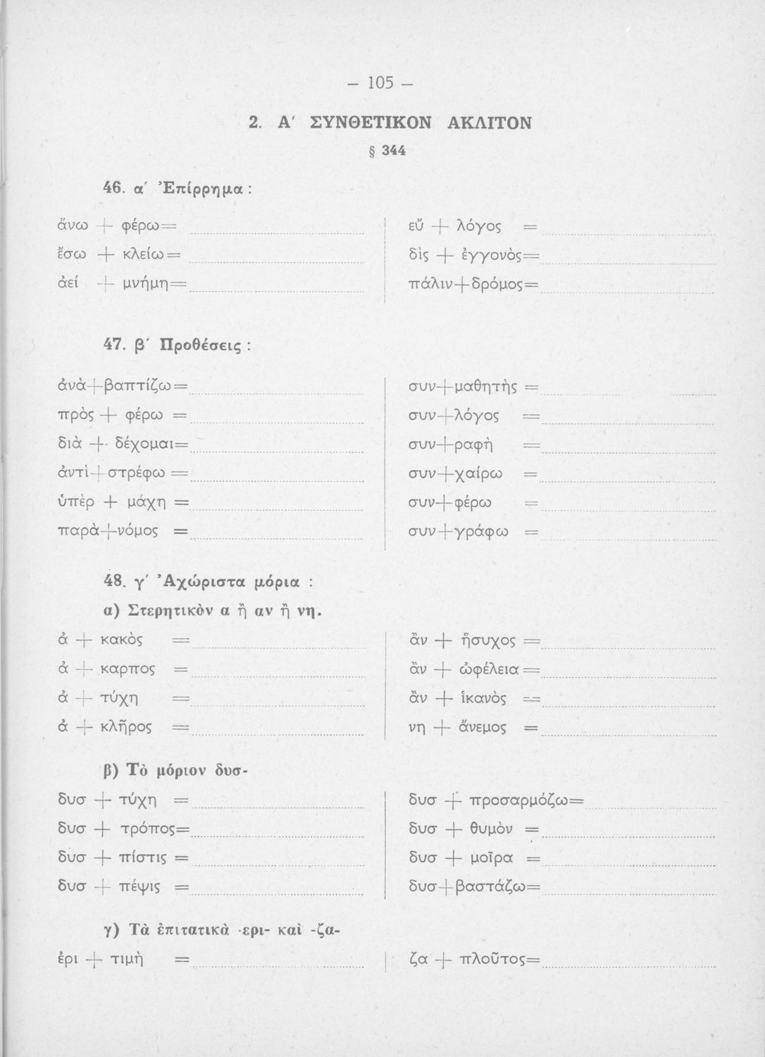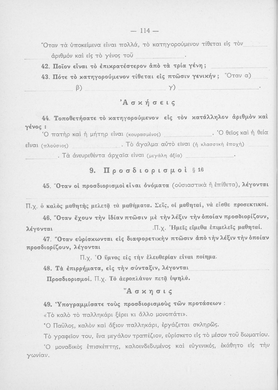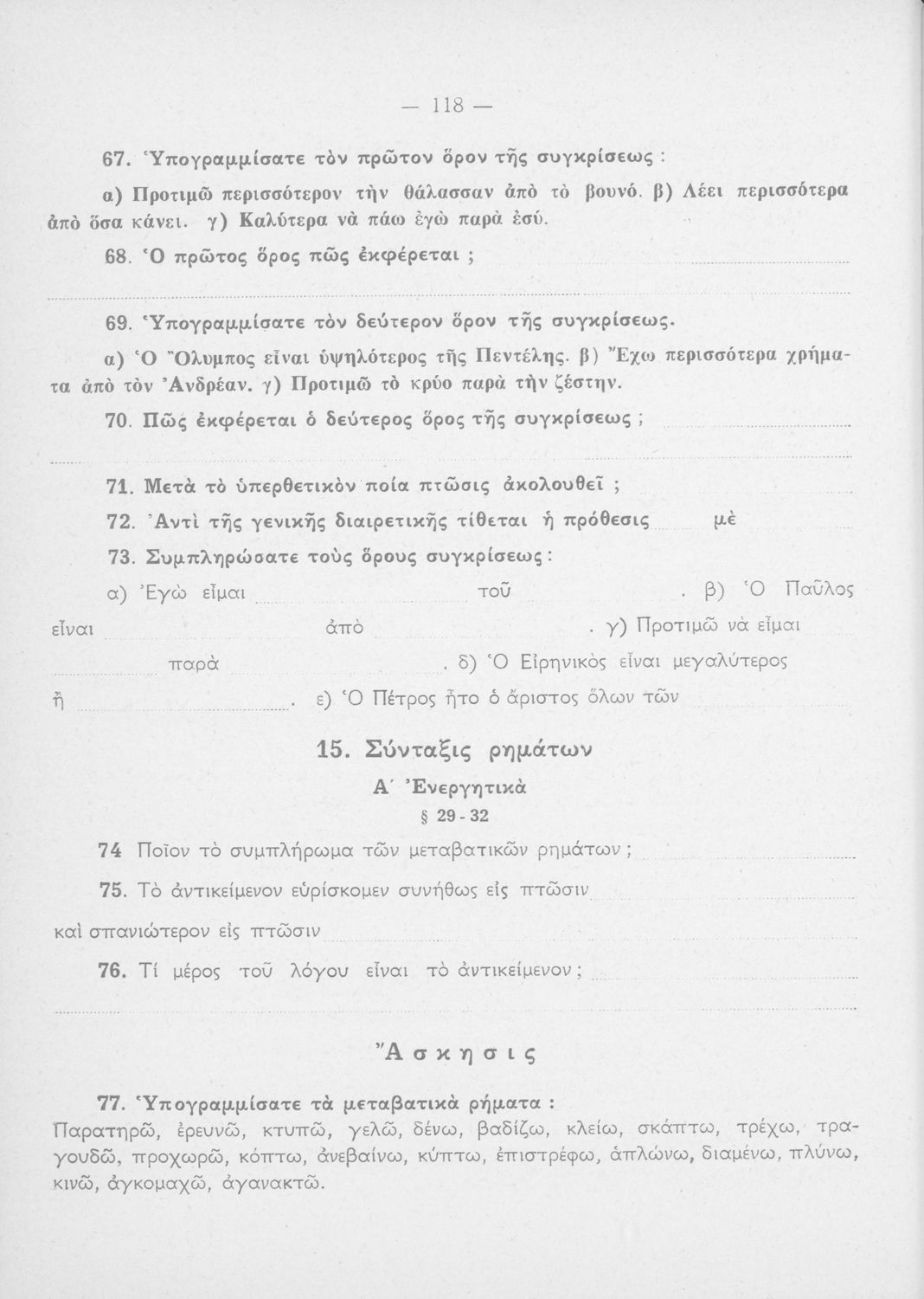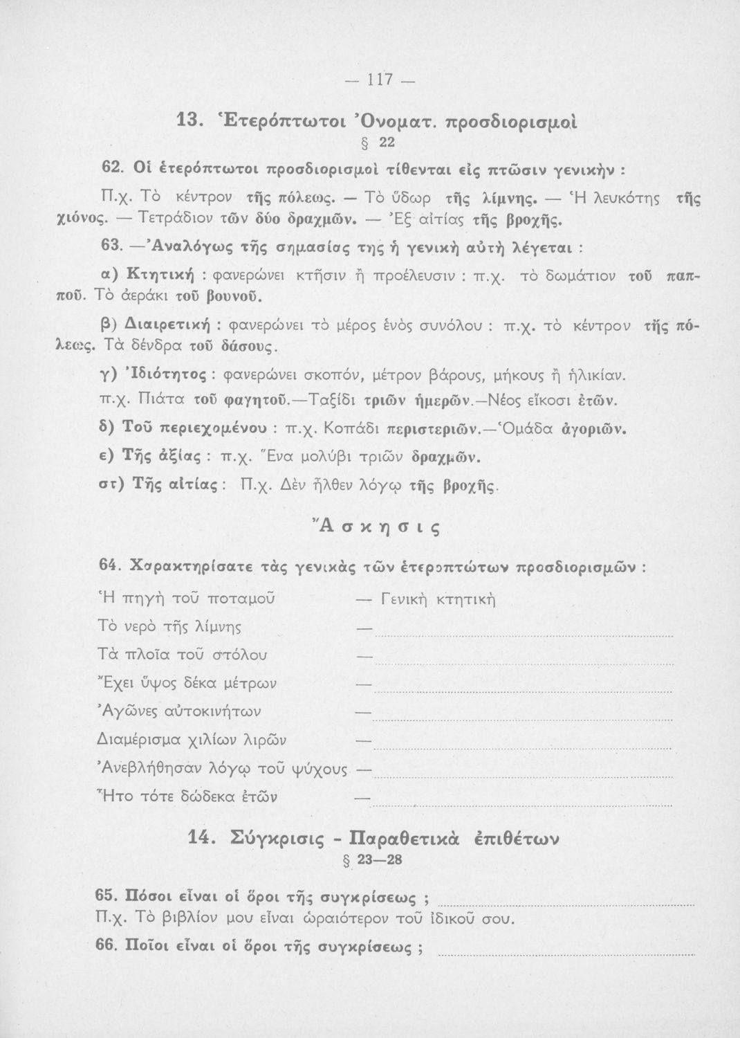 Κωδικός αναγνώρισης: 01-18710 Τίτλος: Γραμματικαί ασκήσεις της ελληνικής γλώσσης προς χρήσιν των μαθητών των ανωτέρων τάξεων του Δημοτικού Σχολείου Συγγραφέας: Ευθ. Αναγνωστόπουλος, Αργ. Καλογιάννης Μέγεθος και υπόστρωμα: Μαθητικό βοήθημα, μαλακό εξώφυλλο, 148 σελίδες. |