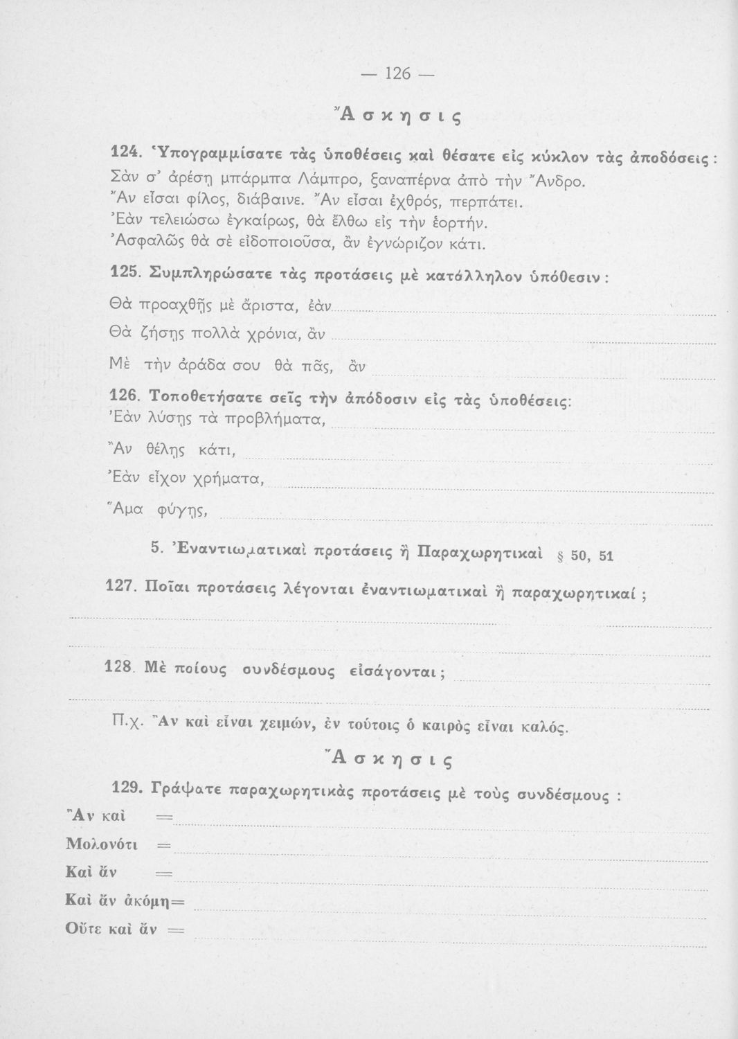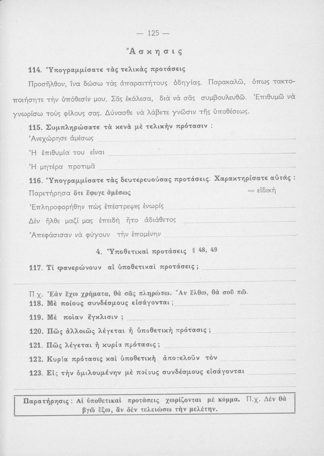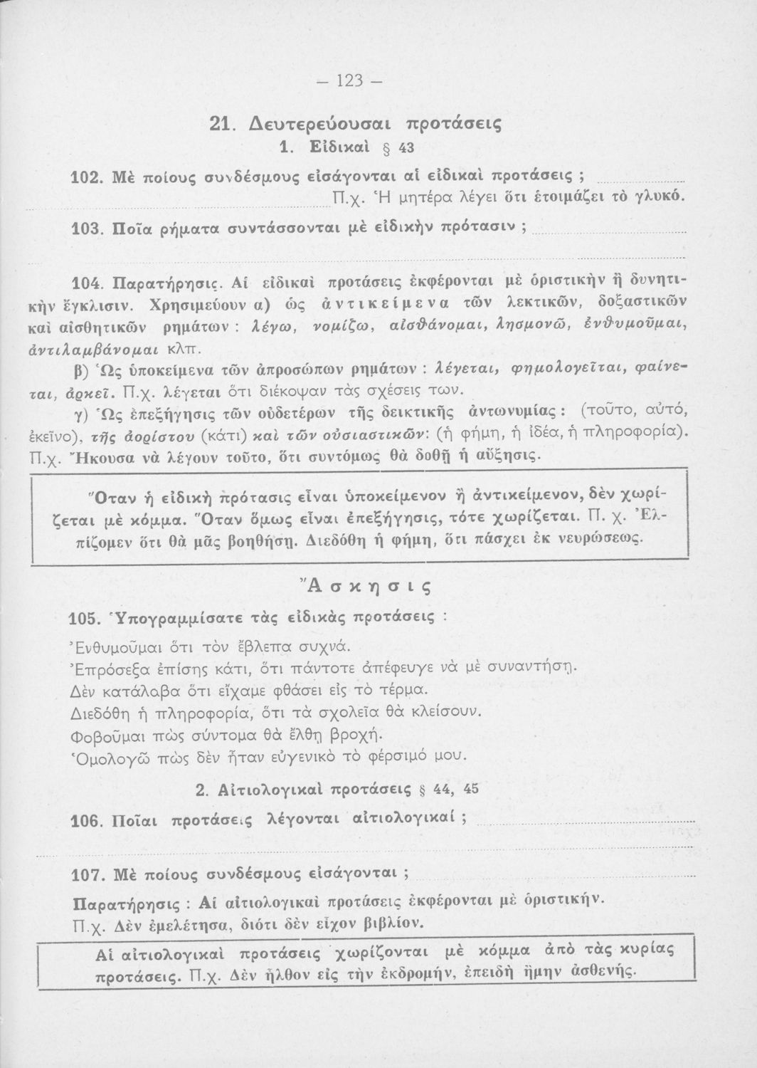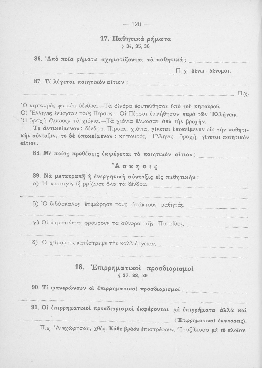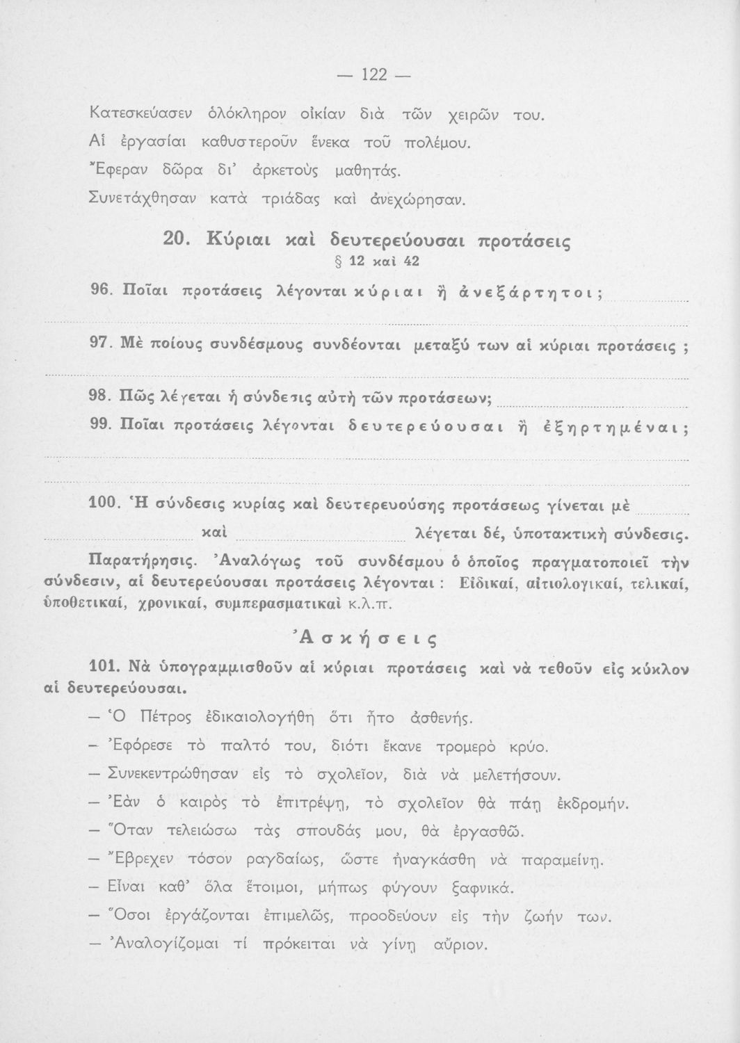 Κωδικός αναγνώρισης: 01-18710 Τίτλος: Γραμματικαί ασκήσεις της ελληνικής γλώσσης προς χρήσιν των μαθητών των ανωτέρων τάξεων του Δημοτικού Σχολείου Συγγραφέας: Ευθ. Αναγνωστόπουλος, Αργ. Καλογιάννης Μέγεθος και υπόστρωμα: Μαθητικό βοήθημα, μαλακό εξώφυλλο, 148 σελίδες. |