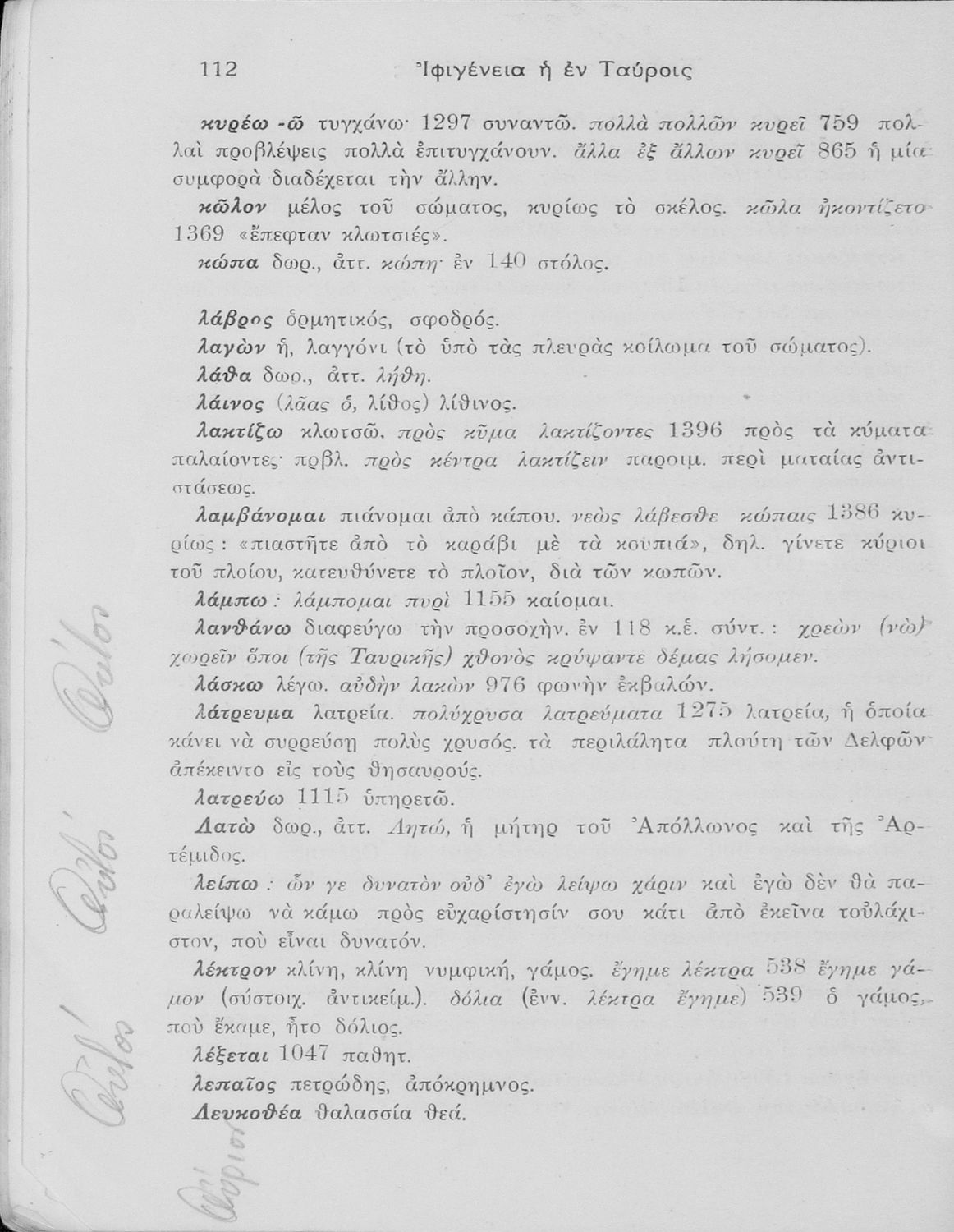 LDR 01232 2200193 4500 035 ## _a01-18711 040 ## _aΙνστιτούτο Εκπαιδευτικής Πολιτικής 041 ## _ael 100 ## _aΕυριπίδης _aΘρασύβουλος Σταύρου (σχόλια) 110 ## _a18711 245 0# _aΕυριπίδου Ιφιγένεια η εν Ταύροις δια την εβδόμην Τάξιν των Οκτατάξιων Γυμνασίων 260 ## _aΑθήνα _bΟργανισμός Εκδόσεως Σχολικών Βιβλίων _c1946 300 ## _a140 _bΣκίτσα (ασπρόμαυρα) 520 ## _aΣχολικό εγχειρίδιο Αρχαίων Ελληνικών Ζ' Γυμνασίου που περιέχει αποσπάσματα από την τραγωδία του Ευριπίδη Ιφιγένεια η εν Ταύροις, ερμηνευτικά και πραγματολογικά σχόλια και λεξιλογικές παρατηρήσεις. 521 ## _aΖ' Γυμνασίου 522 ## _aΕλλάδα 546 ## _aΑπλή καθαρεύουσα 563 ## _aΜαλακό Εξώφυλλο 650 #4 _aΔράμα _aΕυριπίδης _aΙφιγένεια _aΚάθαρση _aΟρέστης