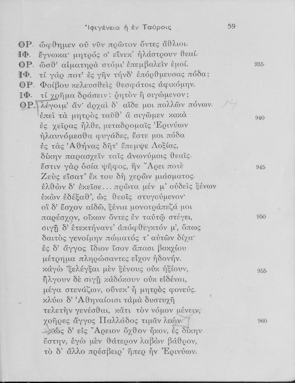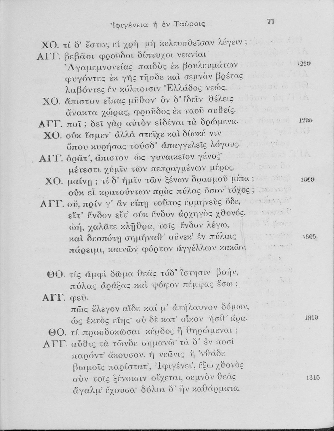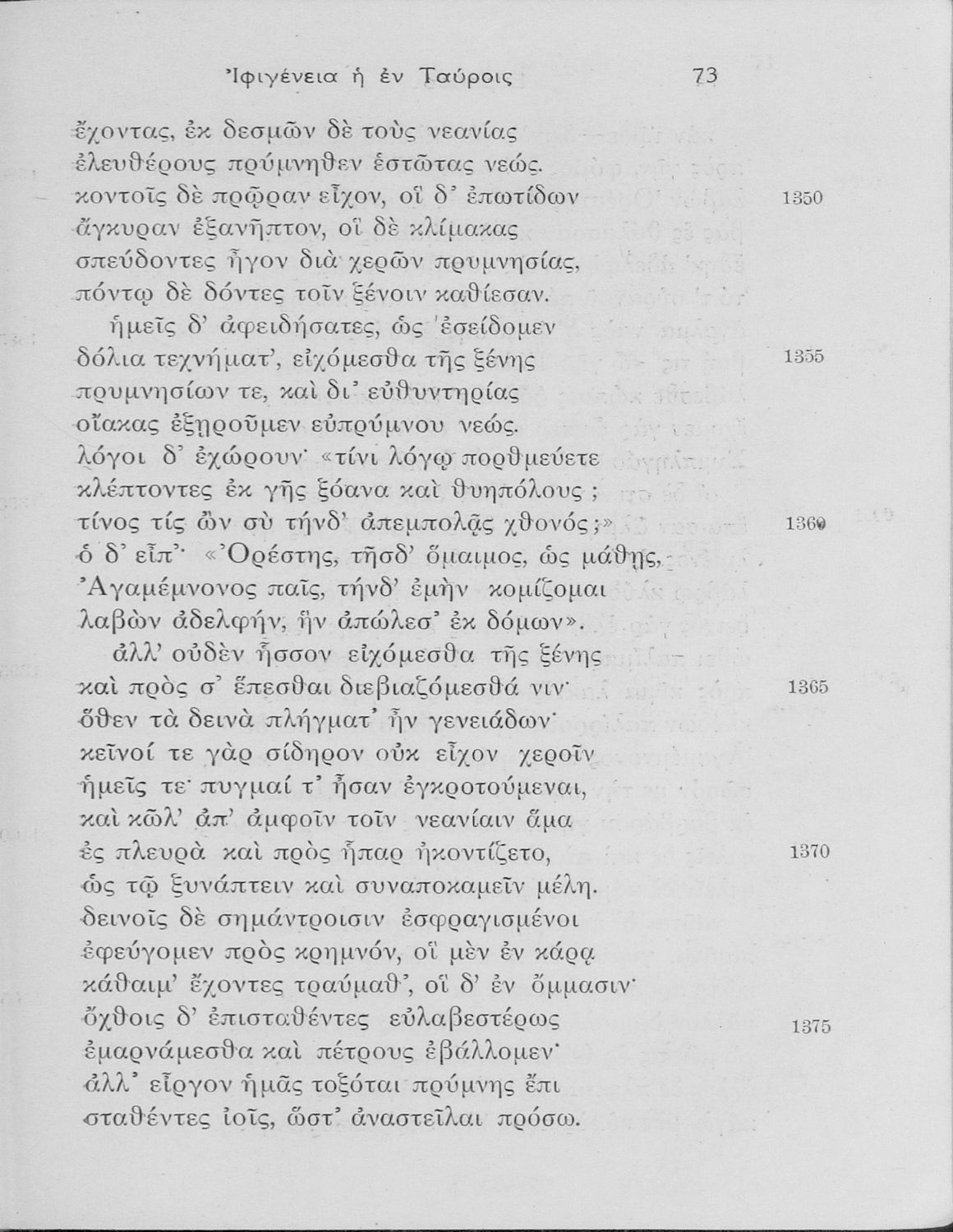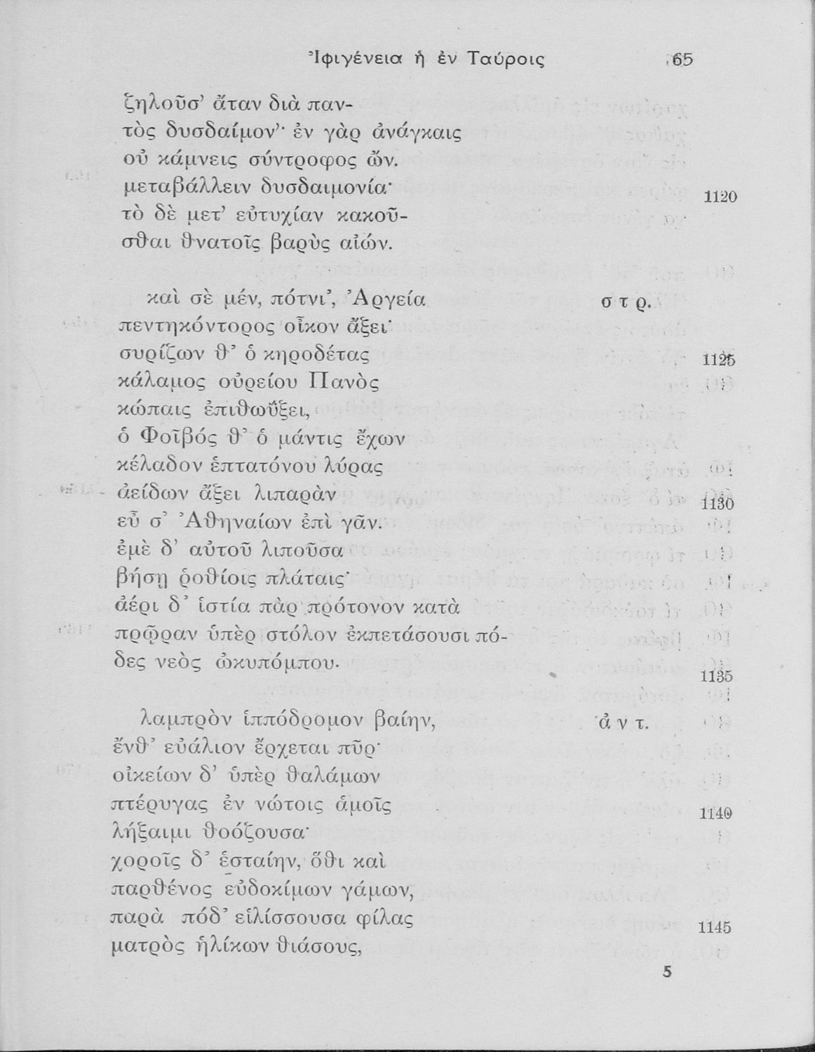 Σχολικό εγχειρίδιο Αρχαίων Ελληνικών Ε΄ Γυμνασίου που περιέχει αποσπάσματα από την τραγωδία του Ευριπίδη Ιφιγένεια η εν Ταύροις, ερμηνευτικά και πραγματολογικά σχόλια και λεξιλογικές παρατηρήσεις.