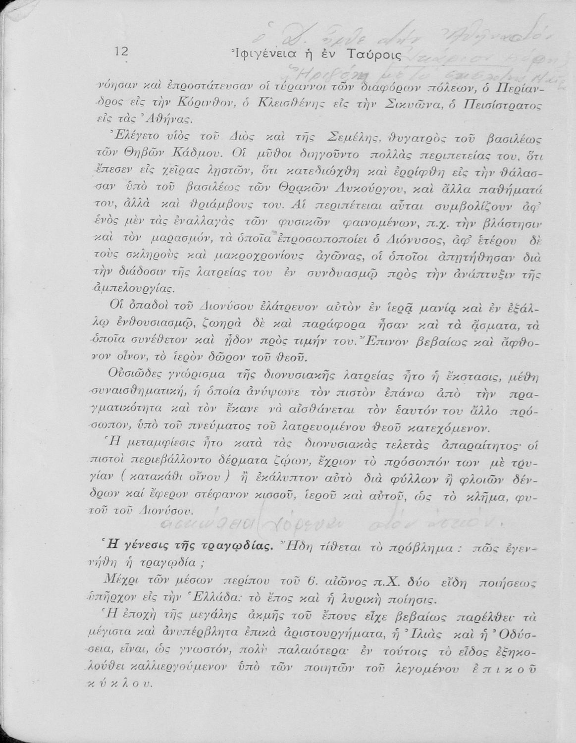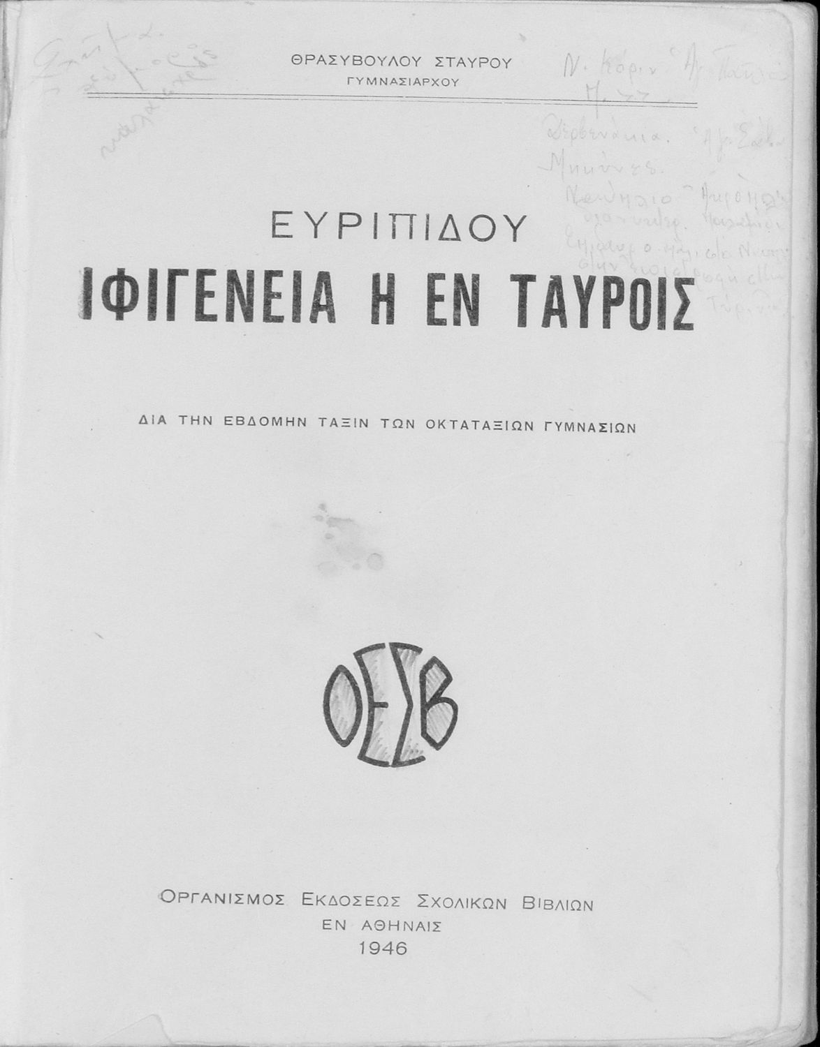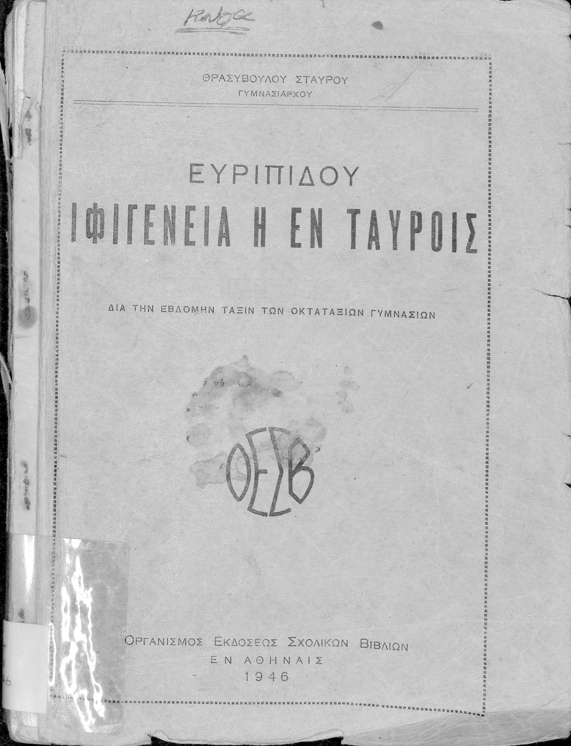 Σχολικό εγχειρίδιο Αρχαίων Ελληνικών Ζ' Γυμνασίου που περιέχει αποσπάσματα από την τραγωδία του Ευριπίδη Ιφιγένεια η εν Ταύροις, ερμηνευτικά και πραγματολογικά σχόλια και λεξιλογικές παρατηρήσεις.