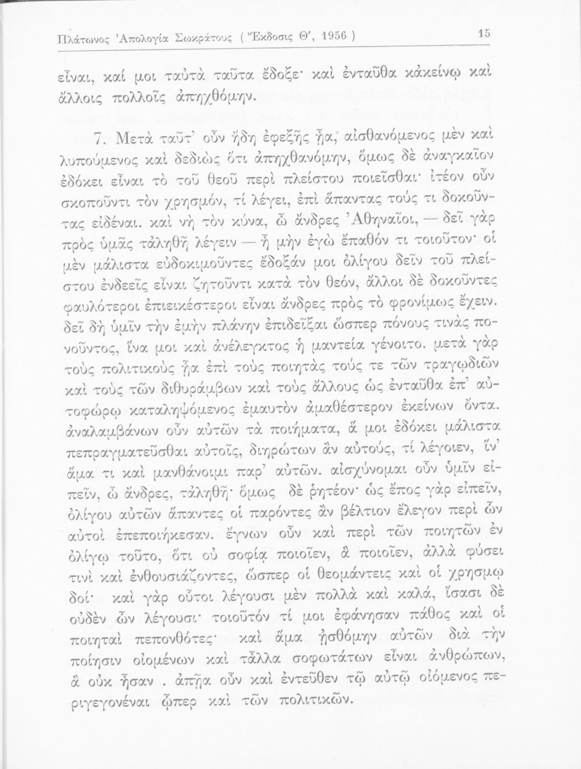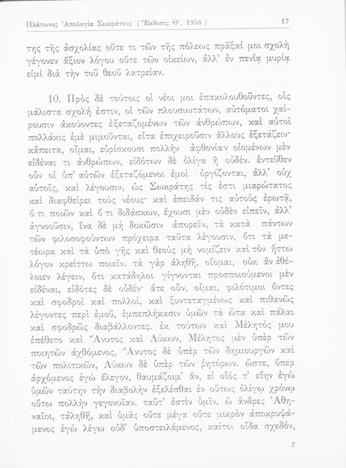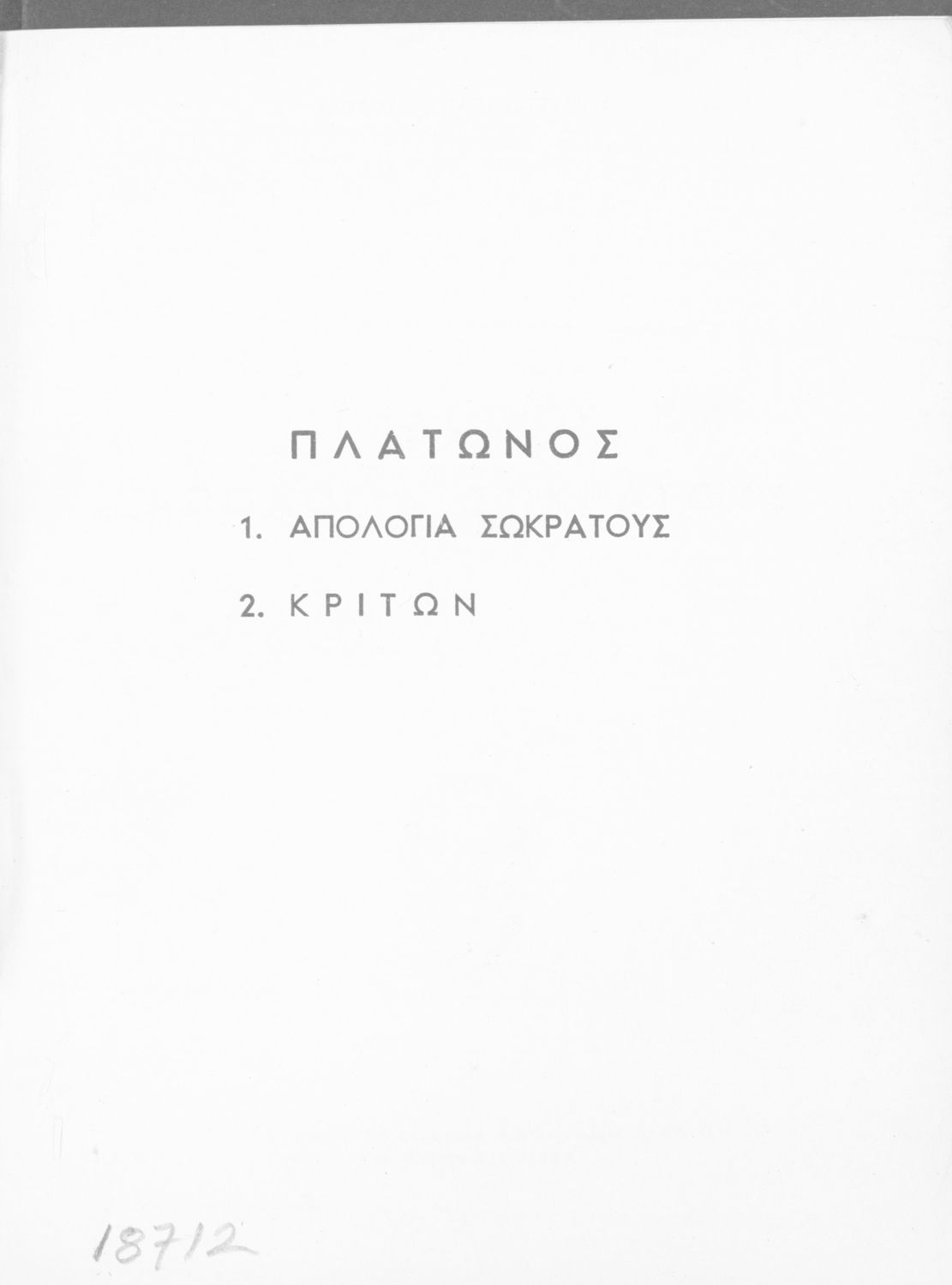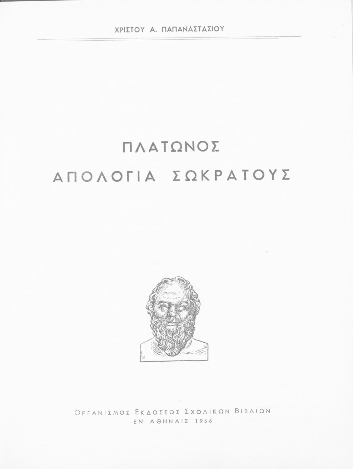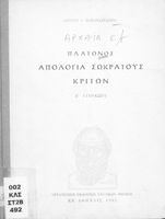 Σχολικό εγχειρίδιο Αρχαίων Ελληνικών Γυμνασίου που περιέχει τα έργα του Πλάτωνα Απολογία Σωκράτους και Κρίτων, ερμηνευτικά και πραγματολογικά σχόλια και λεξιλογικές παρατηρήσεις.