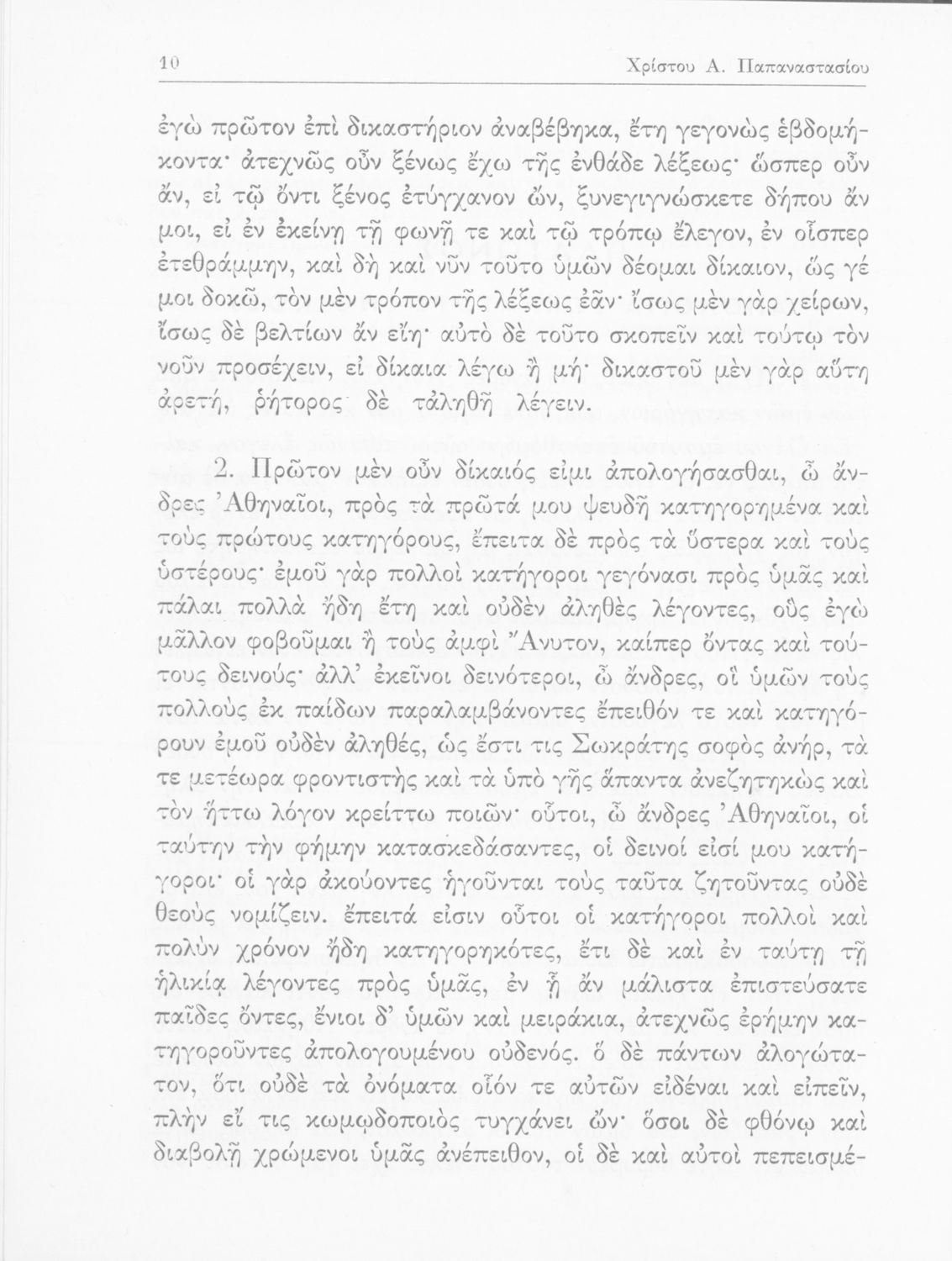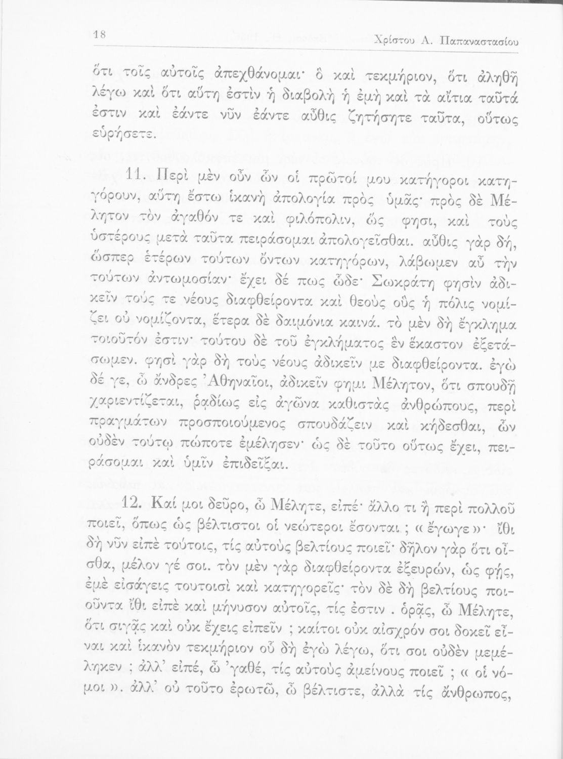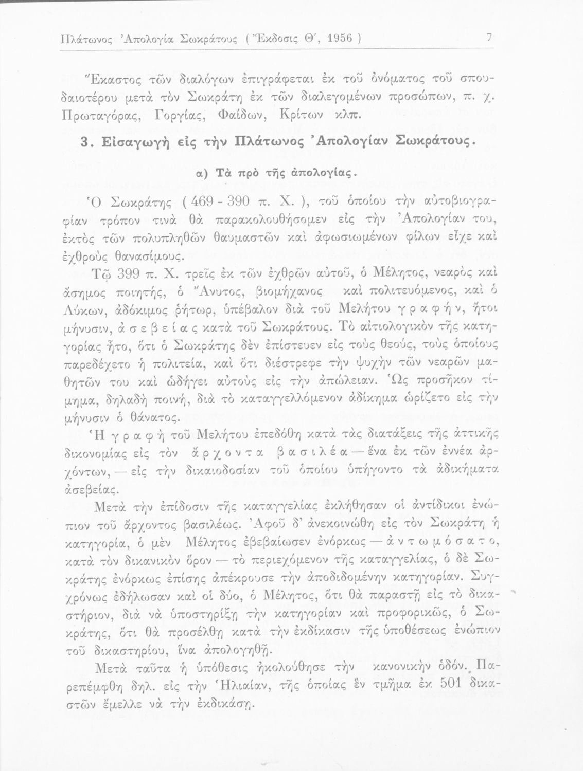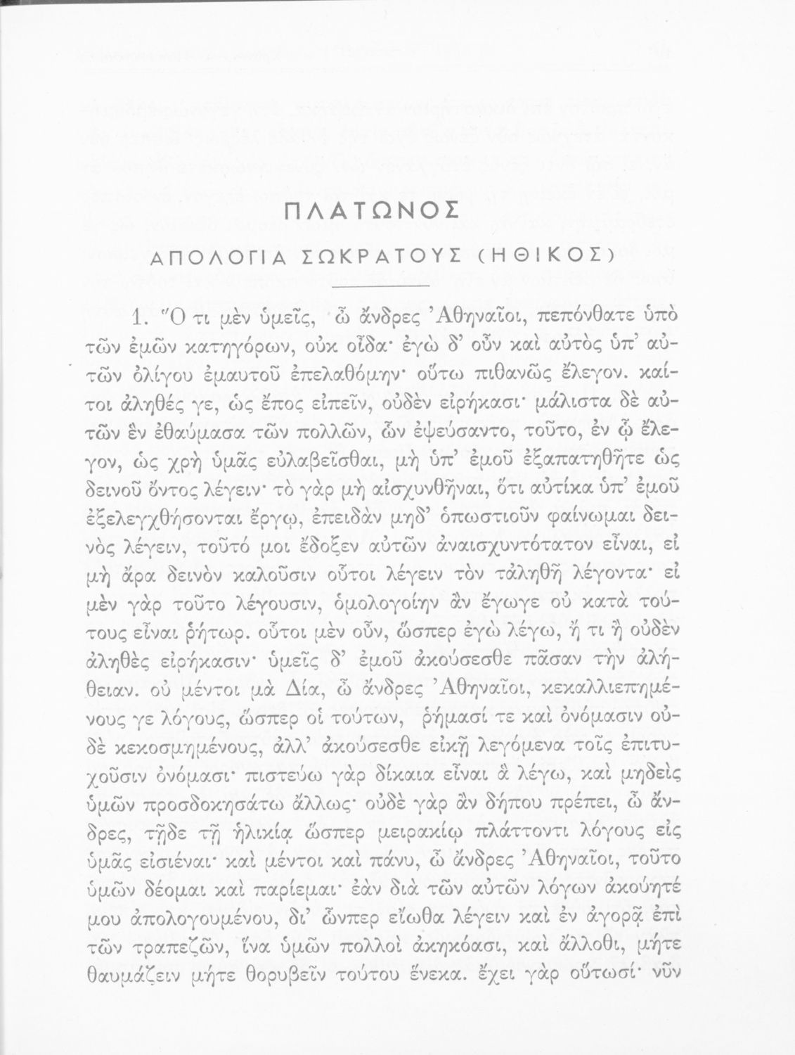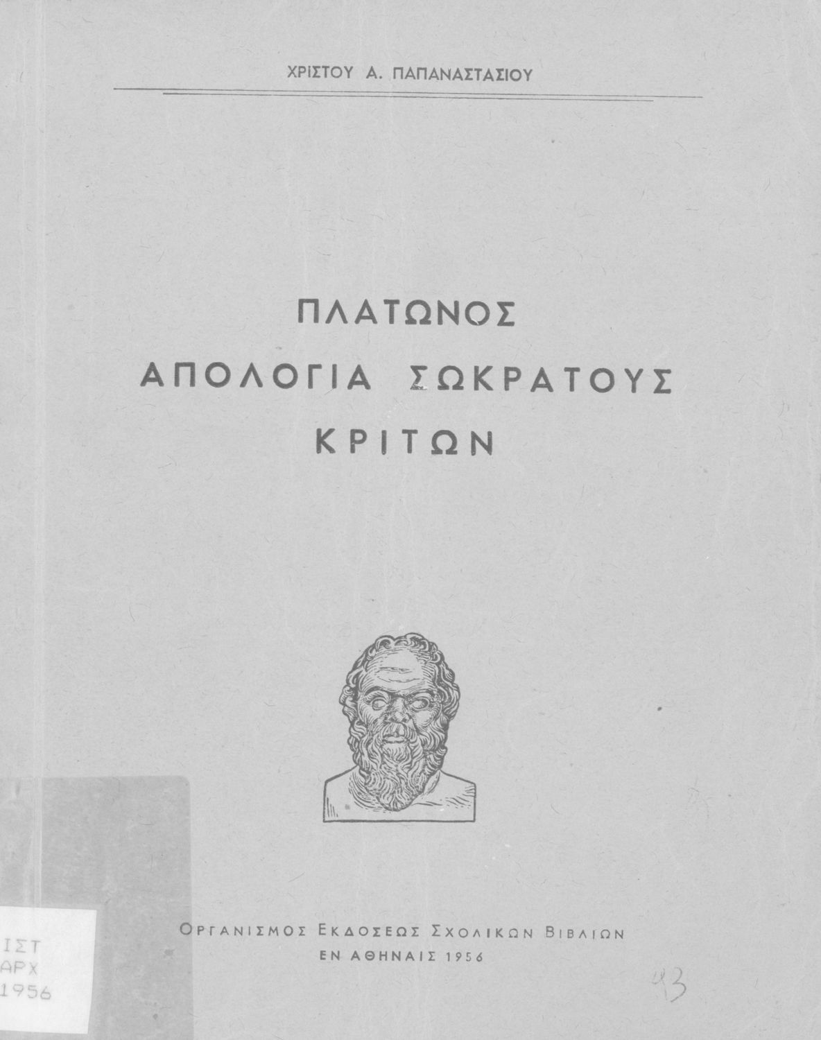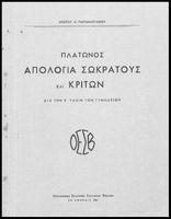 Βαθμίδα εκπαίδευσης: Δευτεροβάθμια Τάξη: Γυμνάσιο Μάθημα: Αρχαία Ελληνικά Γλώσσα: Απλή καθαρεύουσα Παρουσίαση περιεχομένου: Σχολικό εγχειρίδιο Αρχαίων Ελληνικών Γυμνασίου που περιέχει τα έργα του Πλάτωνα Απολογία Σωκράτους και Κρίτων, ερμηνευτικά και πραγματολογικά σχόλια και λεξιλογικές παρατηρήσεις. |