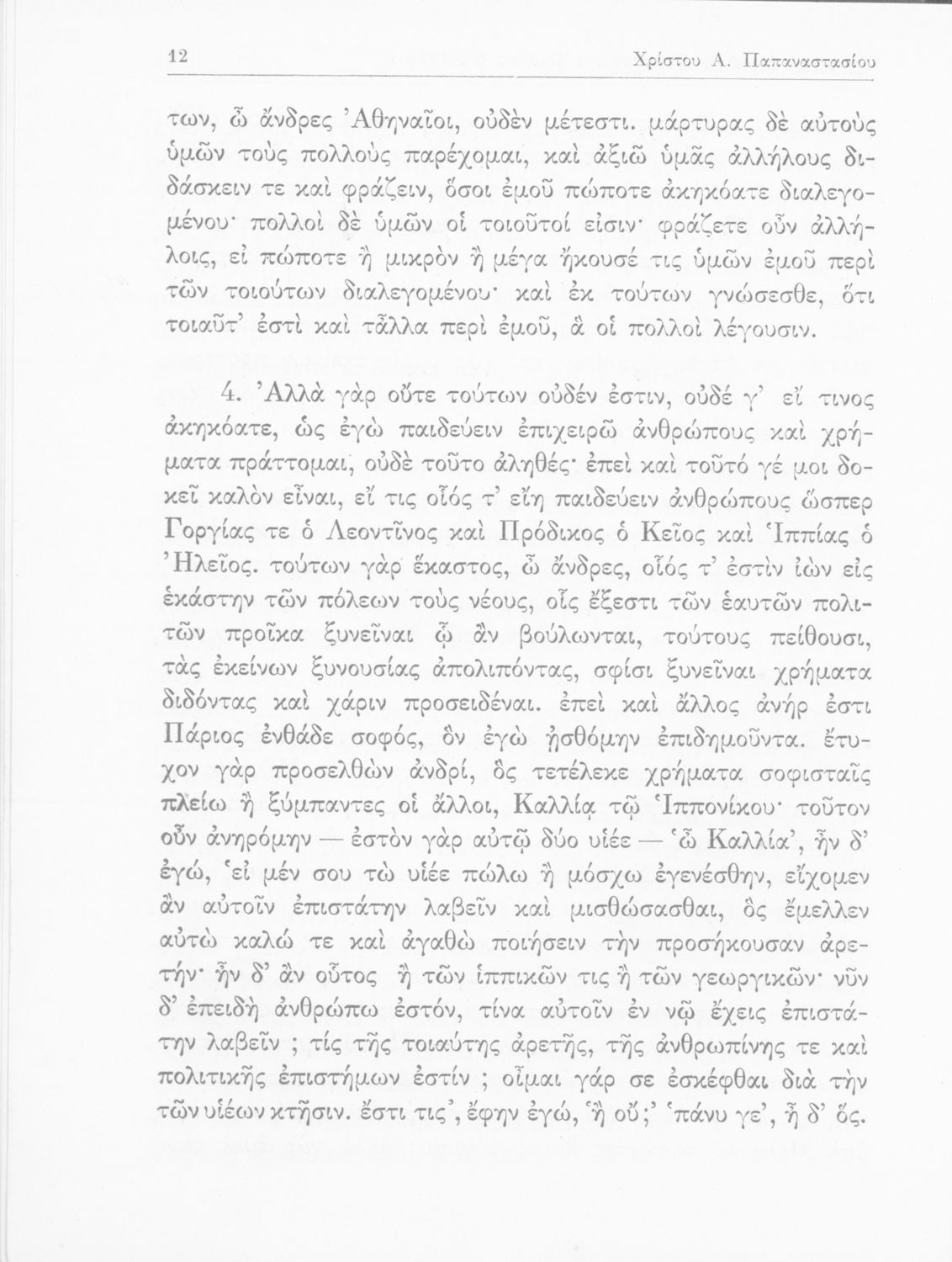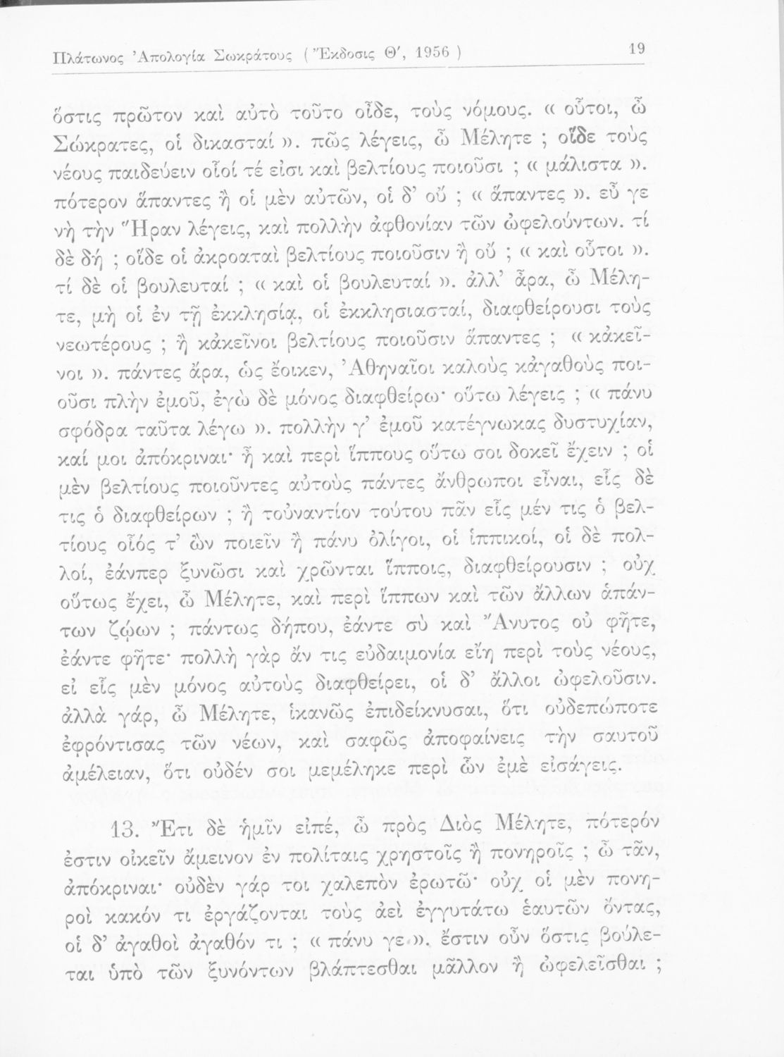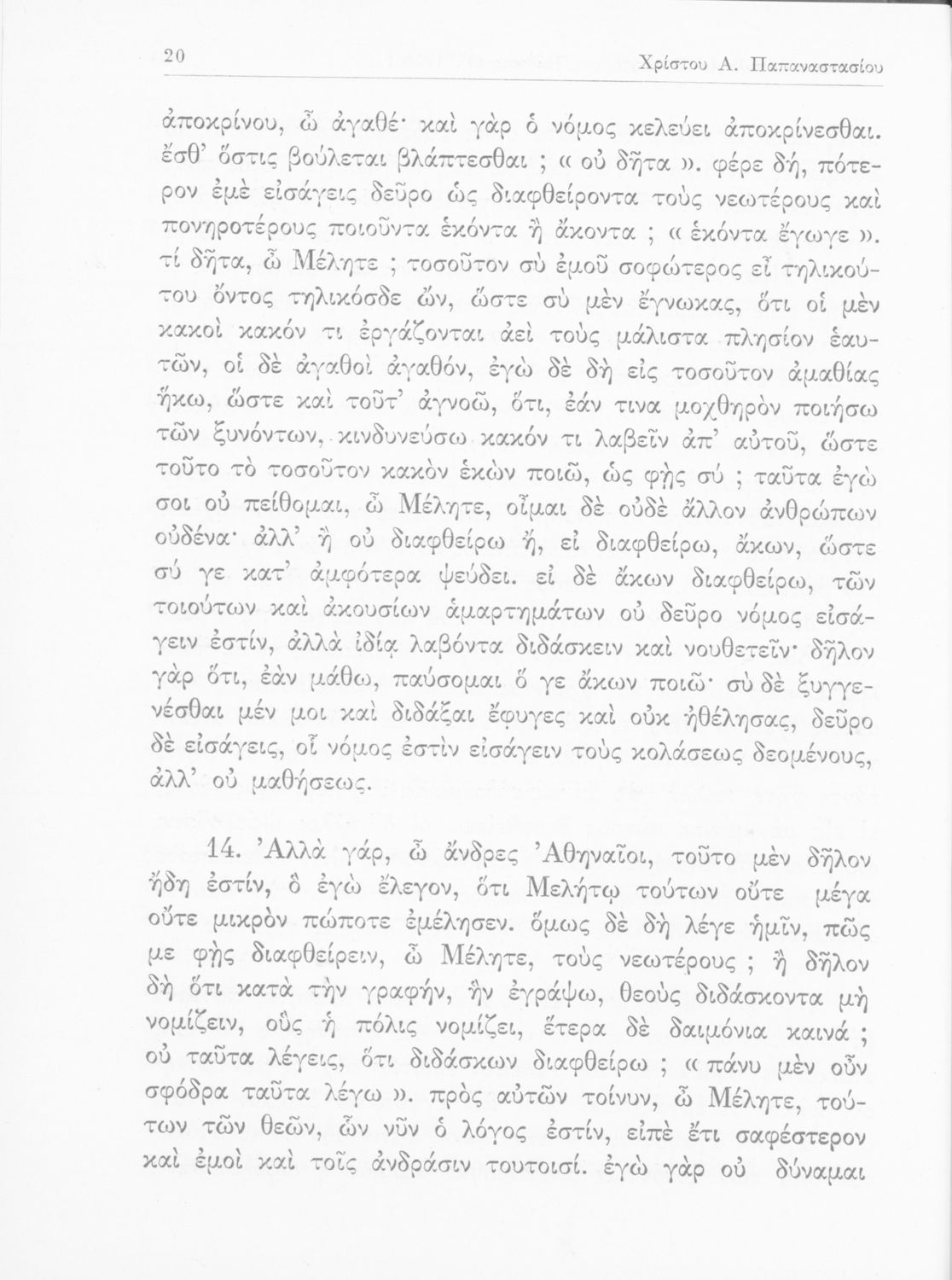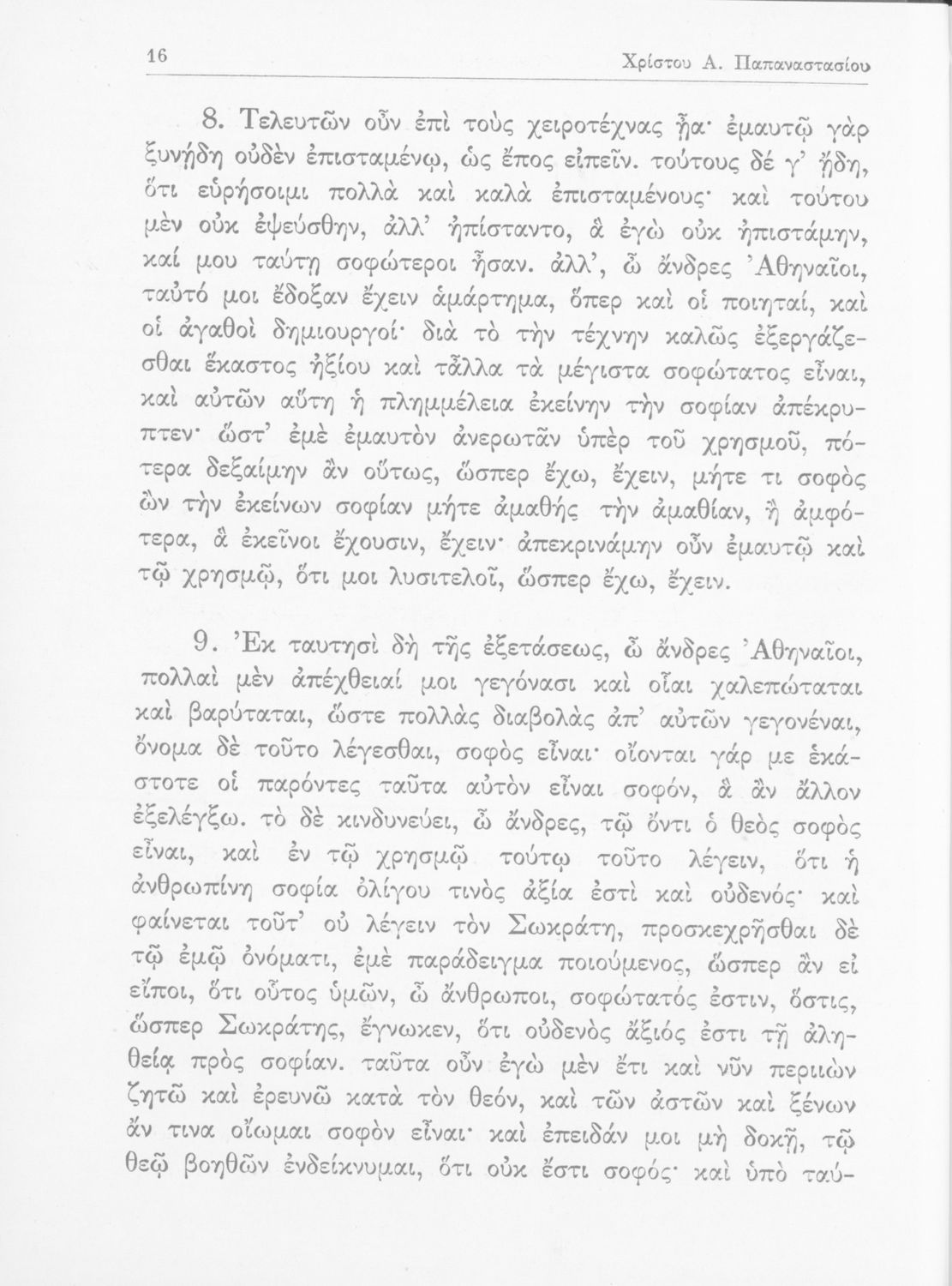 Βαθμίδα εκπαίδευσης: Δευτεροβάθμια Τάξη: Γυμνάσιο Μάθημα: Αρχαία Ελληνικά Γλώσσα: Απλή καθαρεύουσα Παρουσίαση περιεχομένου: Σχολικό εγχειρίδιο Αρχαίων Ελληνικών Γυμνασίου που περιέχει τα έργα του Πλάτωνα Απολογία Σωκράτους και Κρίτων, ερμηνευτικά και πραγματολογικά σχόλια και λεξιλογικές παρατηρήσεις. |