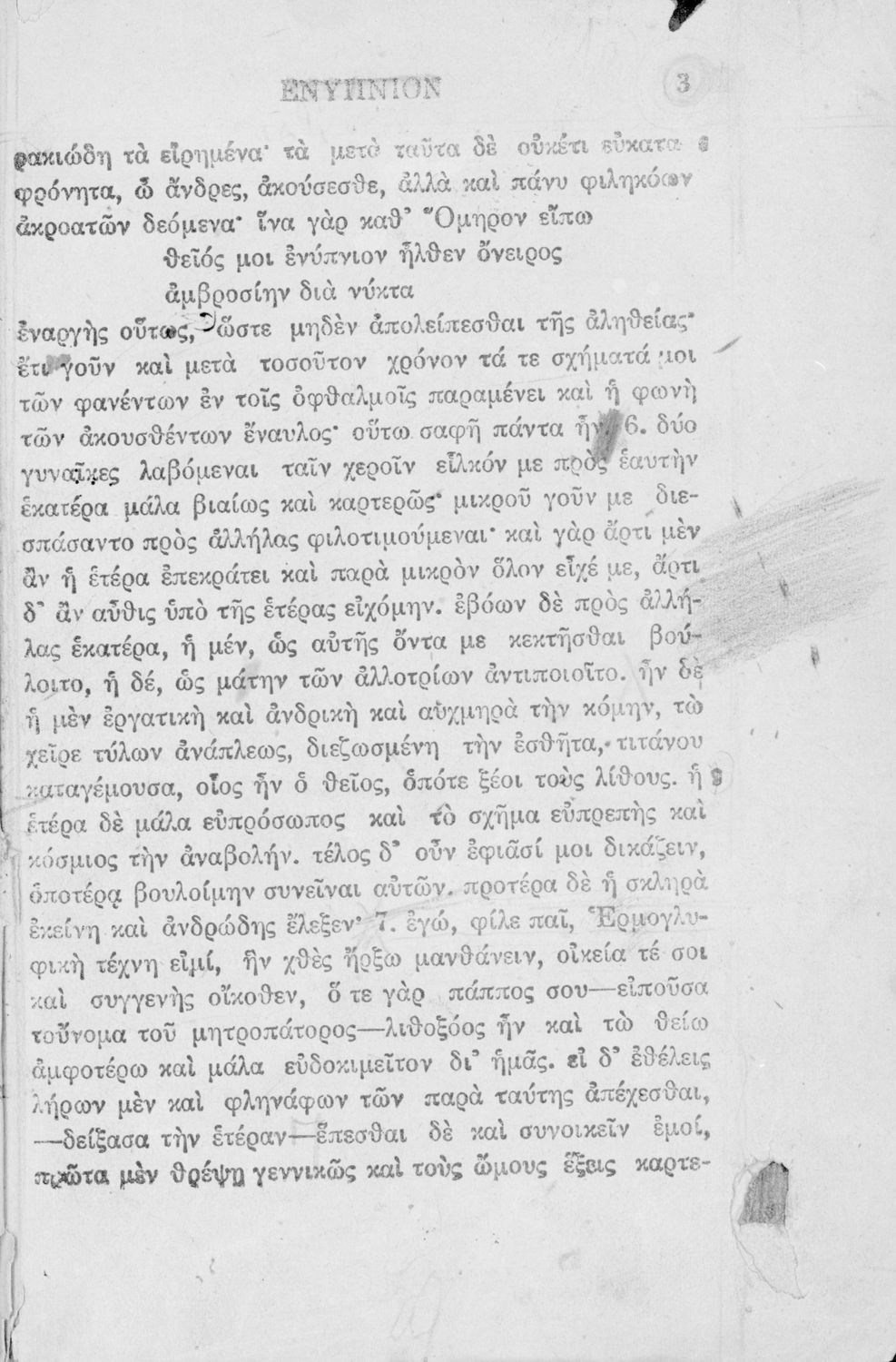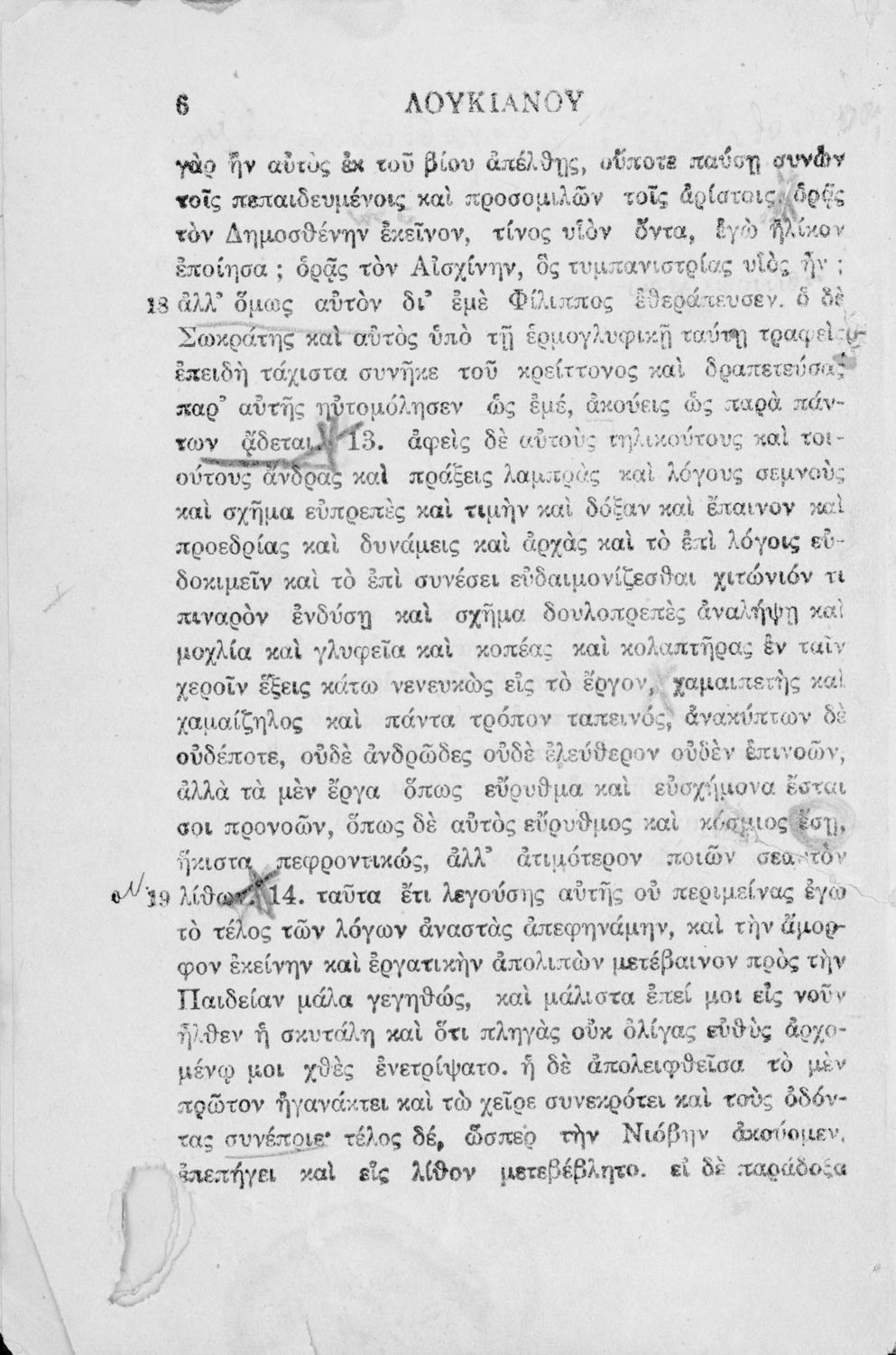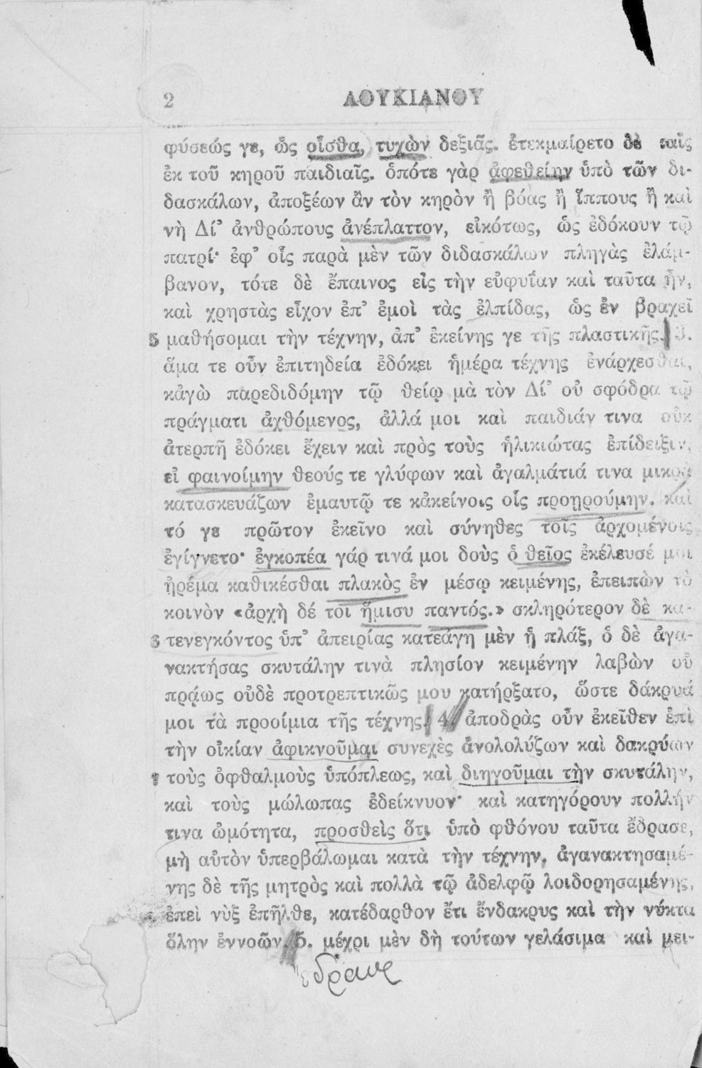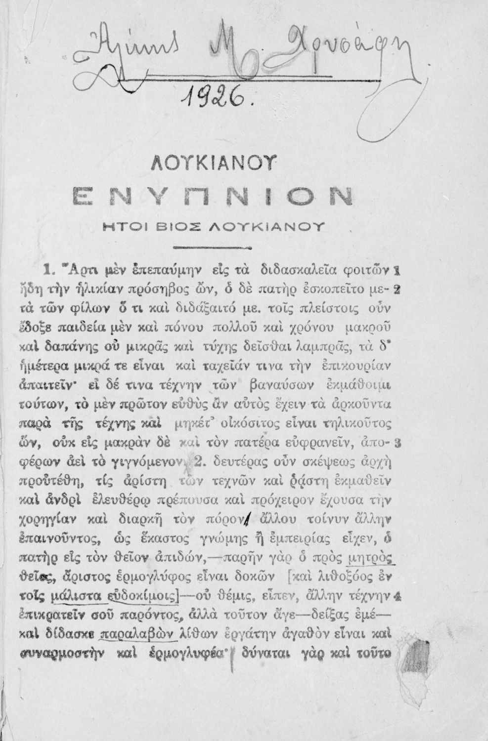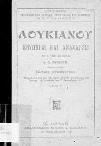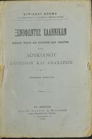 Βαθμίδα εκπαίδευσης: Δευτεροβάθμια Μάθημα: Αρχαία Ελληνικά Γλώσσα: Καθαρεύουσα Παρουσίαση περιεχομένου: Σχολικό εγχειρίδιο Αρχαίων Ελληνικών περιλαμβάνει τα έργα του Λουκιανού Ενύπνιον και Ανάχαρσις . |