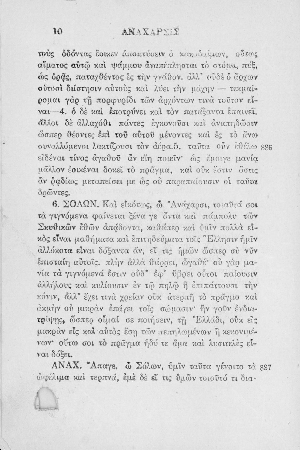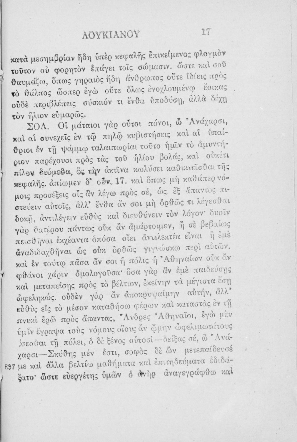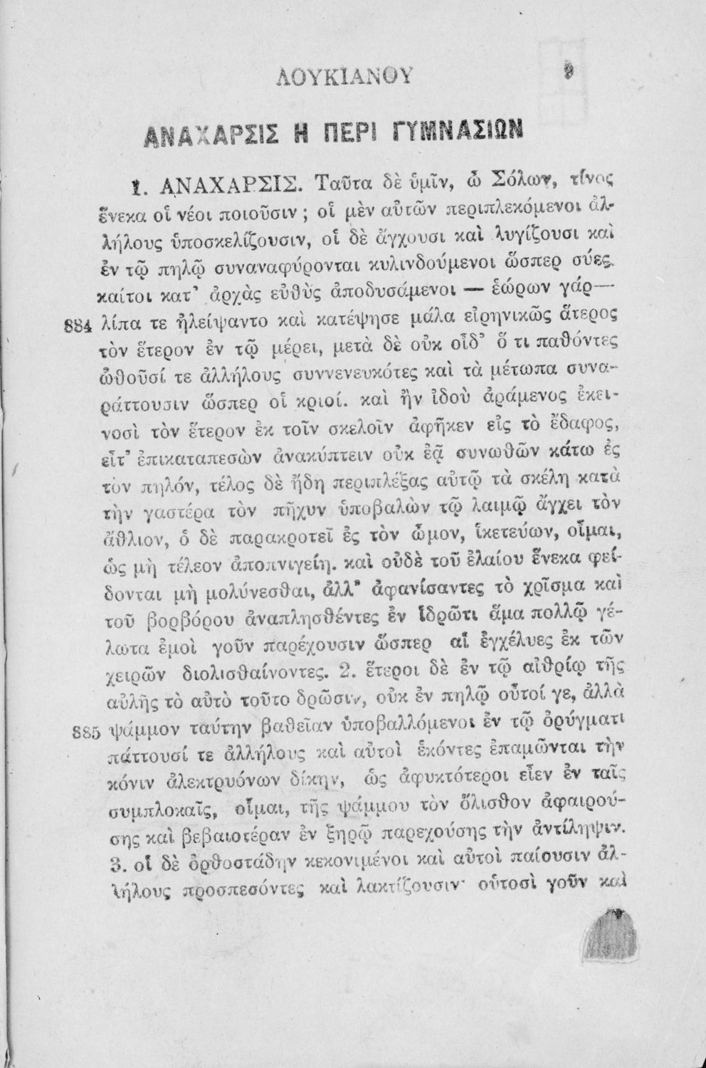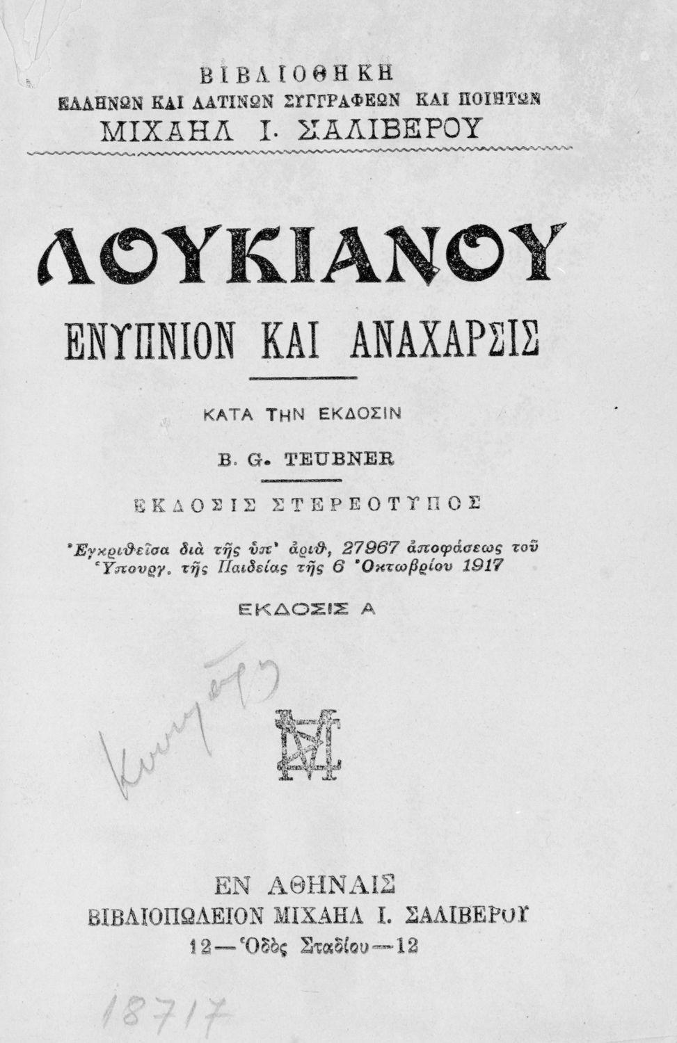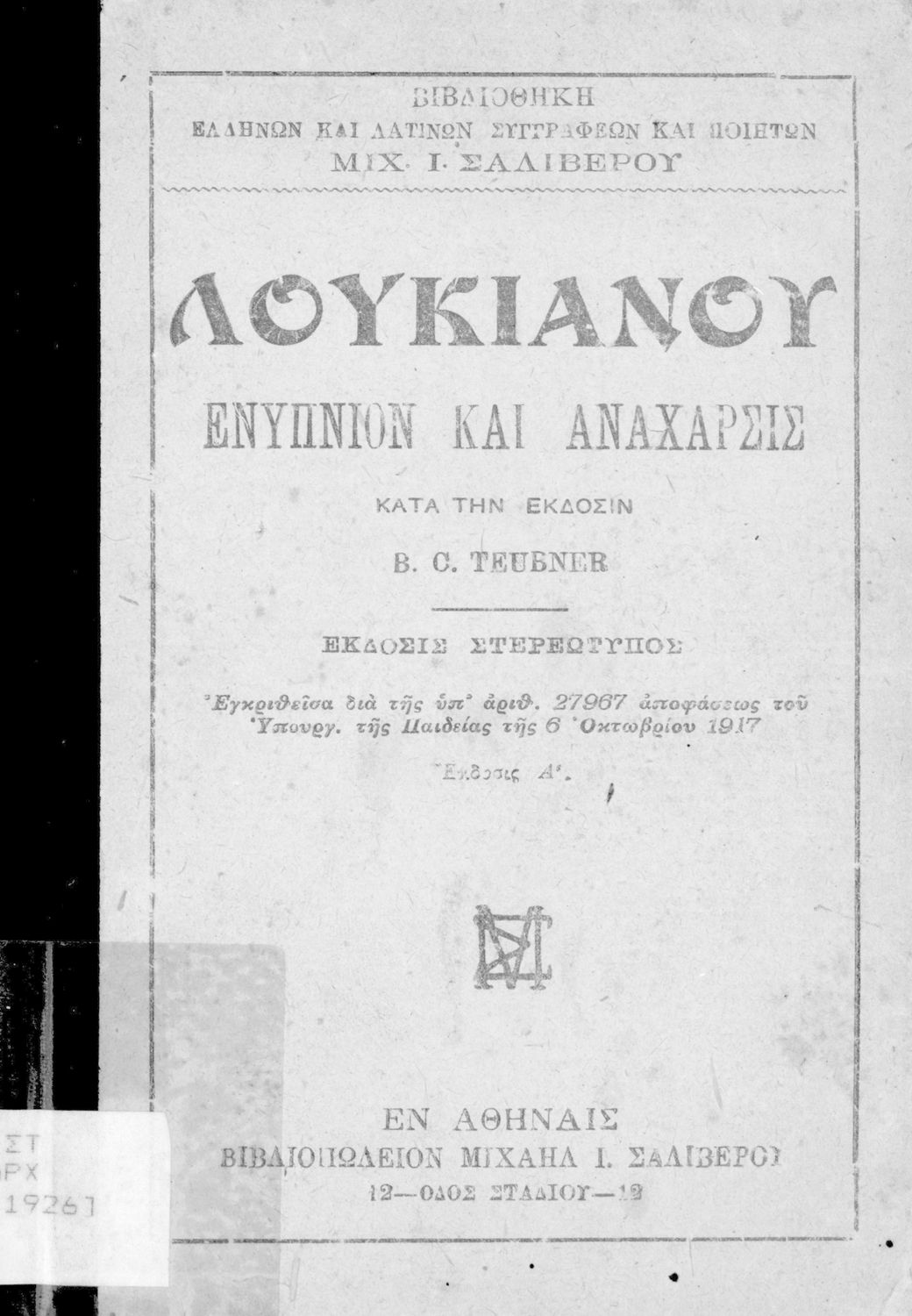 Σχολικό εγχειρίδιο Αρχαίων Ελληνικών περιλαμβάνει τα έργα του Λουκιανού Ενύπνιον και Ανάχαρσις .