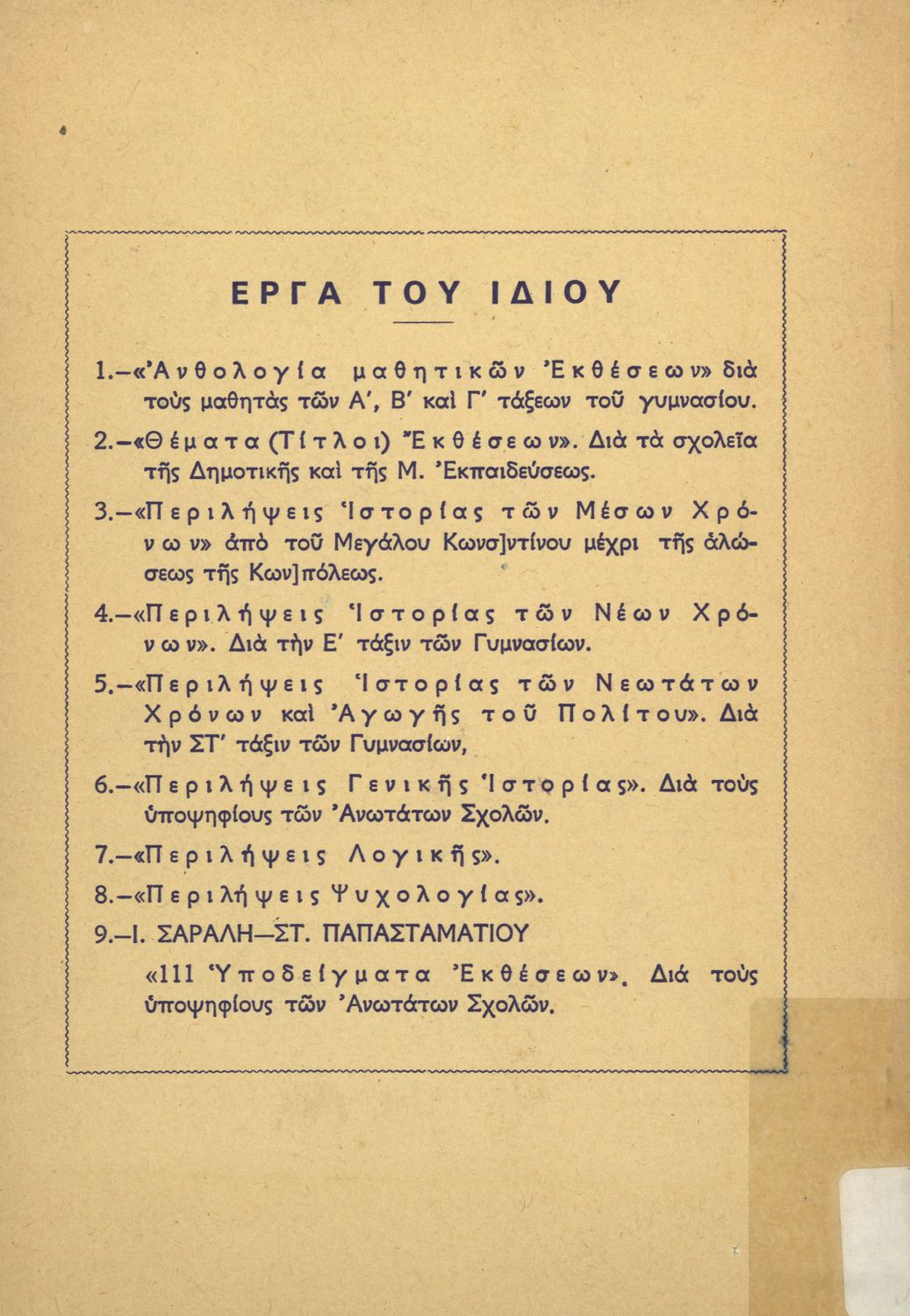 Κωδικός αναγνώρισης: 01-18718 Τίτλος: Περιλήψεις Ιστορίας των ανατολικών λαών και της αρχαίας Ελλάδος δια την Α΄ τάξιν του Γυμνασίου Συγγραφέας: Σταμάτιος Αρ. Παπασταματίου Μέγεθος και υπόστρωμα: Μαθητικό βοήθημα, 20εκ., μαλακό εξώφυλλο, 68 σελίδες. |