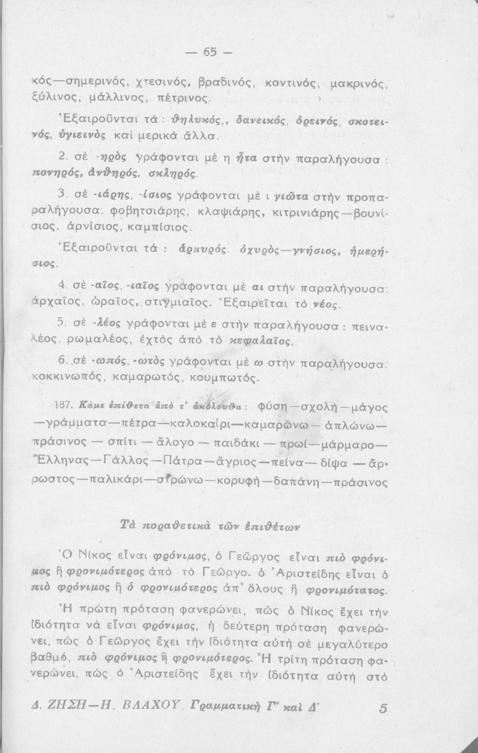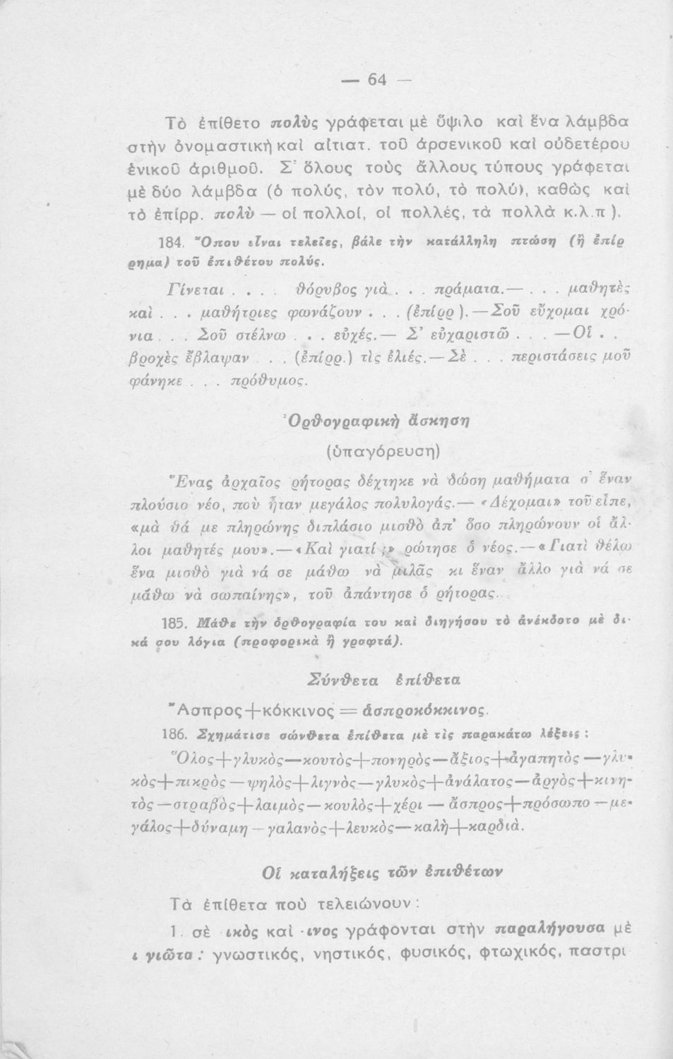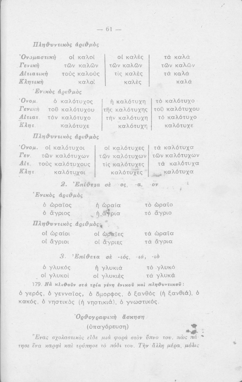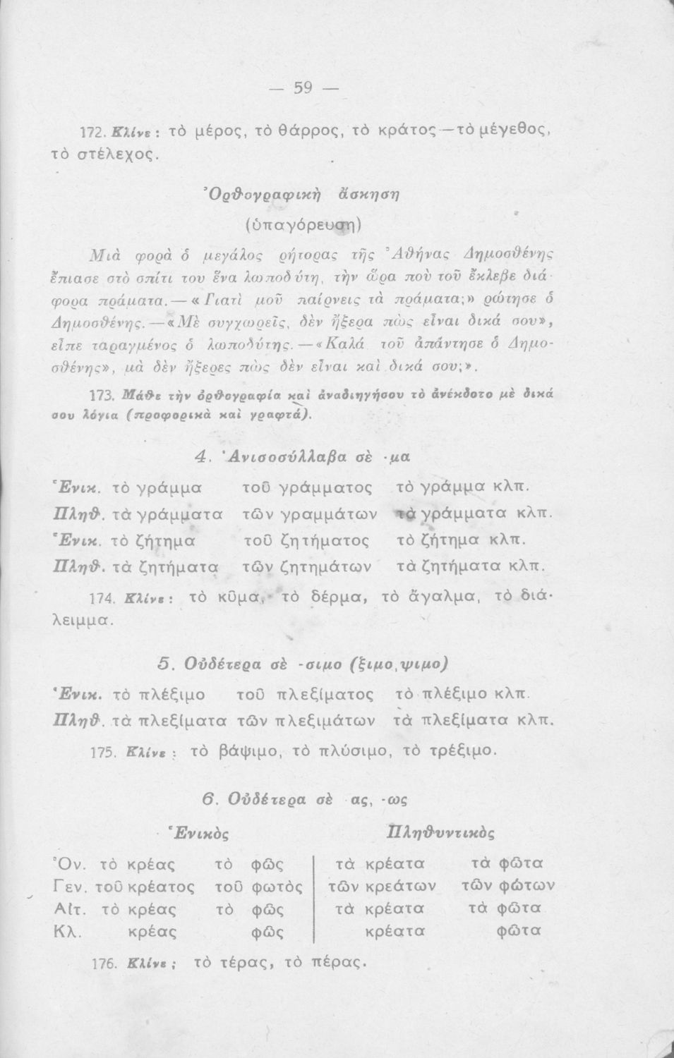 Σχολικό εγχειρίδιο για την Ε΄ και ΣΤ΄ τάξη Δημοτικού με γραμματικούς κανόνες και παραδείγματα για τα κλιτά και άκλιτα μέρη του λόγου.