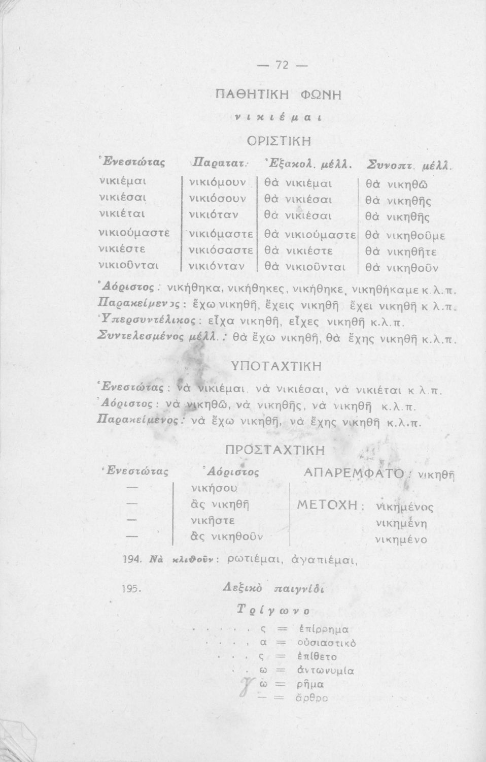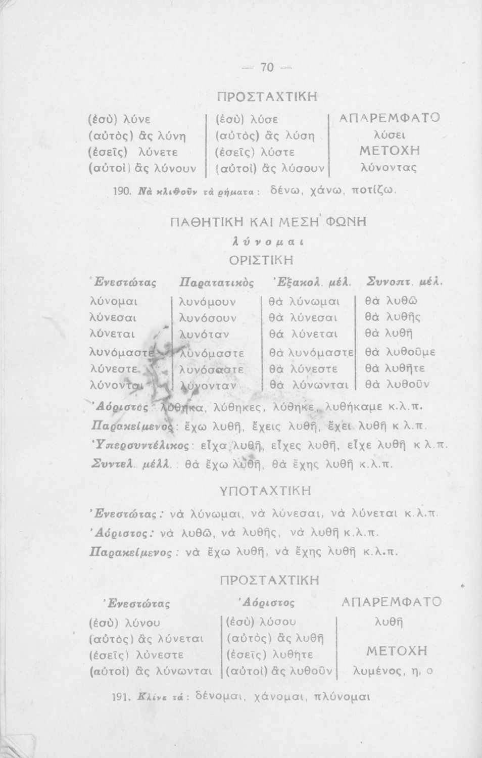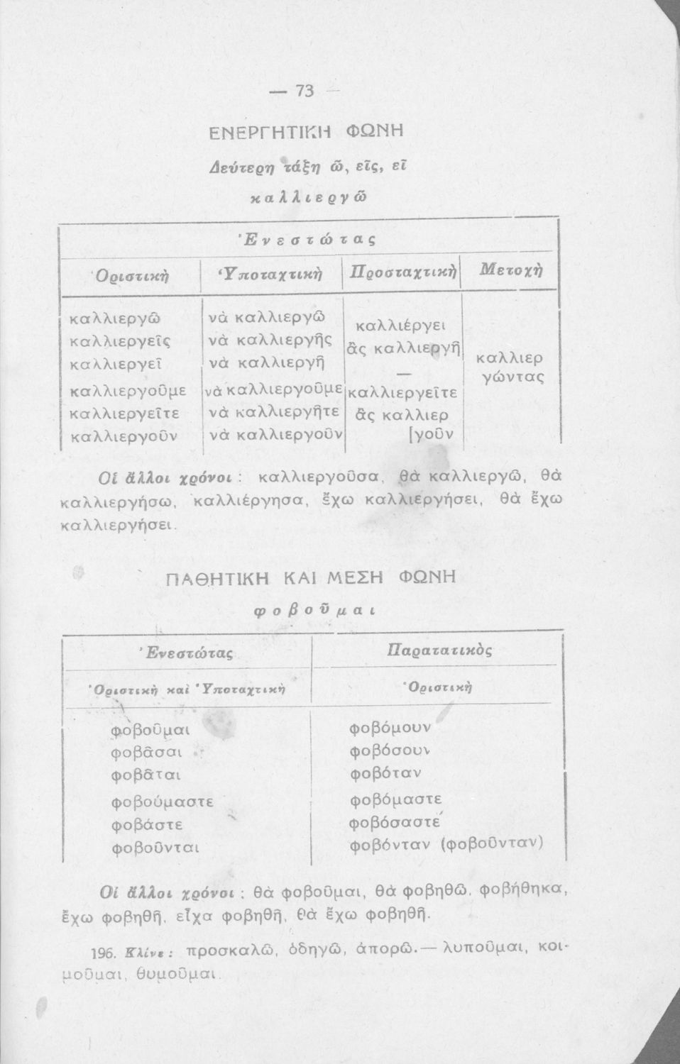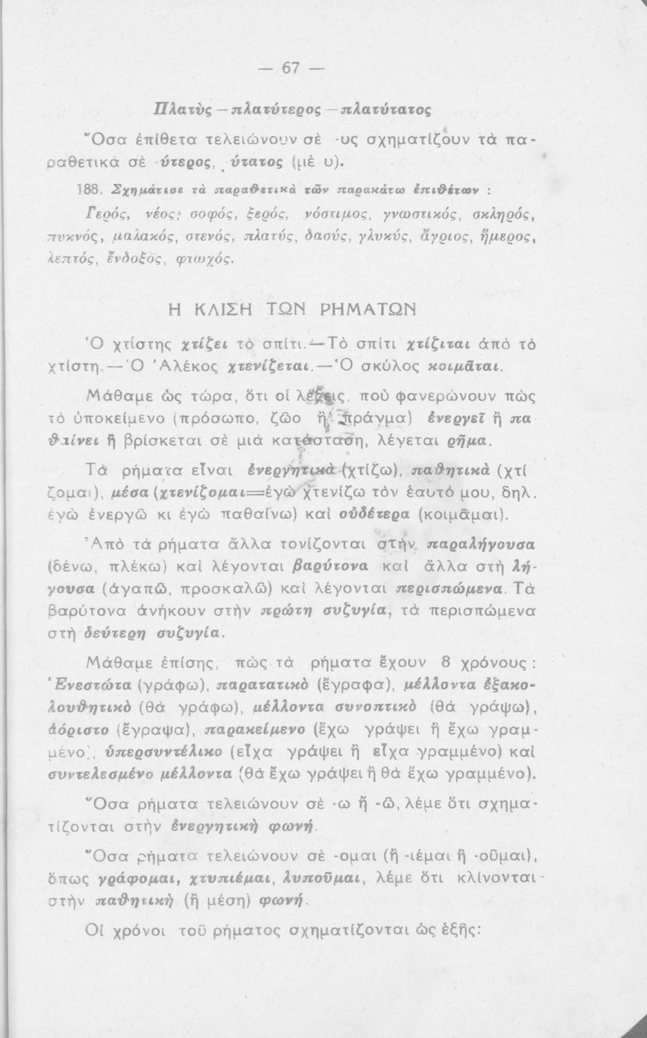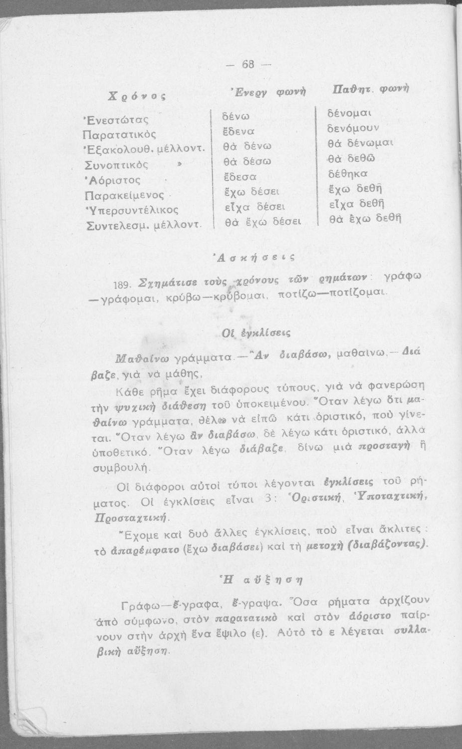 Σχολικό εγχειρίδιο της Ε΄ και ΣΤ΄ τάξης Δημοτικού για την γραμματική της ελληνικής γλώσσας με κανόνες και παραδείγματα. Στο επίμετρο υπάρχουν πίνακες με ανώμαλους σχηματισμούς ρημάτων.