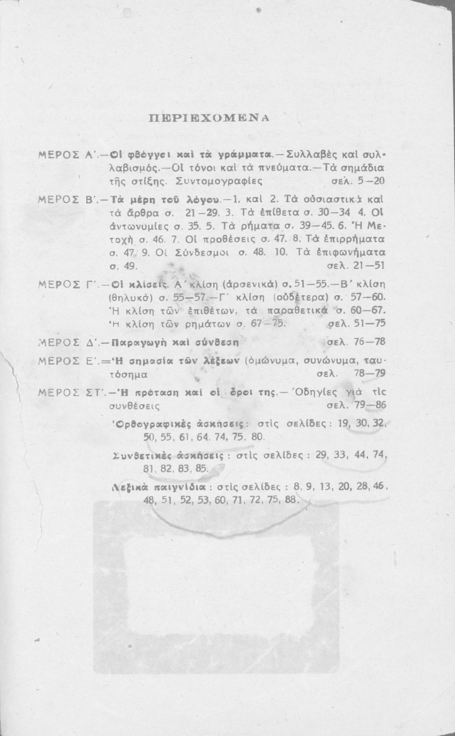 Σχολικό εγχειρίδιο της Ε΄ και ΣΤ΄ τάξης Δημοτικού για την γραμματική της ελληνικής γλώσσας με κανόνες και παραδείγματα. Στο επίμετρο υπάρχουν πίνακες με ανώμαλους σχηματισμούς ρημάτων.