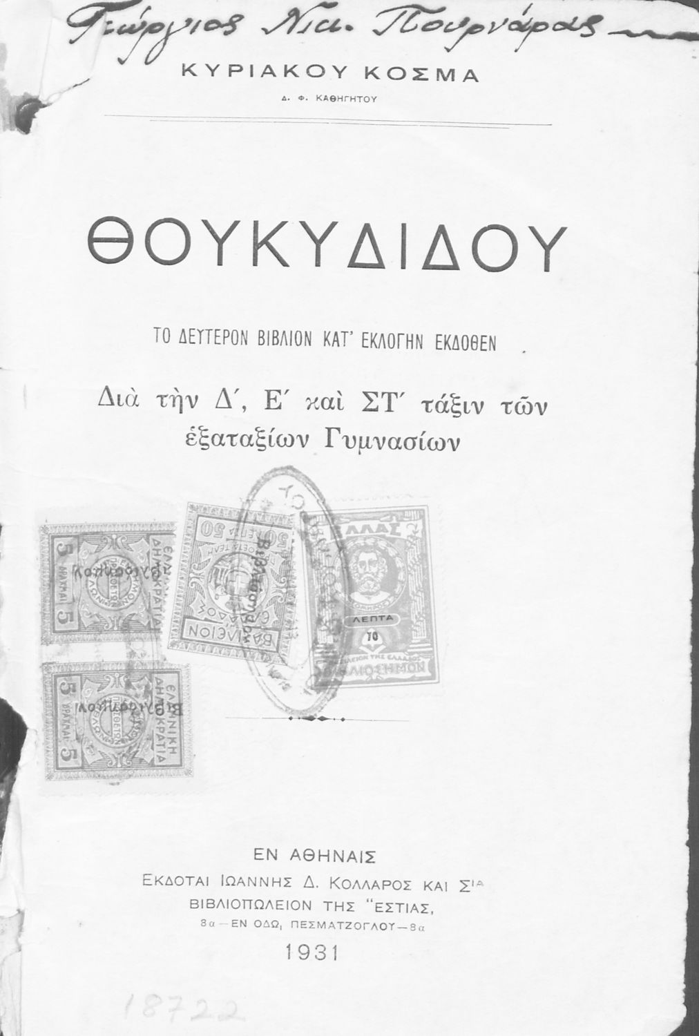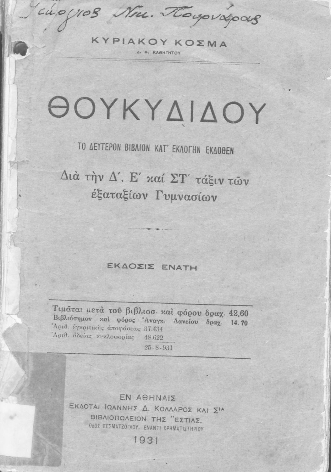 Τίτλος: Θουκυδίδου Ιστορίαι το δεύτερον βιβλίον κατ΄ εκλογήν εκδοθέν. Δια την Δ΄, Ε΄ και ΣΤ΄ Τάξιν των Εξαταξίων Γυμνασίων