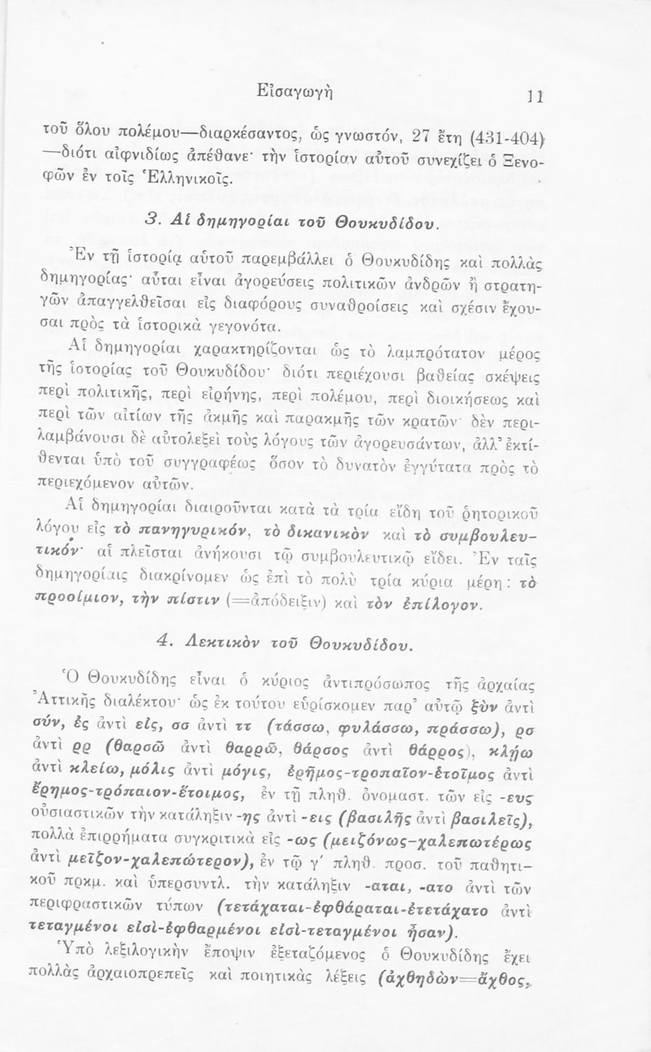 Σχολικό εγχειρίδιο Αρχαίων Ελληνικών για τις Β΄ και Γ΄ Γυμνασίου που περιλαμβάνει σύντομο βιογραφικό σημείωμα του Θουκυδίδη, εισαγωγικά σχόλια στο έργο, κείμενο και ετυμολογικό λεξιλόγιο.