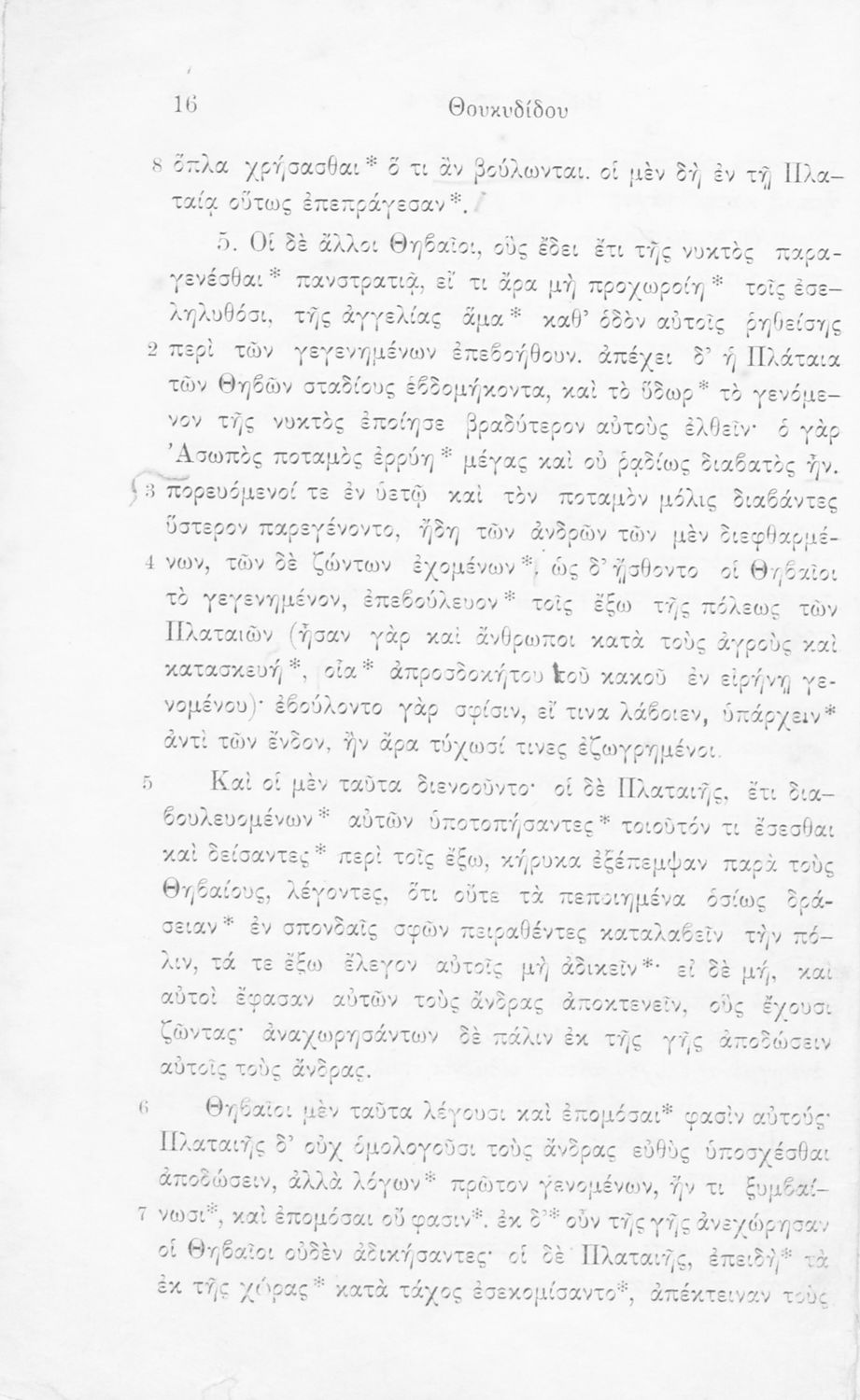 Σχολικό εγχειρίδιο Αρχαίων Ελληνικών για τις Δ΄, Ε΄ και ΣΤ΄ Γυμνασίου παλαιού τύπου που περιλαμβάνει σύντομο βιογραφικό σημείωμα του Θουκυδίδη, περιγραφή του ιστορικού πλαισίου, αποσπάσματα από τα Πλαταϊκά, τα
