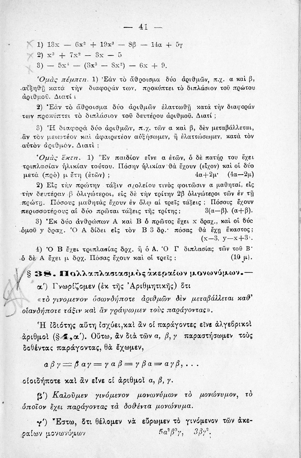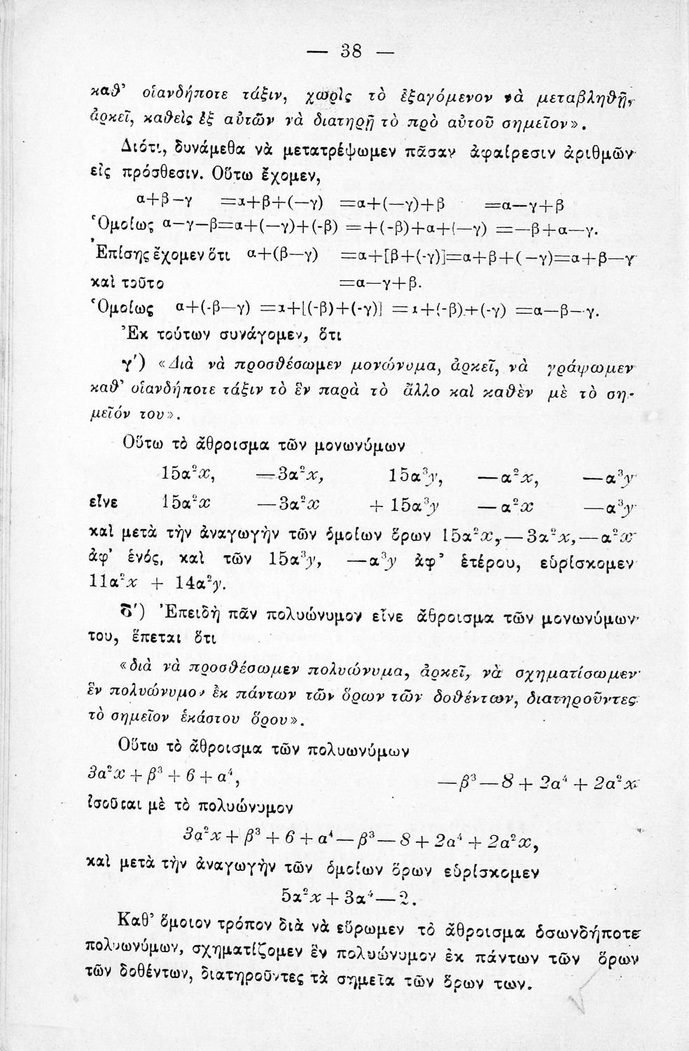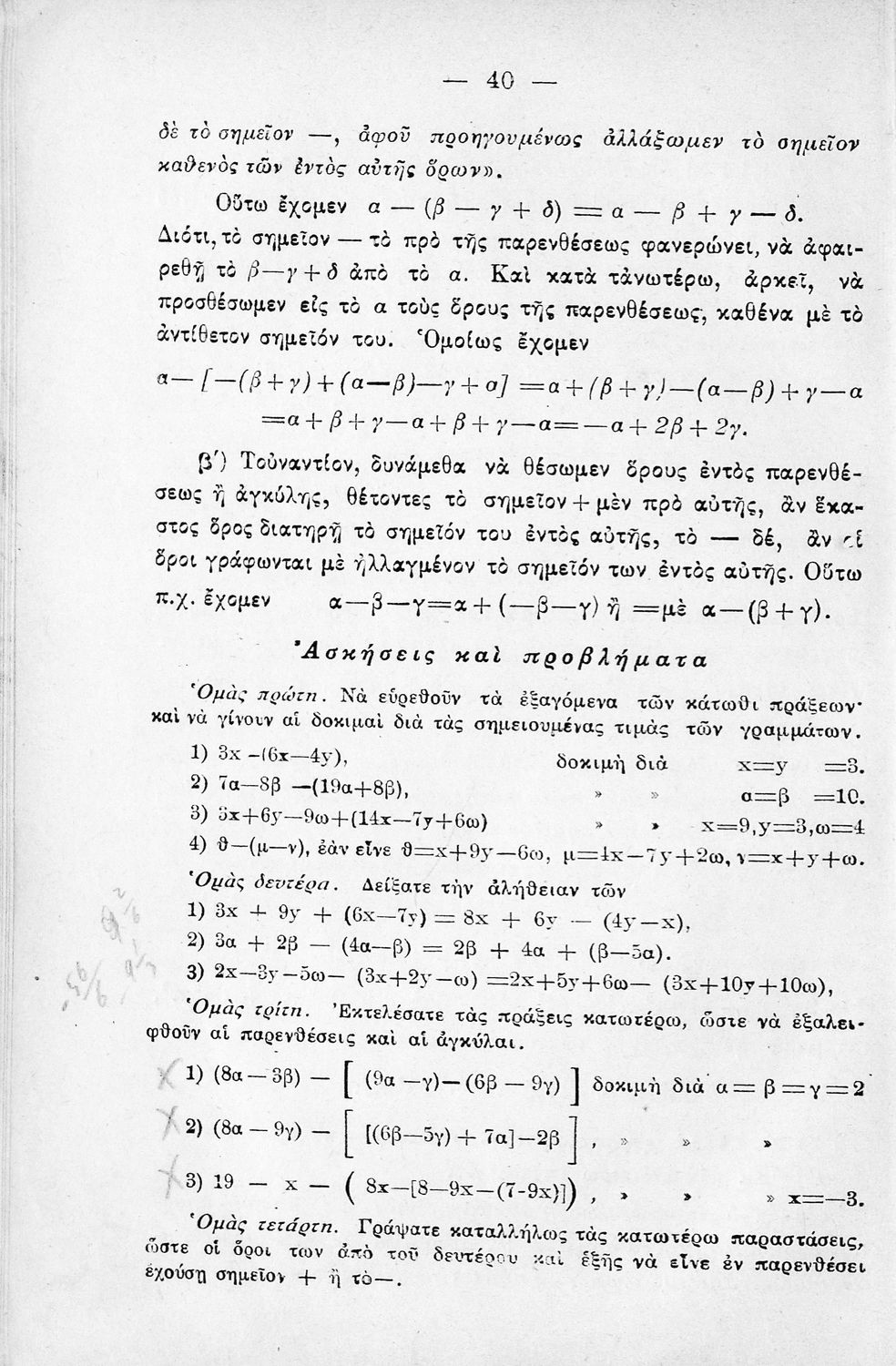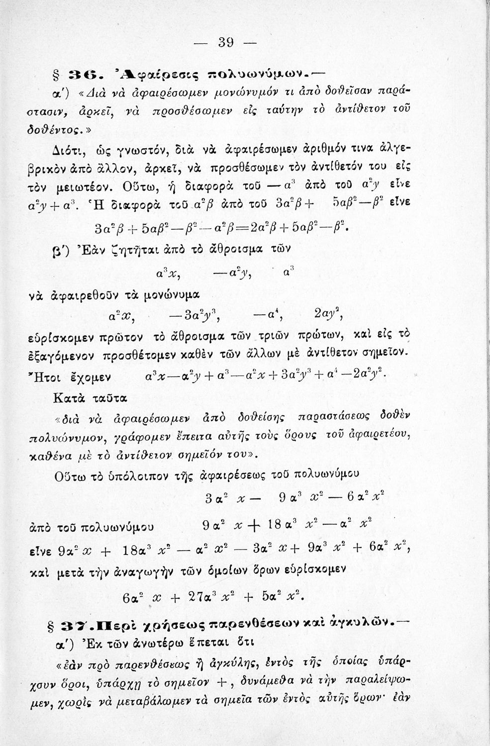 Βαθμίδα εκπαίδευσης: Δευτεροβάθμια Τάξη: Γυμνάσιο Μάθημα: Μαθηματικά Γλώσσα: Απλή καθαρεύουσα Παρουσίαση περιεχομένου: Σχολικό εγχειρίδιο Άλγεβρας Γυμνασίου που περιλαμβάνει θεωρία, ασκήσεις και στοιχεία λογιστικής. |
