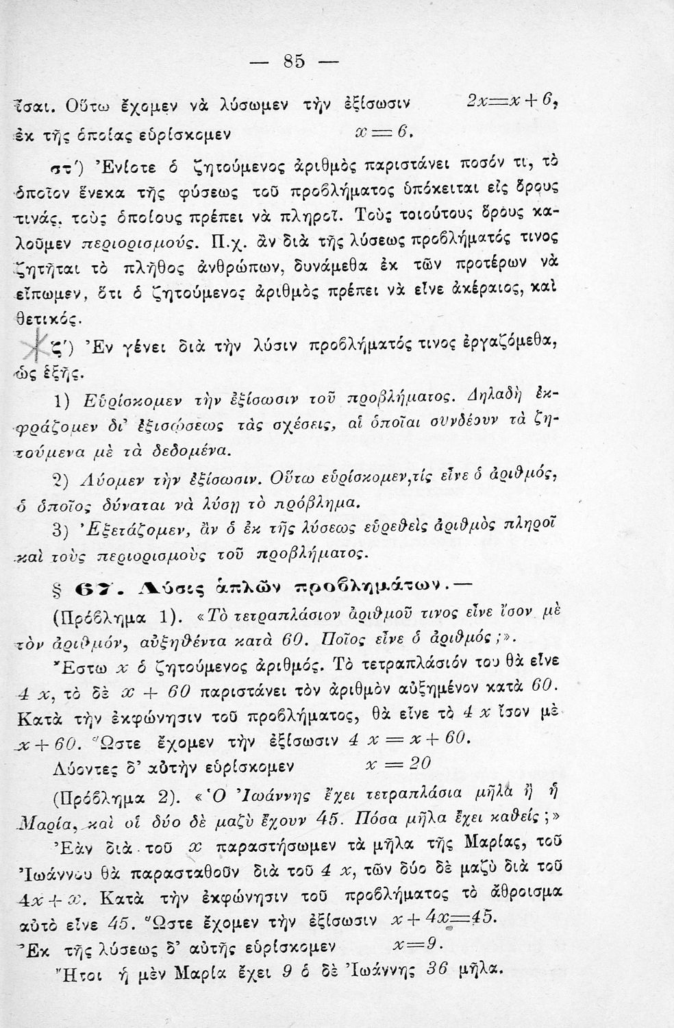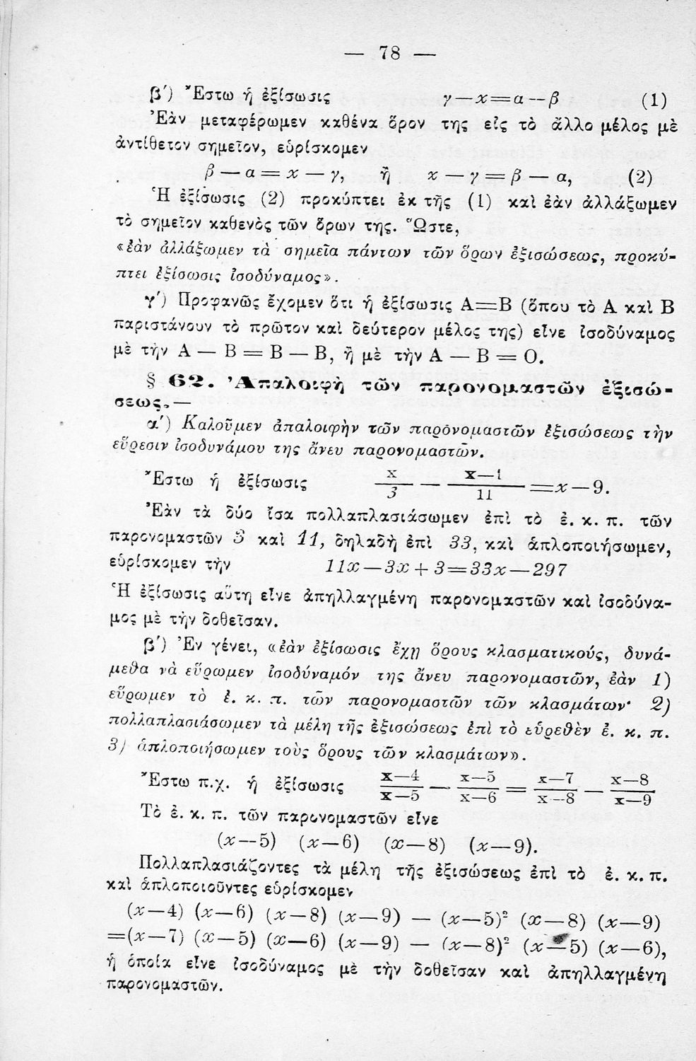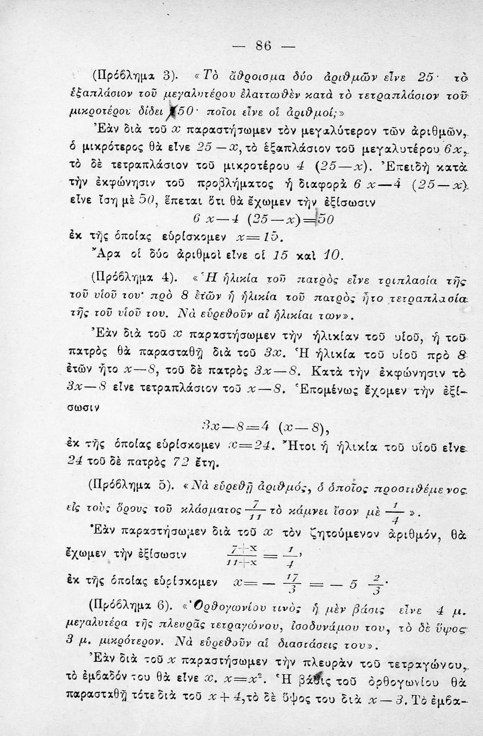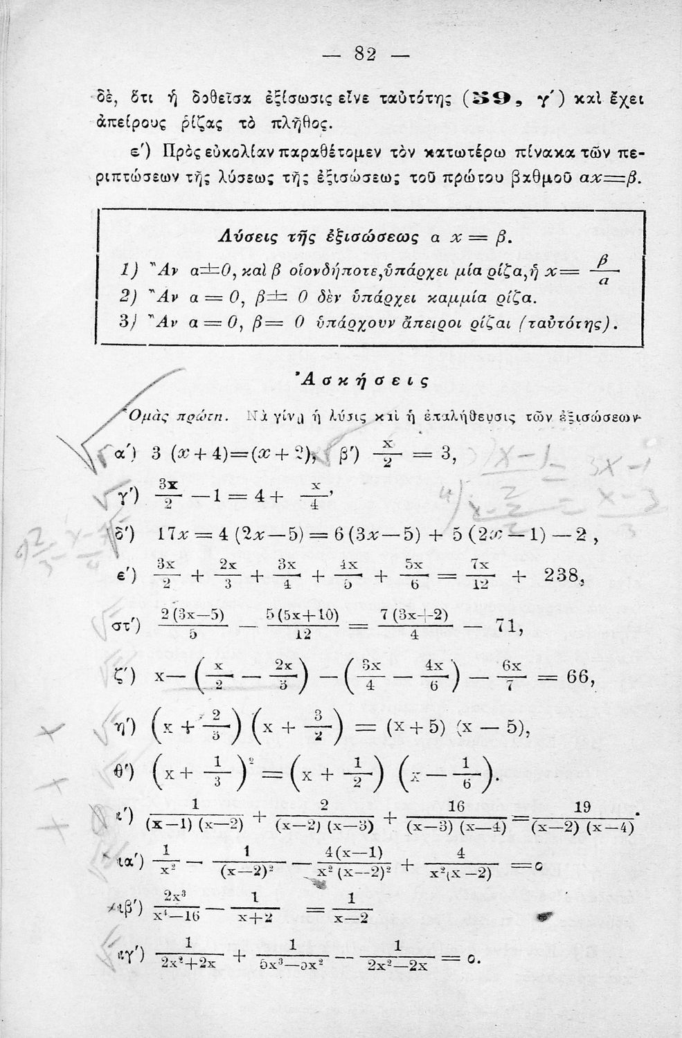 Βαθμίδα εκπαίδευσης: Δευτεροβάθμια Τάξη: Γυμνάσιο Μάθημα: Μαθηματικά Γλώσσα: Απλή καθαρεύουσα Παρουσίαση περιεχομένου: Σχολικό εγχειρίδιο Άλγεβρας Γυμνασίου που περιλαμβάνει θεωρία, ασκήσεις και στοιχεία λογιστικής. |