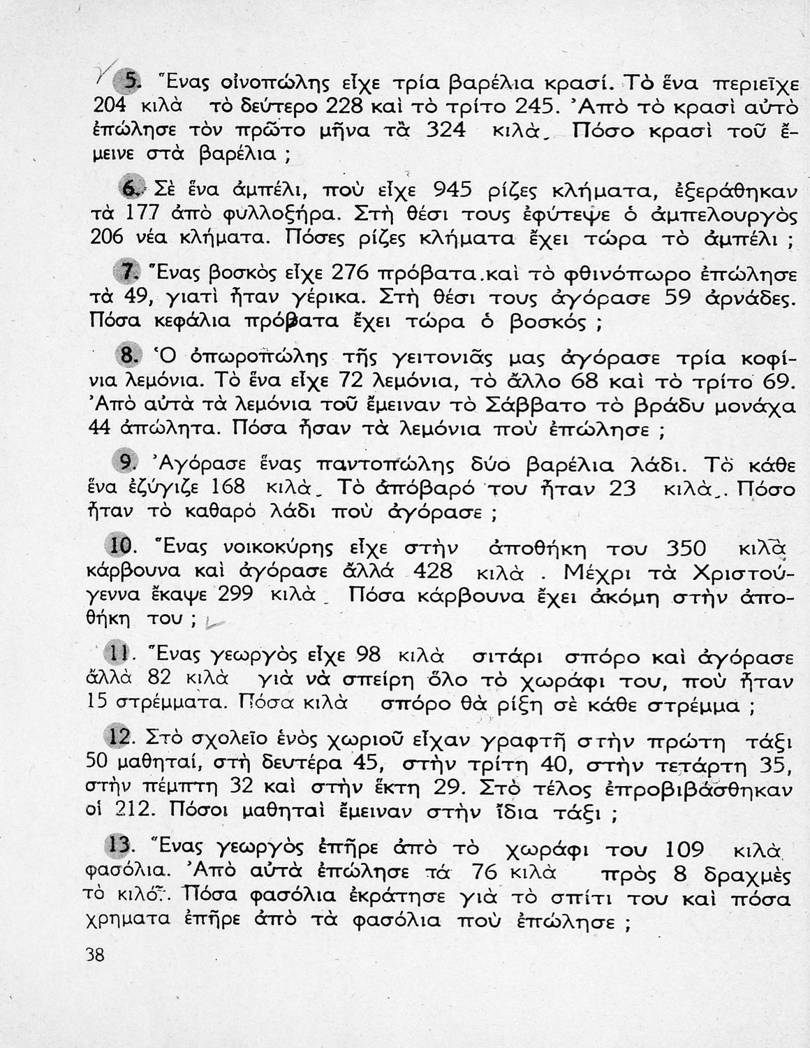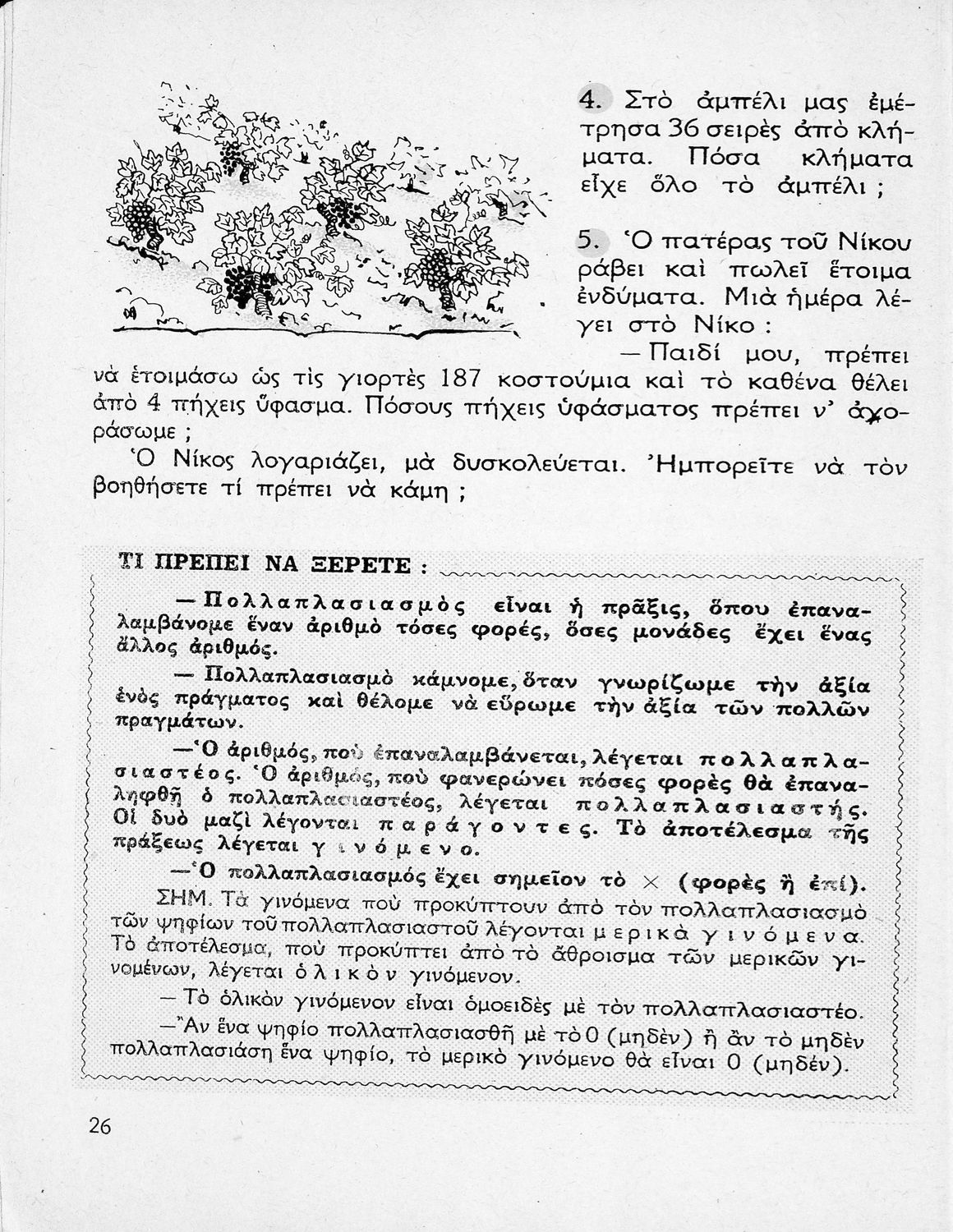 Κωδικός αναγνώρισης: 01-18727 Τίτλος: Αριθμητική τάξις Δ΄ Συγγραφέας: Ι. Γιαννέλης, Ι. Σταματογιαννάκης Εικονογράφος: Δ. Γέροντας Μέγεθος και υπόστρωμα: Μαθητικό βοήθημα, 20εκ., μαλακό εξώφυλλο, 80 σελίδες. Σκίτσα (ασπρόμαυρα και μονόχρωμα). |