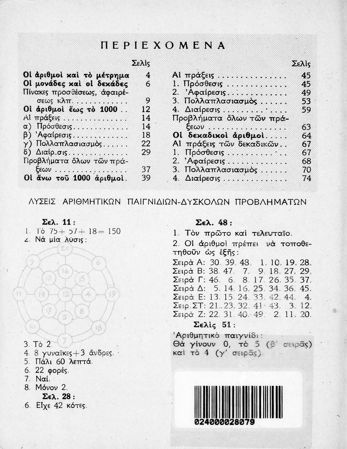 Κωδικός αναγνώρισης: 01-18727 Τίτλος: Αριθμητική τάξις Δ΄ Συγγραφέας: Ι. Γιαννέλης, Ι. Σταματογιαννάκης Εικονογράφος: Δ. Γέροντας Μέγεθος και υπόστρωμα: Μαθητικό βοήθημα, 20εκ., μαλακό εξώφυλλο, 80 σελίδες. Σκίτσα (ασπρόμαυρα και μονόχρωμα). |