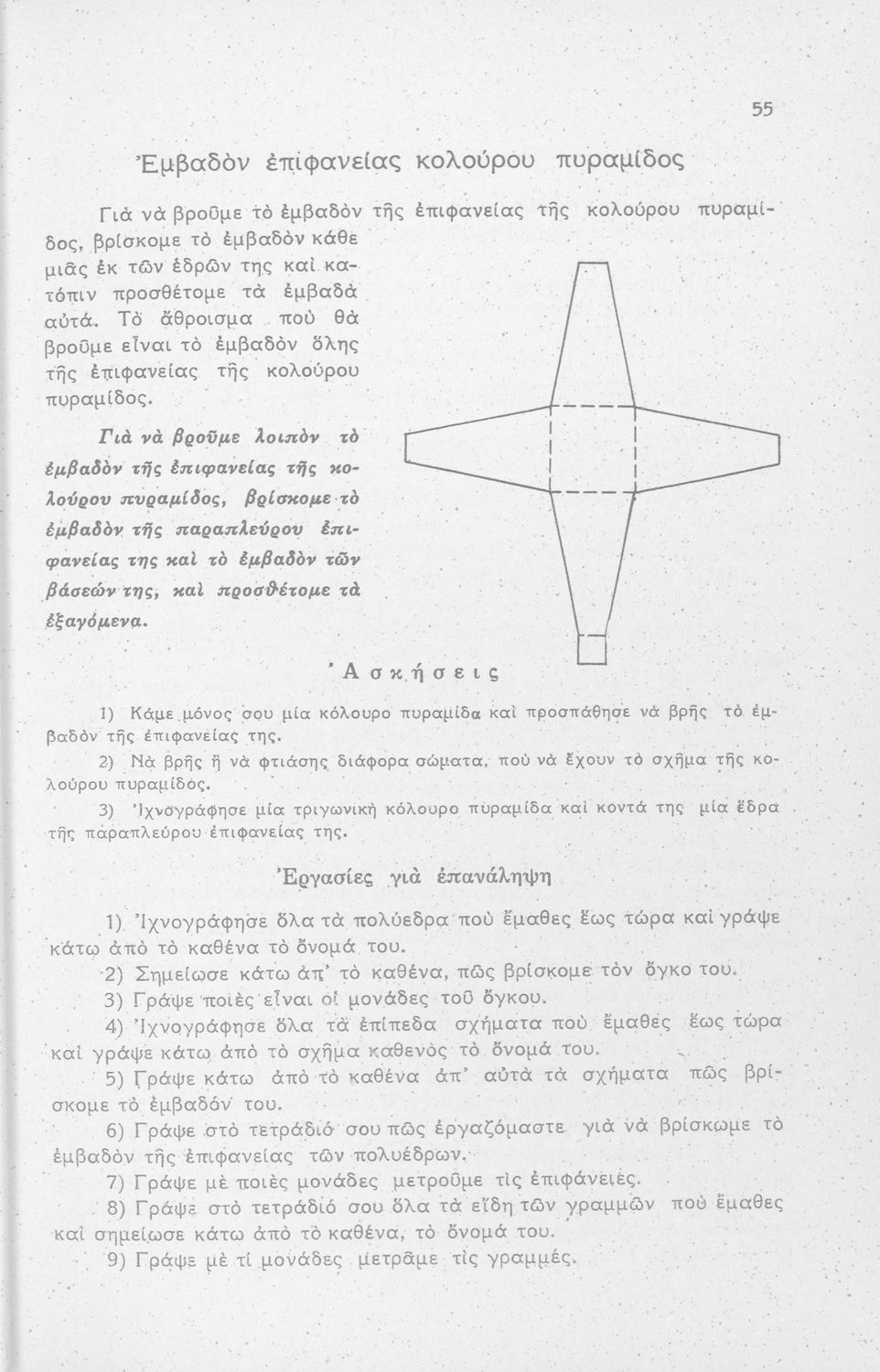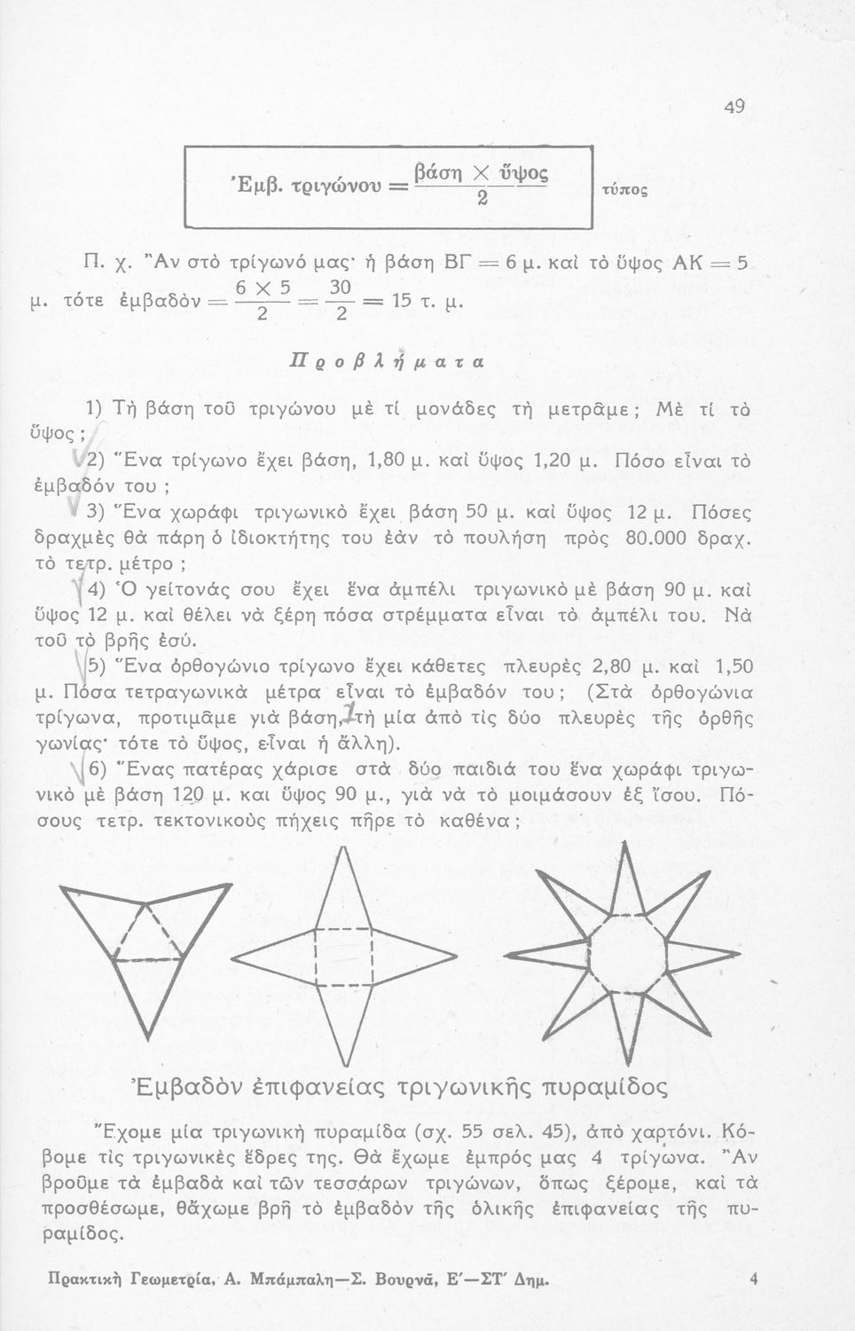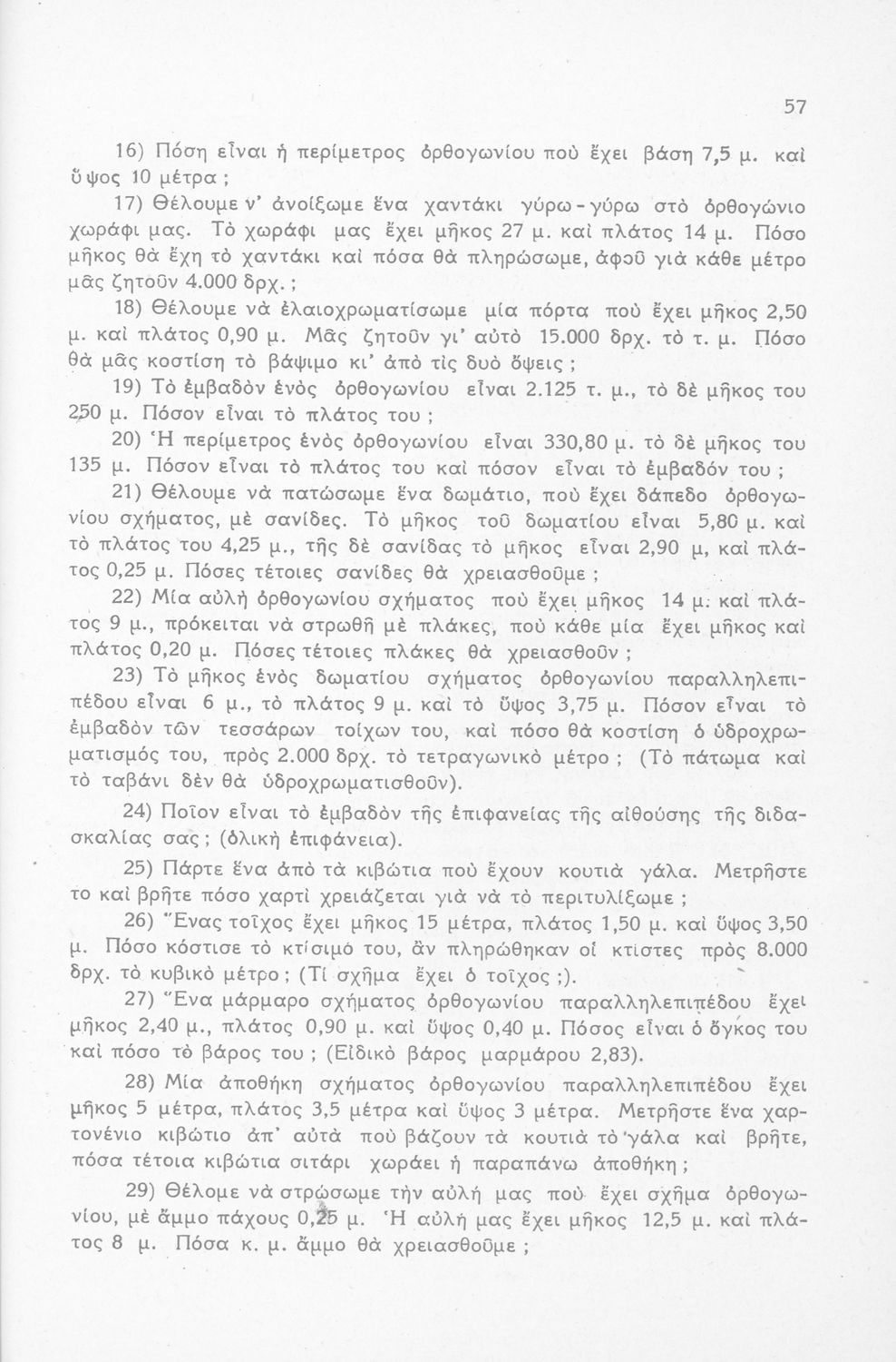 Παρουσίαση περιεχομένου: Μαθητικό βοήθημα Γεωμετρίας για τις Ε΄ και ΣΤ΄ Δημοτικού που περιλαμβάνει εικόνες, σχεδιαγράμματα και ασκήσεις. Περιέχει πίνακα με τα ειδικά βάρη διαφόρων σωμάτων.