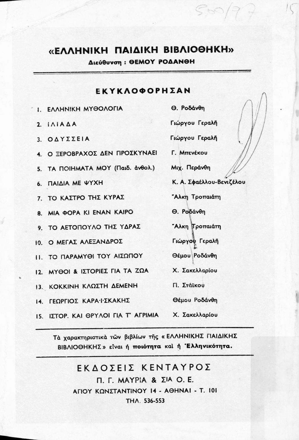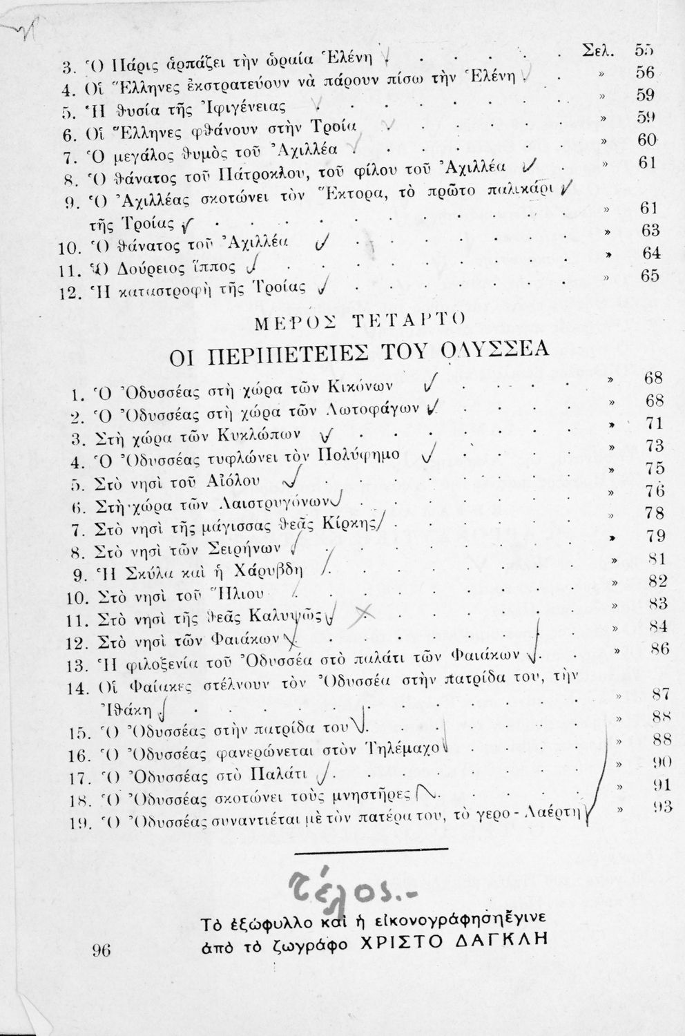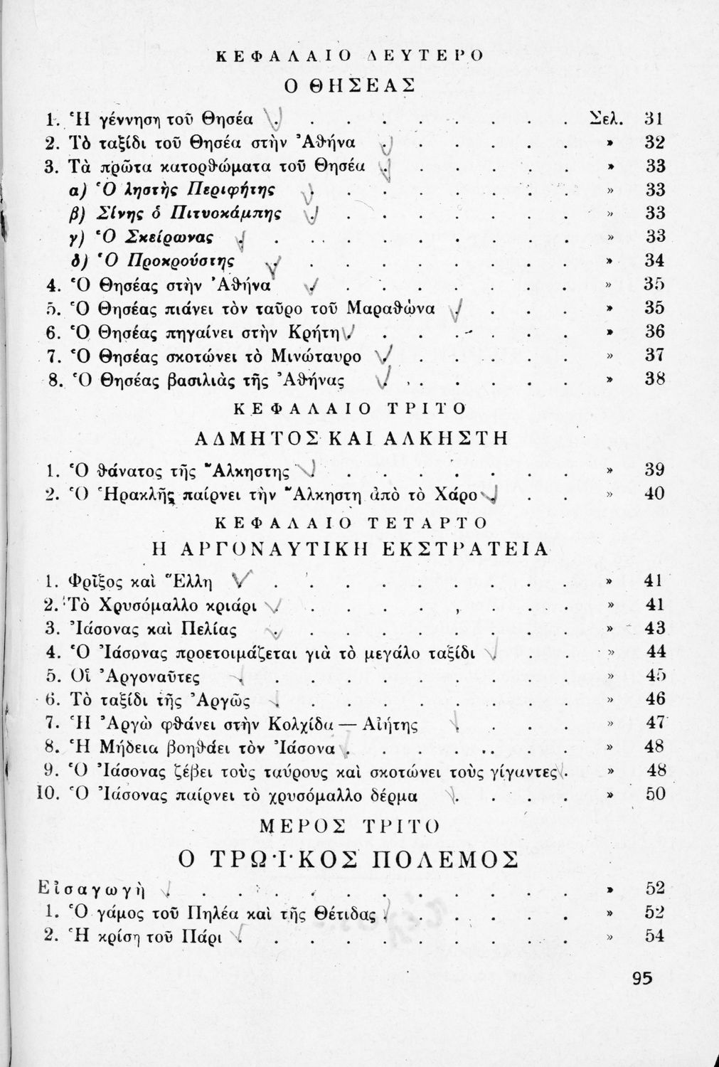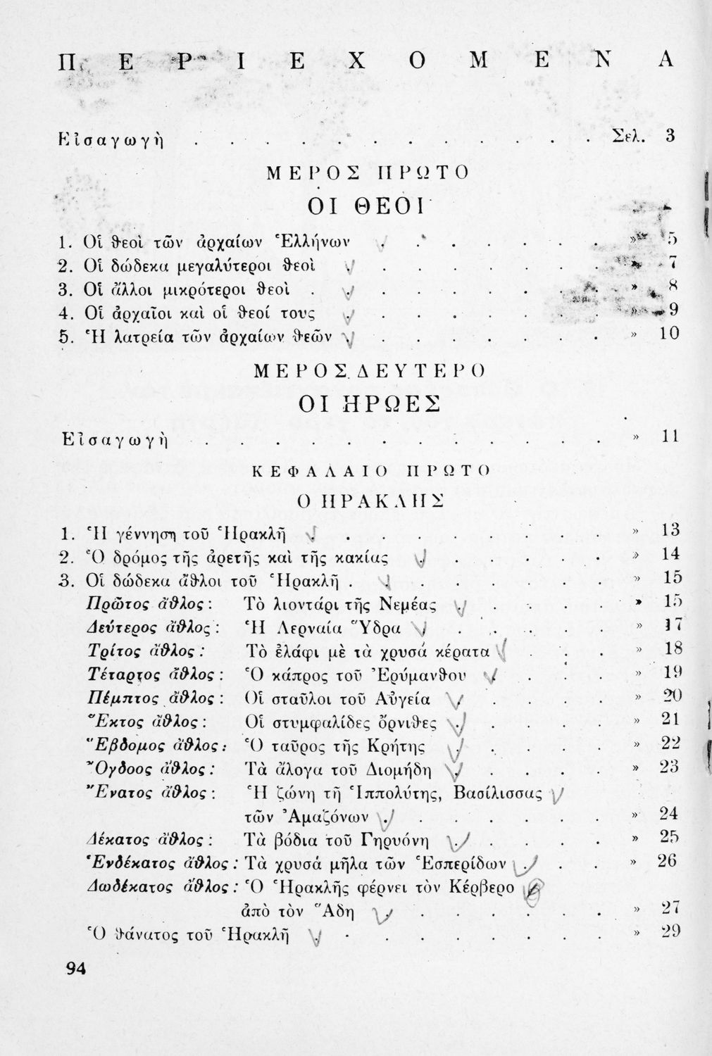 Μαθητικό βοήθημα της Γ΄ Δημοτικού για το μάθημα της Ιστορίας. Αναφέρεται κυρίως στην μυθολογία, τους αρχαίους ήρωες, τους Θεούς του Ολύμπου. Στη συνέχεια αναφέρει τους Περσικούς Πολέμους. Η γλώσσα είναι δημοτική και το ύφος απλό. Με ευσύνοπτο τρόπο παρουσιάζονται τα μυθικά χρόνια στους μαθητές προκειμένου να καλλιεργηθεί η εθνική συνείδηση.
