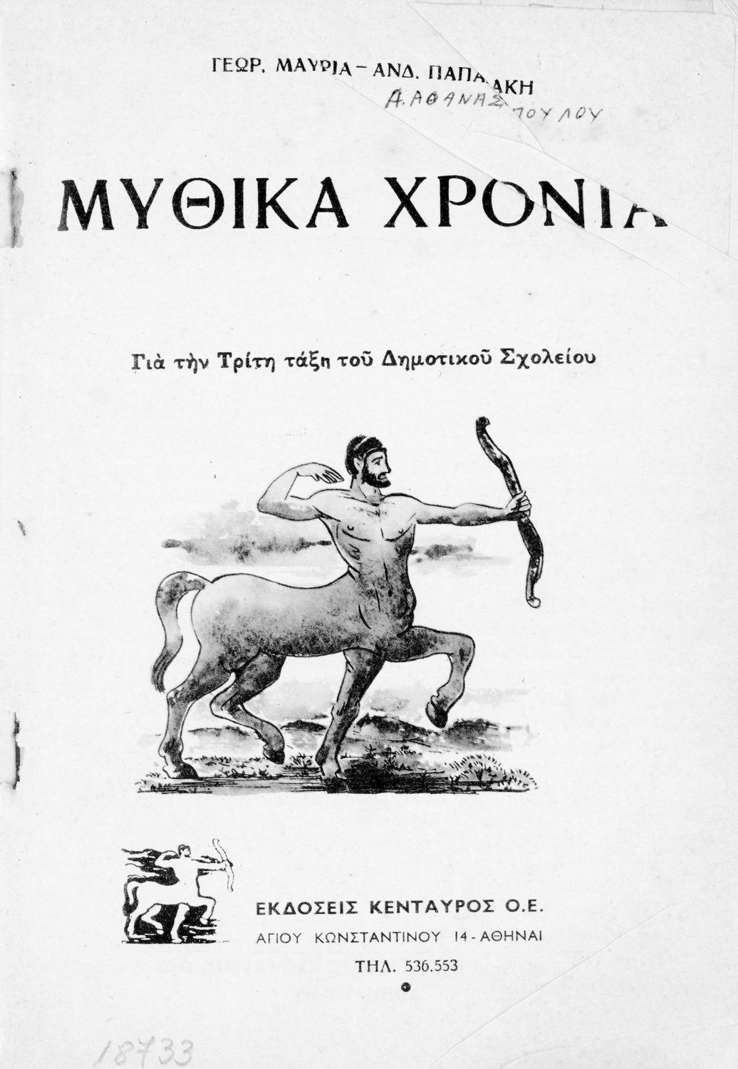 Κωδικός αναγνώρισης: 01-18733 Τίτλος: Μυθικά Χρόνια. Για την Τρίτη Τάξη του Δημοτικού Σχολείου Συγγραφέας: Γεωρ. Μύριας, Ανδ. Παπαδάκης Εικονογράφος: Χρ. Δαγκλής Μέγεθος και υπόστρωμα: Μαθητικό βοήθημα, σκληρό εξώφυλλο, 96 σελίδες. Σκίτσα, χάρτης, εικόνες (ασπρόμαυρα). |