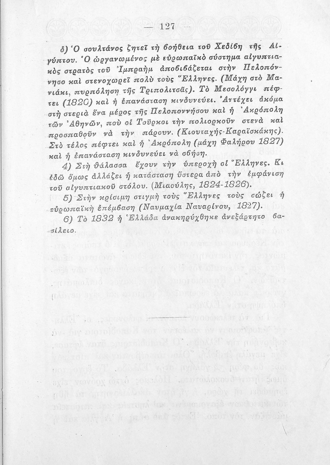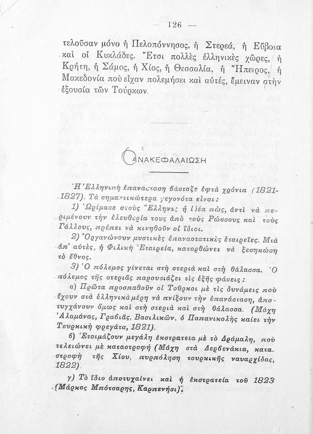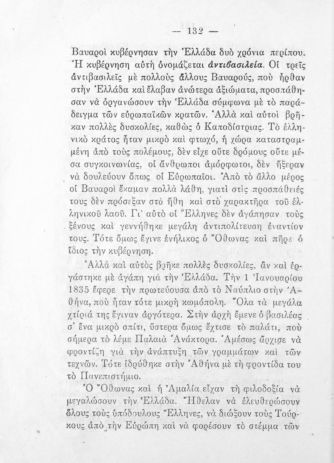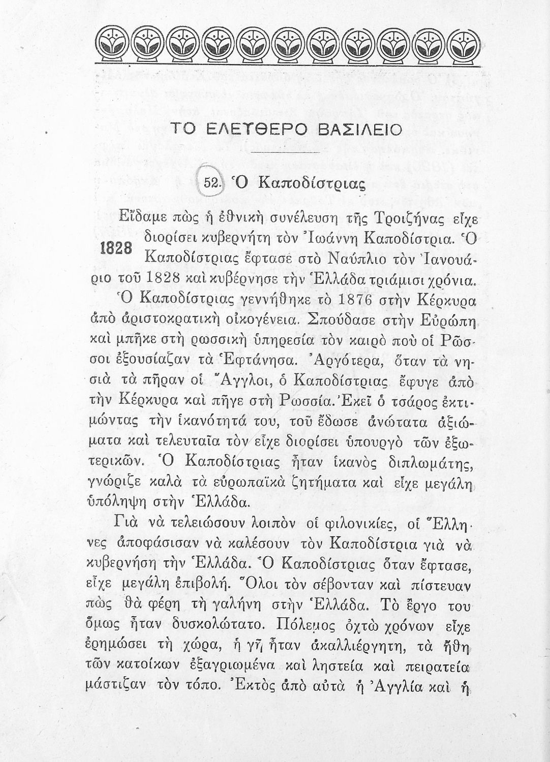 Μαθητικό βοήθημα της ΣΤ΄ Δημοτικού για το μάθημα της Ιστορίας. Καλύπτει τα χρόνια από την άλωσης της Κωνσταντινούπολης, την Οθωμανική Κυριαρχία, αφιερώνει το μεγαλύτερο μέρος στην Ελληνική Επανάσταση. Περιέχει εικόνες των ηρώων. Συνοπτικά αναφέρεται στα ιστορικά γεγονότα του ελεύθερου κράτους μέχρι το 1924. Απουσιάζει το γεγονός της Μικρασιατικής Καταστροφής, της Λωζάννης, το προσφυγικό ζήτημα ενώ αναφέρεται η ανακήρυξη της Δημοκρατίας το 1924. Σκοπός του βιβλίου είναι η ανόρθωση του εθνικού φρονήματος μετά τη Μικρασιατική Καταστροφή και το τέλος του αλυτρωτισμού. Το σύγγραμμα ήταν εγκεκριμένο για μια πενταετία 1934-1938.
