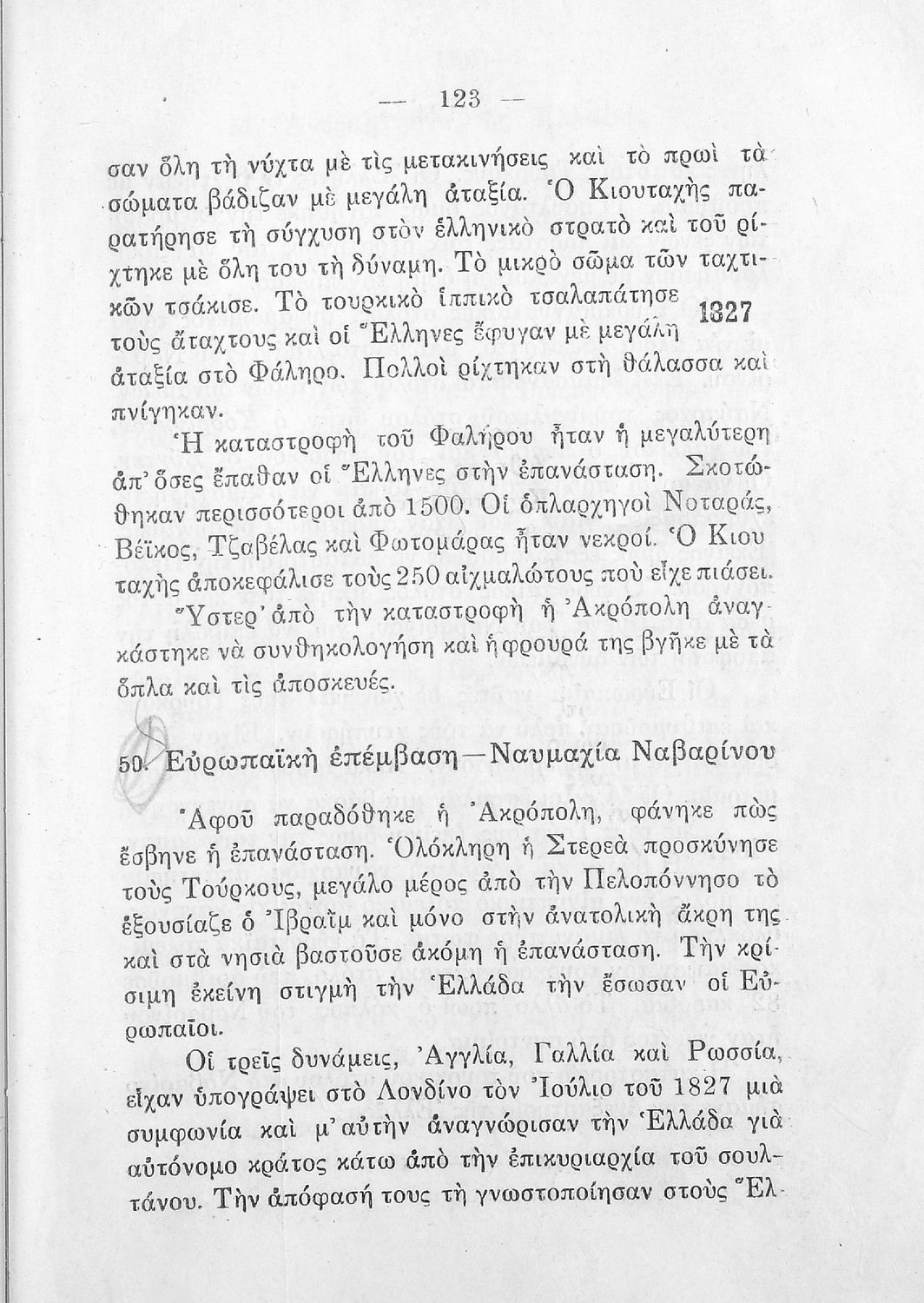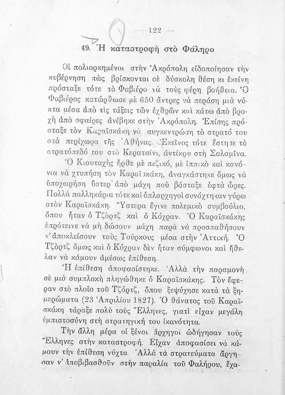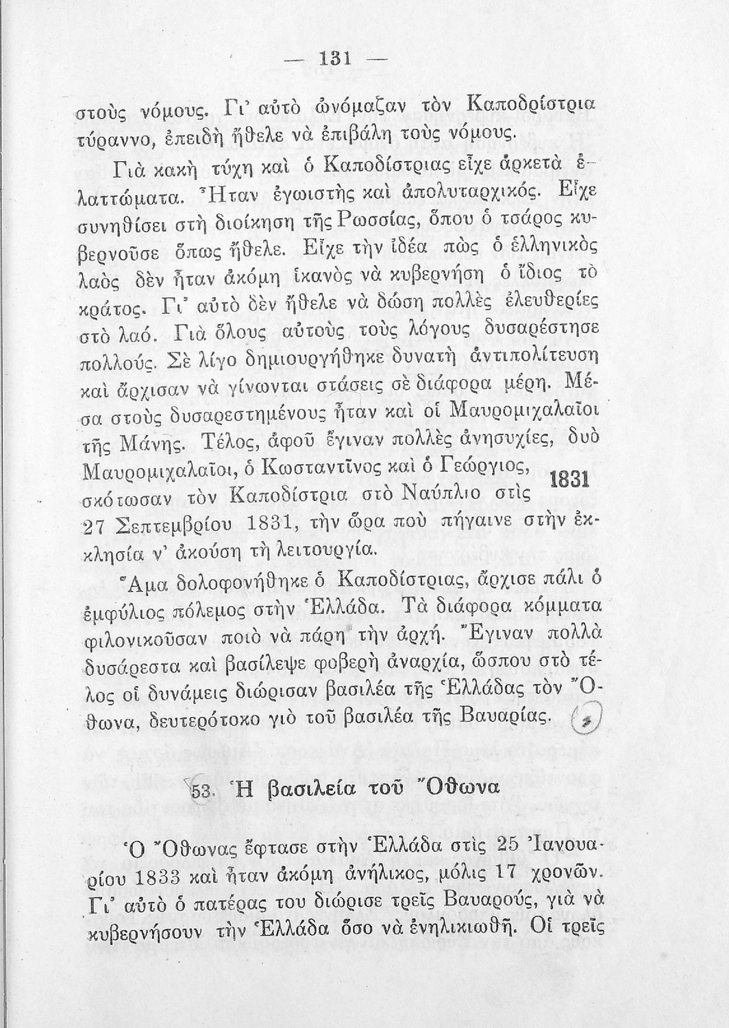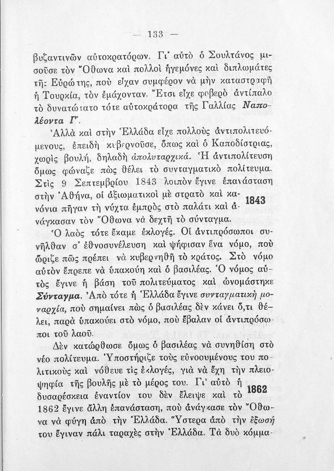 Μαθητικό βοήθημα της ΣΤ΄ Δημοτικού για το μάθημα της Ιστορίας. Καλύπτει τα χρόνια από την άλωσης της Κωνσταντινούπολης, την Οθωμανική Κυριαρχία, αφιερώνει το μεγαλύτερο μέρος στην Ελληνική Επανάσταση. Περιέχει εικόνες των ηρώων. Συνοπτικά αναφέρεται στα ιστορικά γεγονότα του ελεύθερου κράτους μέχρι το 1924. Απουσιάζει το γεγονός της Μικρασιατικής Καταστροφής, της Λωζάννης, το προσφυγικό ζήτημα ενώ αναφέρεται η ανακήρυξη της Δημοκρατίας το 1924. Σκοπός του βιβλίου είναι η ανόρθωση του εθνικού φρονήματος μετά τη Μικρασιατική Καταστροφή και το τέλος του αλυτρωτισμού. Το σύγγραμμα ήταν εγκεκριμένο για μια πενταετία 1934-1938.