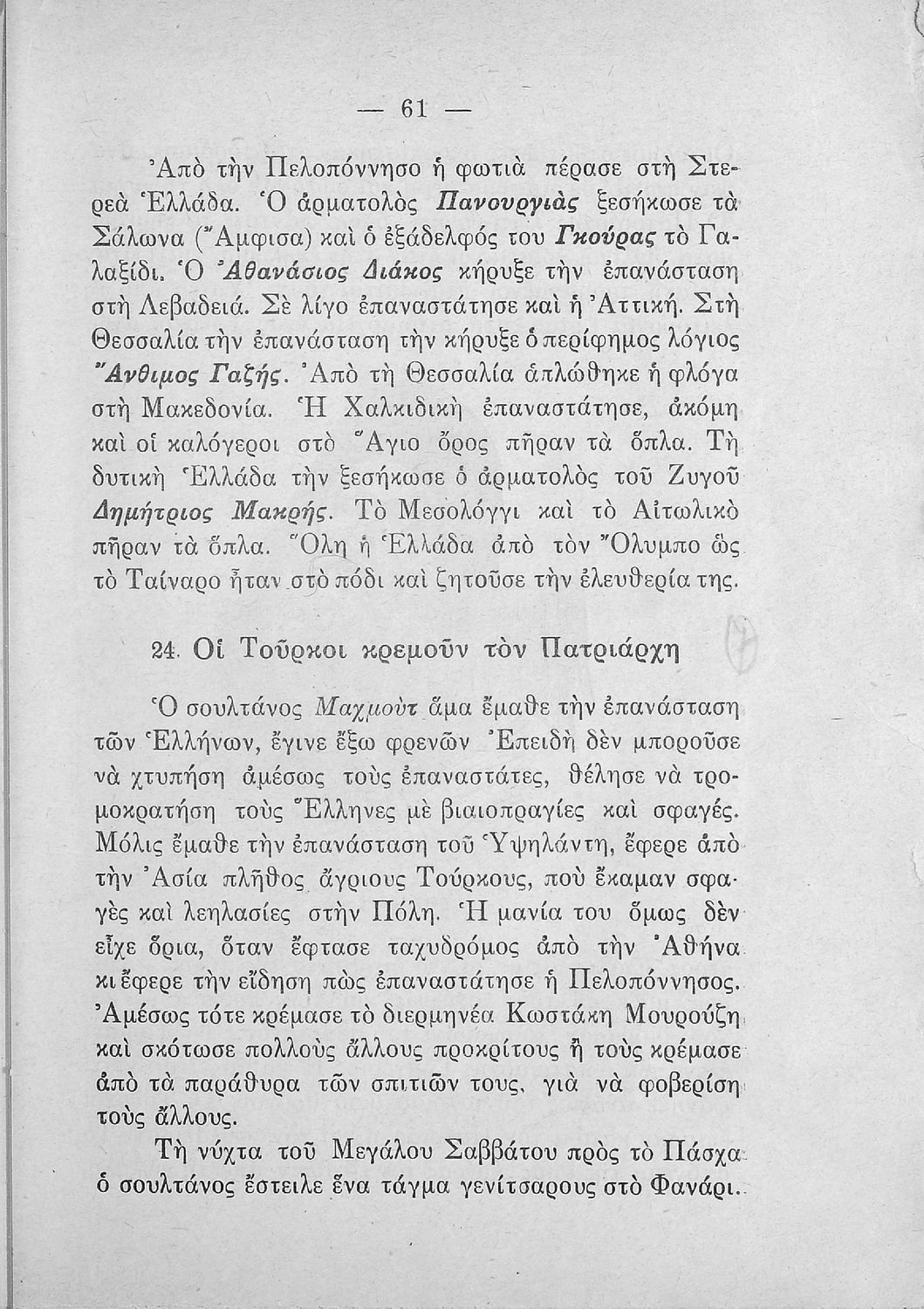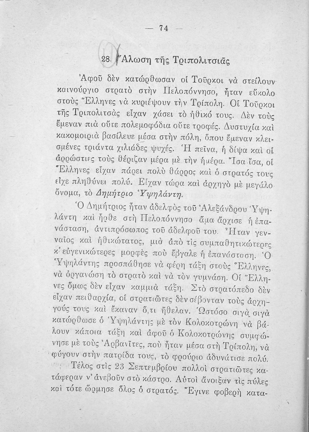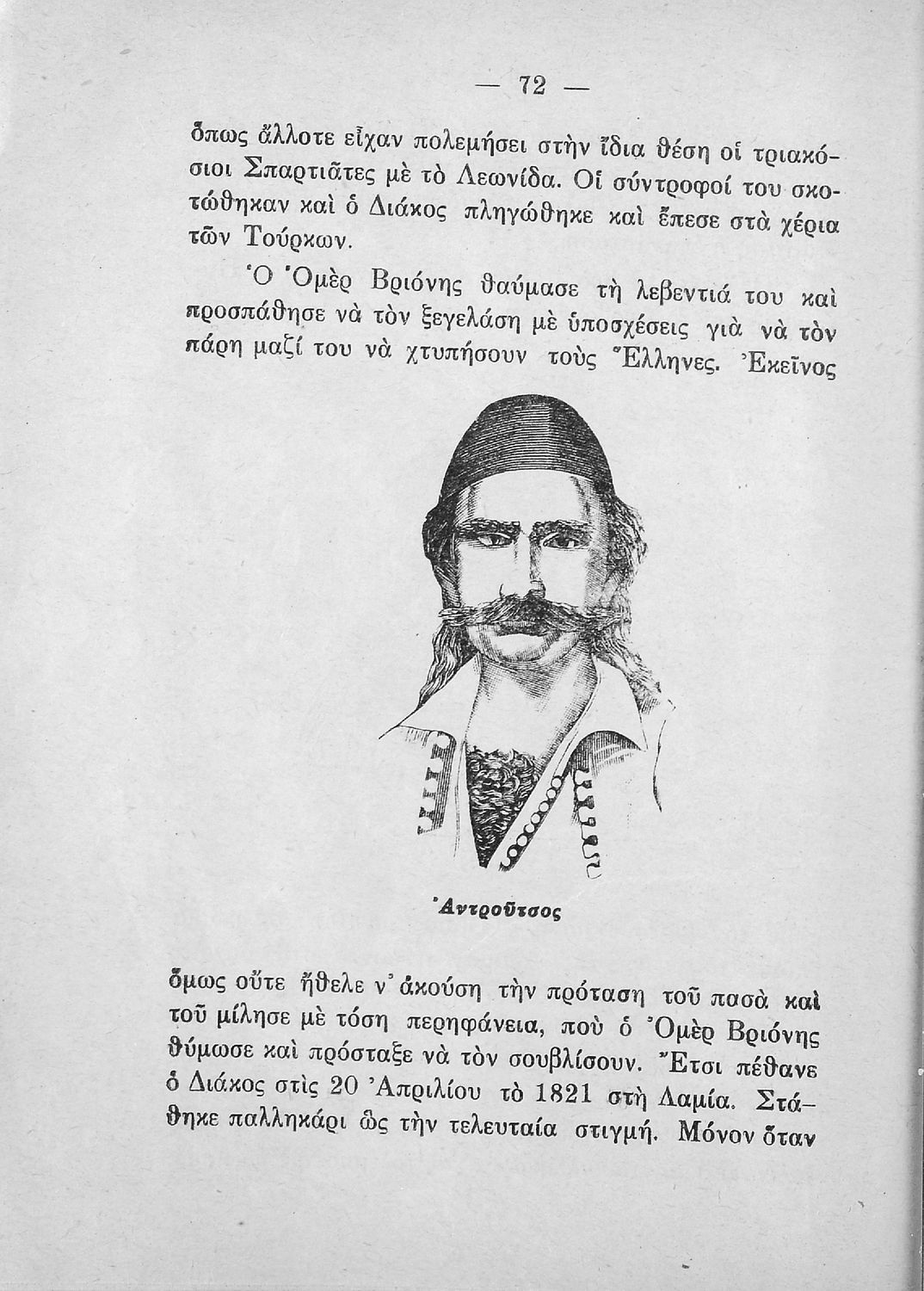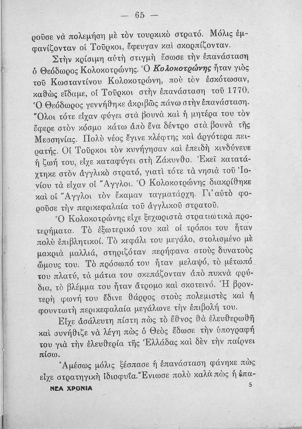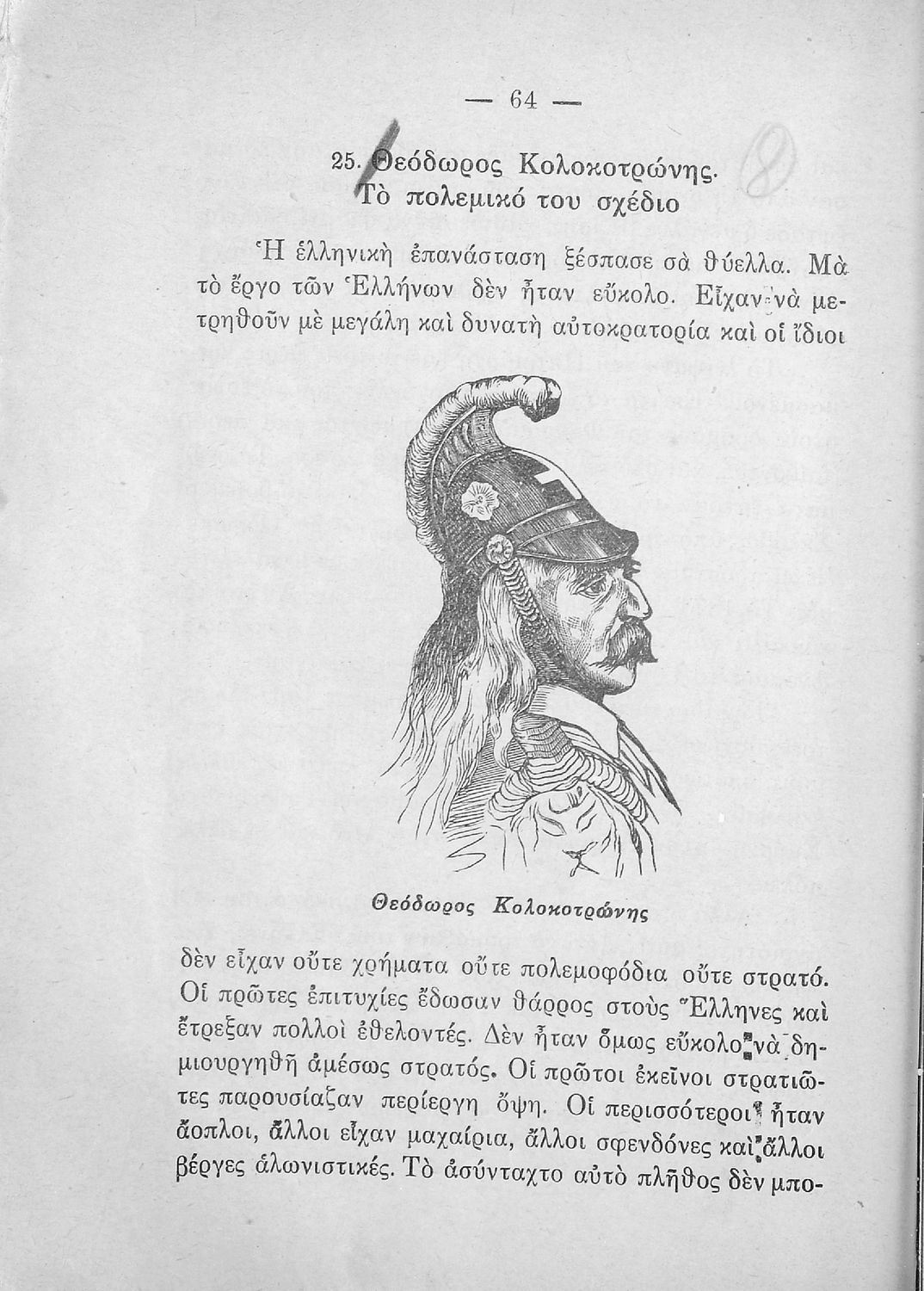 Μαθητικό βοήθημα της ΣΤ΄ Δημοτικού για το μάθημα της Ιστορίας. Καλύπτει τα χρόνια από την άλωσης της Κωνσταντινούπολης, την Οθωμανική Κυριαρχία, αφιερώνει το μεγαλύτερο μέρος στην Ελληνική Επανάσταση. Περιέχει εικόνες των ηρώων. Συνοπτικά αναφέρεται στα ιστορικά γεγονότα του ελεύθερου κράτους μέχρι το 1924. Απουσιάζει το γεγονός της Μικρασιατικής Καταστροφής, της Λωζάννης, το προσφυγικό ζήτημα ενώ αναφέρεται η ανακήρυξη της Δημοκρατίας το 1924. Σκοπός του βιβλίου είναι η ανόρθωση του εθνικού φρονήματος μετά τη Μικρασιατική Καταστροφή και το τέλος του αλυτρωτισμού. Το σύγγραμμα ήταν εγκεκριμένο για μια πενταετία 1934-1938.