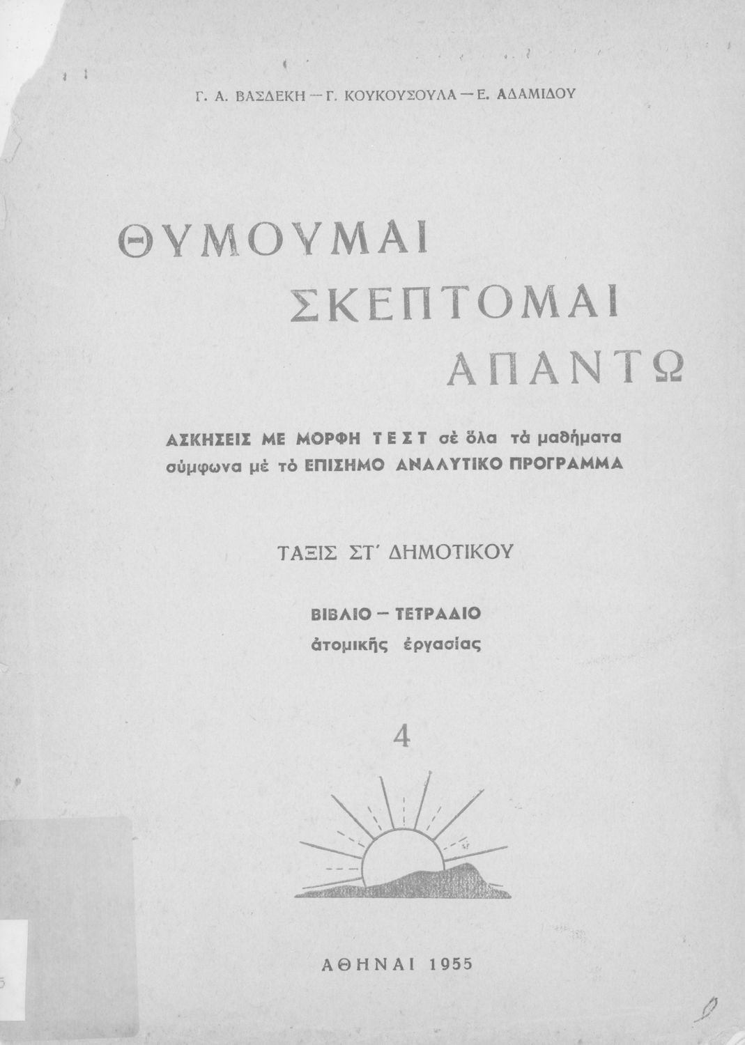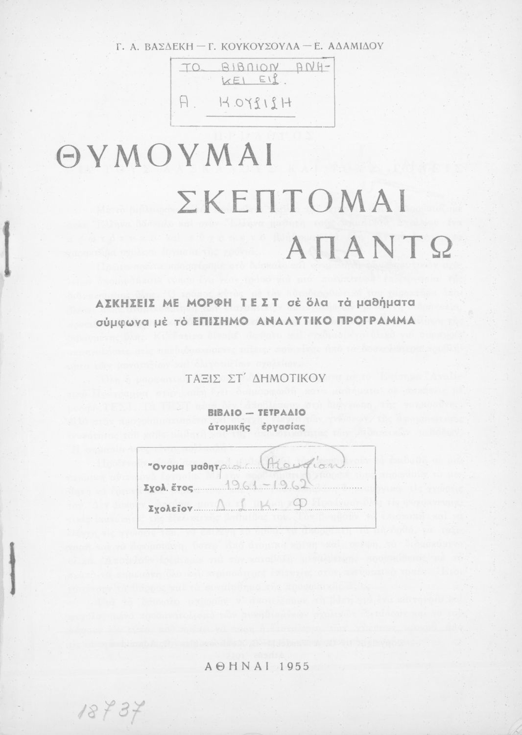 LDR 01391 2200193 4500 035 ## _a01-18737 040 ## _aΙνστιτούτο Εκπαιδευτικής Πολιτικής 041 ## _ael 100 ## _aΓ. Α. Βασδέκης _aΓ. Κουκουσούλας _aΕ. Αδαμίδης 110 ## _a18737 245 0# _aΘυμούμαι Σκέπτομαι Απαντώ ασκήσεις με μορφή τεστ σε όλα τα μαθήματα σύμφωνα με το επίσημο αναλυτικό πρόγραμμα τάξις ΣΤ΄ Δημοτικού 260 ## _aΑθήνα _bΤυπογραφείο: Συνεργατικής _c1955 300 ## _a112 520 ## _aΜαθητικό βοήθημα-τετράδιο για τη ΣΤ΄ Δημοτικού που περιλαμβάνει ατομικές εργασίες με ασκήσεις σε μορφή τεστ, για όλα τα μαθήματα σύμφωνα με το επίσημο αναλυτικό πρόγραμμα. 521 ## _aΣΤ' Δημοτικού 522 ## _aΕλλάδα 546 ## _aΔημοτική 563 ## _aΜαλακό Εξώφυλλο 650 #4 _aΑριθμητική _aΑτομικοποίηση της διανοητικής σκέψης _aΓεωγραφία _aΓραμματική _aΔημιουργική διδασκαλία _aΙστορία _aΚατήχηση _aΜαθηματικά _aΟρθογραφία _aΤεστ