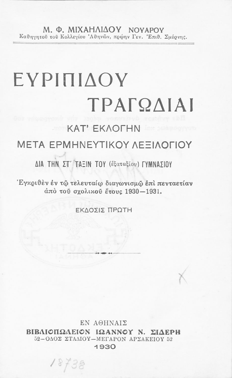 Τίτλος: Ευριπίδου Τραγωδίαι κατ΄ εκλογήν μετά ερμηνευτικού λεξιλογίου. Δια την ΣΤ΄ Τάξιν του Γυμνασίου