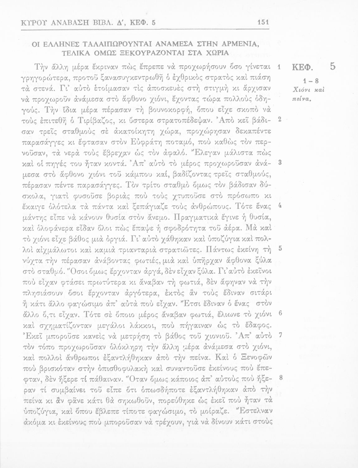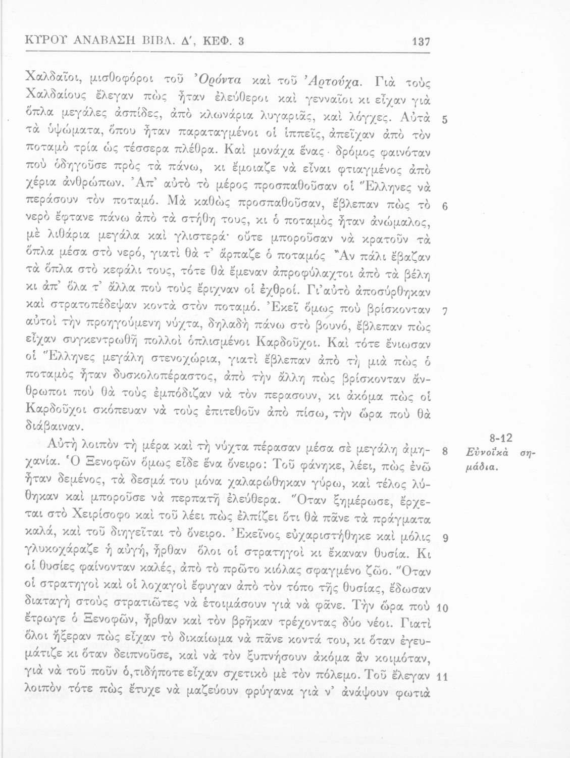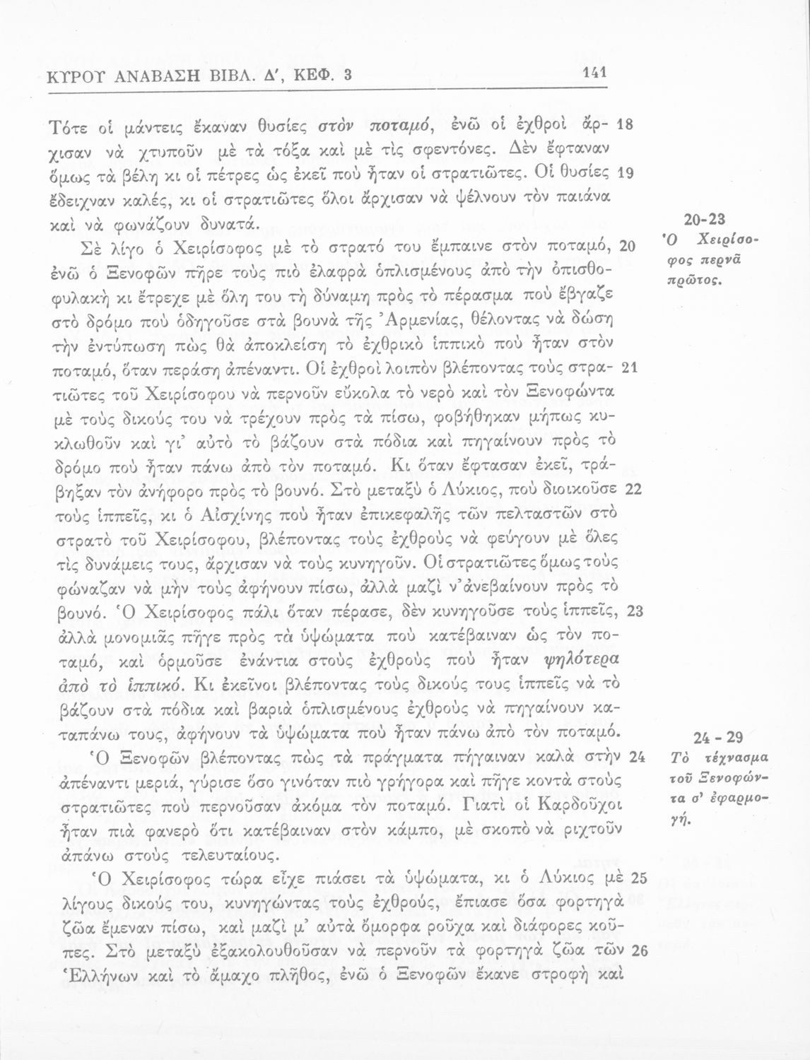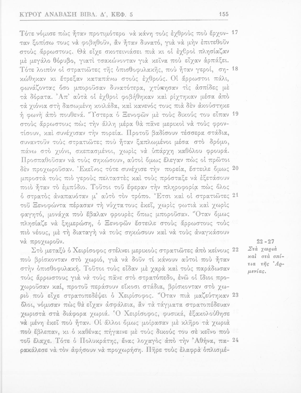 Σχολικό εγχειρίδιο Αρχαίων Ελληνικών Α΄ Γυμνασίου που περιλαμβάνει το έργο του Ξενοφώντα Κύρου Ανάβασις, μετάφραση, ερμηνευτικές και πραγματολογικές παρατηρήσεις.