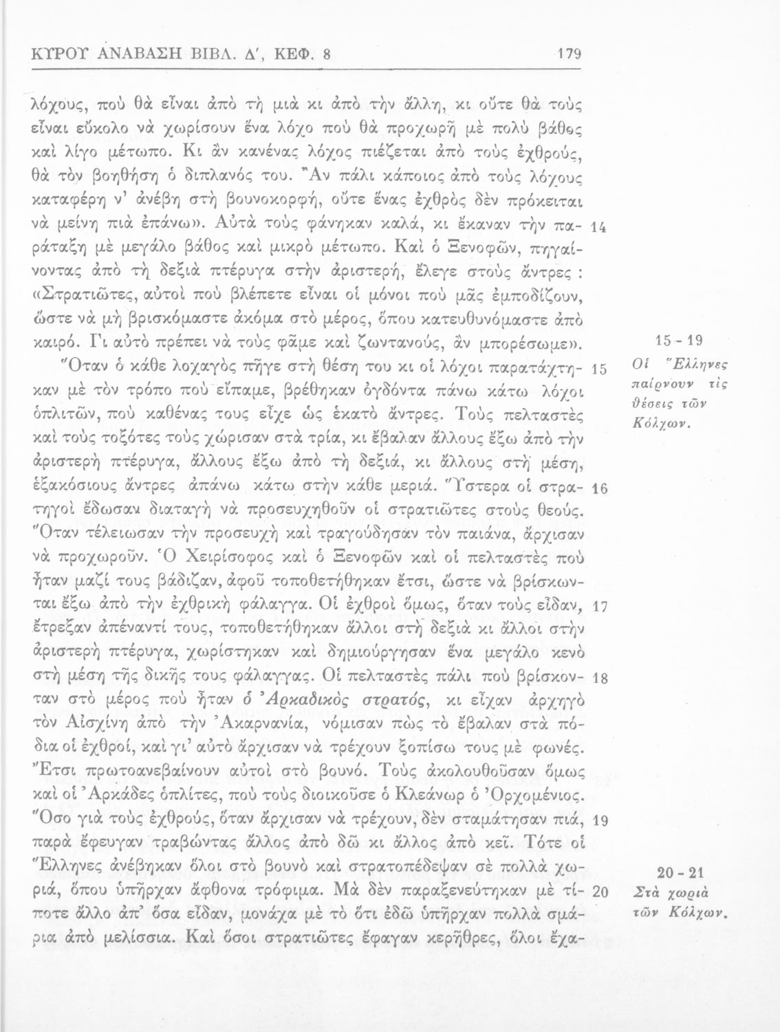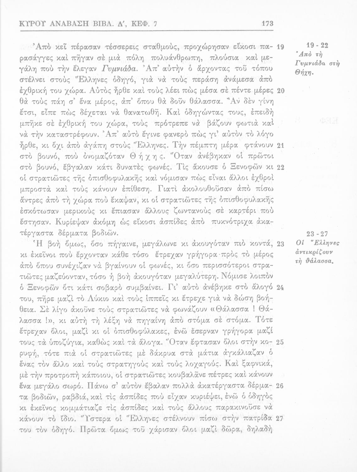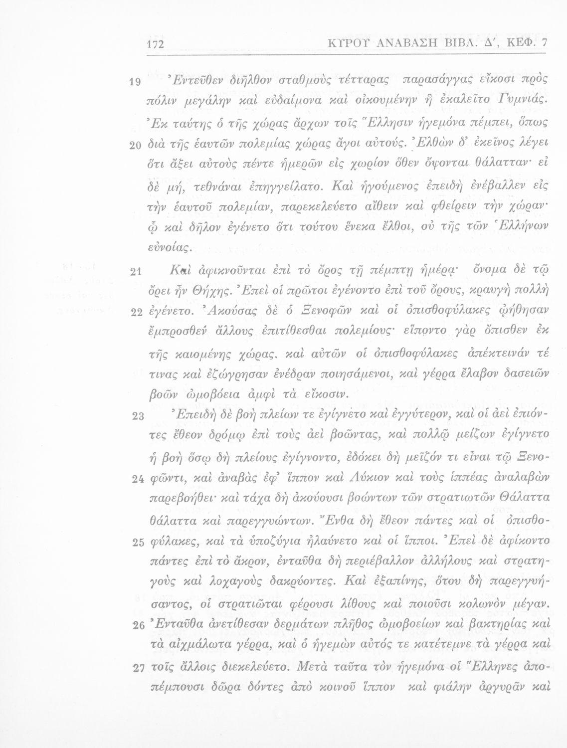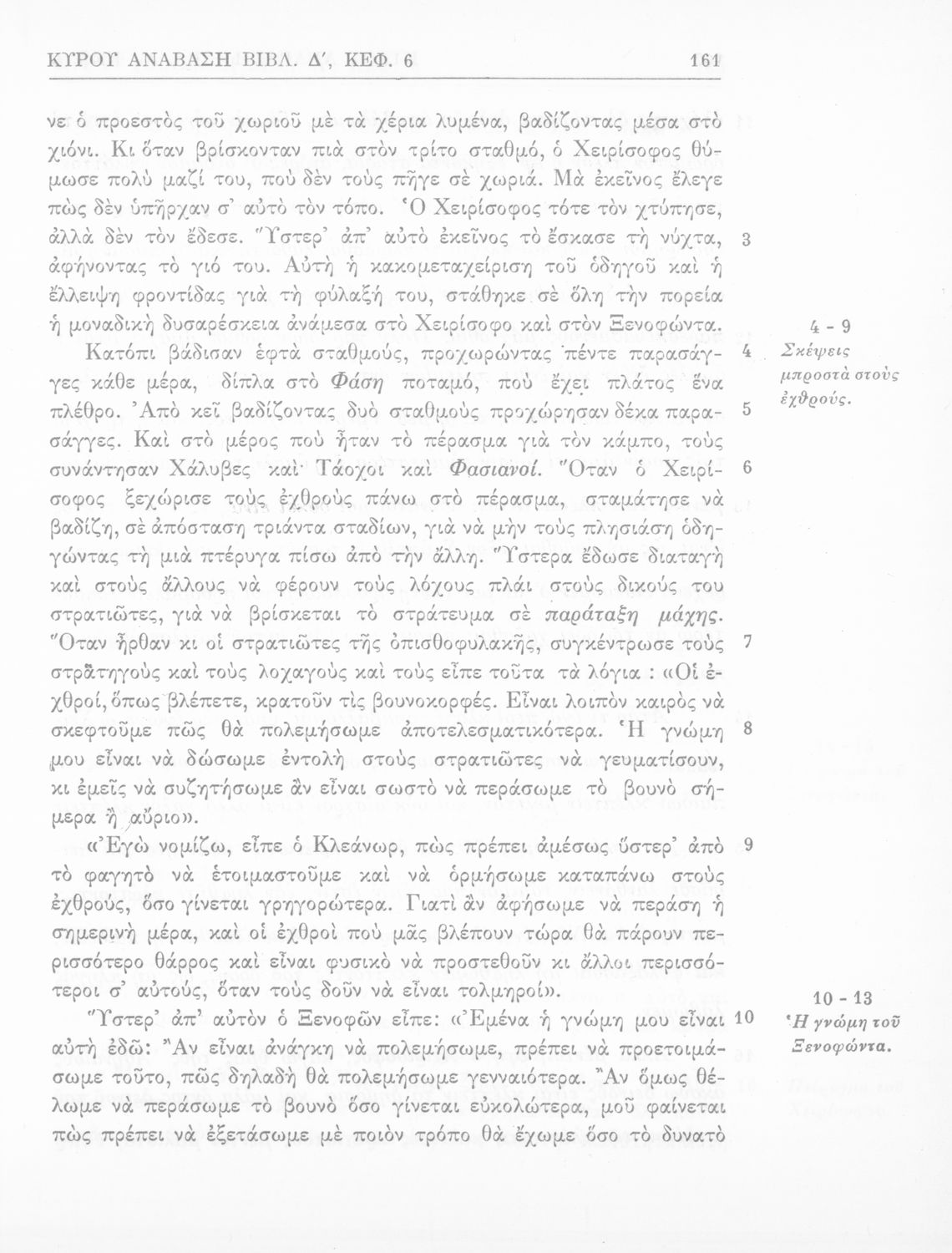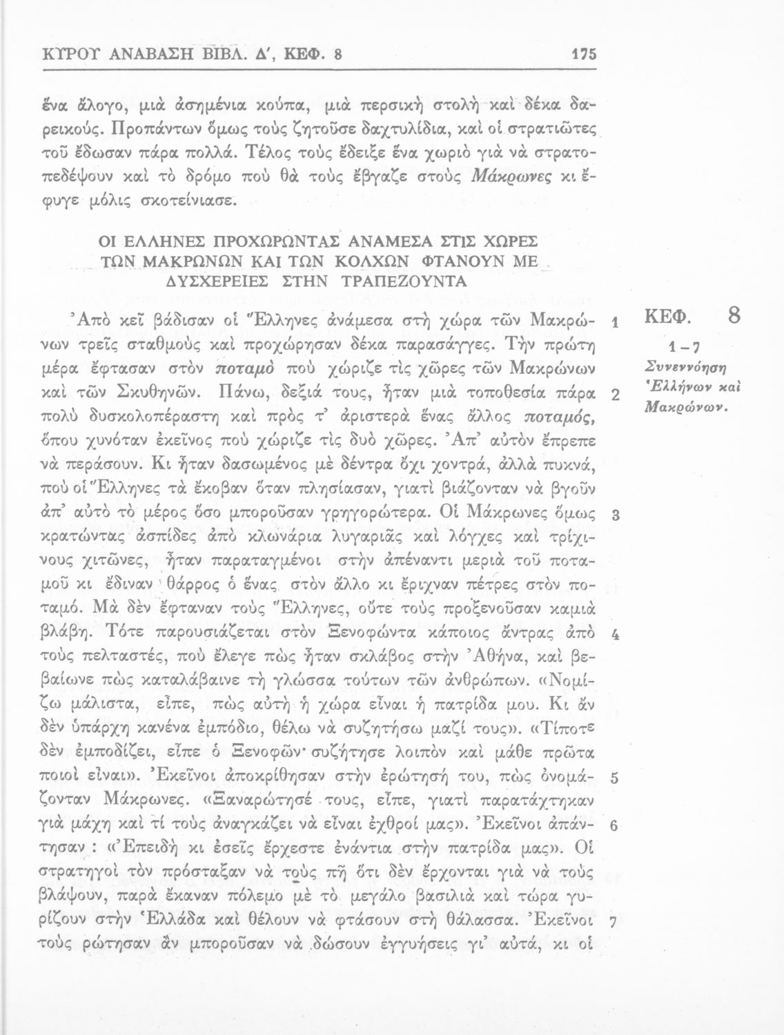 Σχολικό εγχειρίδιο Αρχαίων Ελληνικών α΄ Γυμνασίου που περιλαμβάνει μετάφραση του έργου του Ξενοφώντα Κύρου Ανάβασις, εισαγωγικά σχόλια για τη ζωή και το έργο του, και ερμηνευτικές παρατηρήσεις.