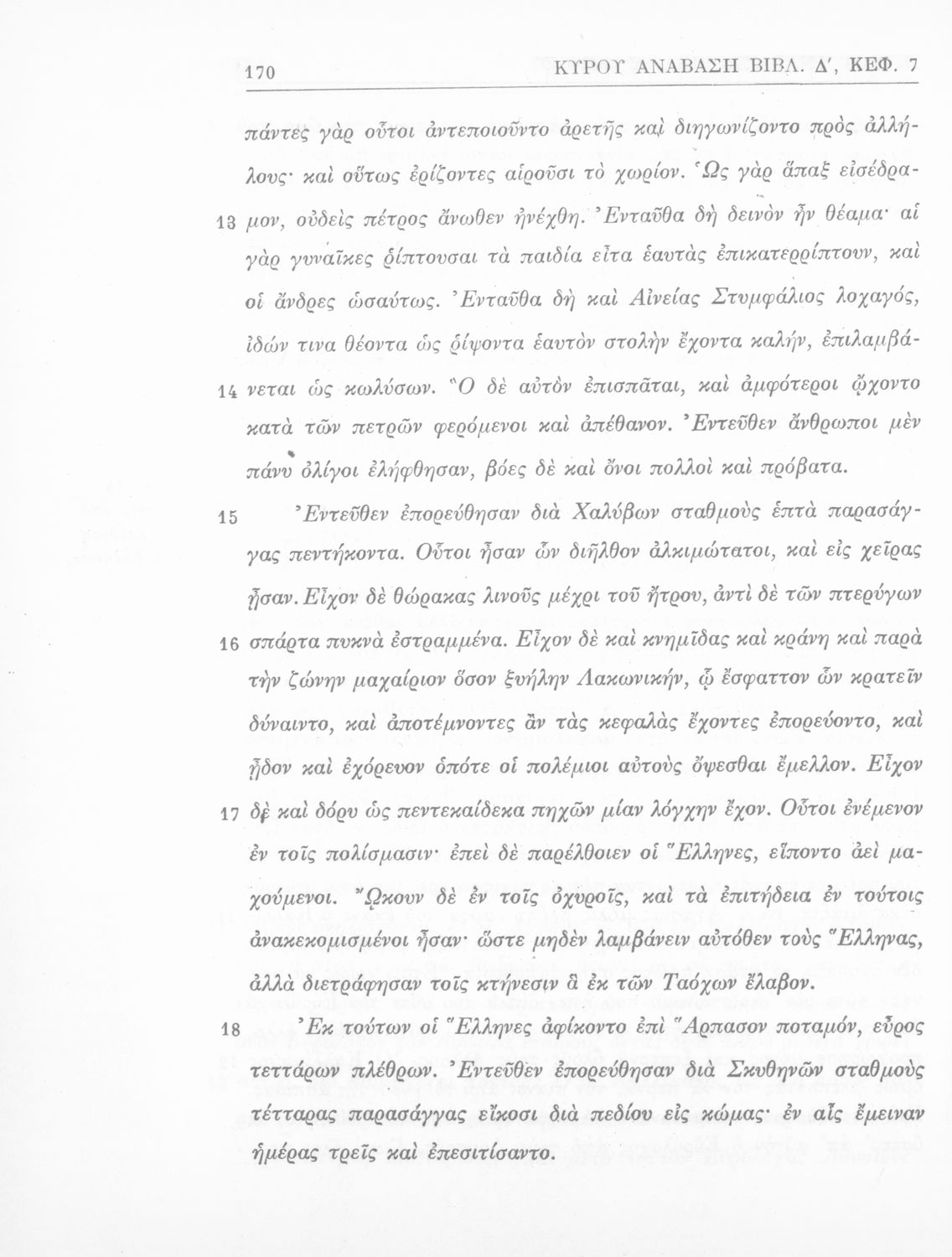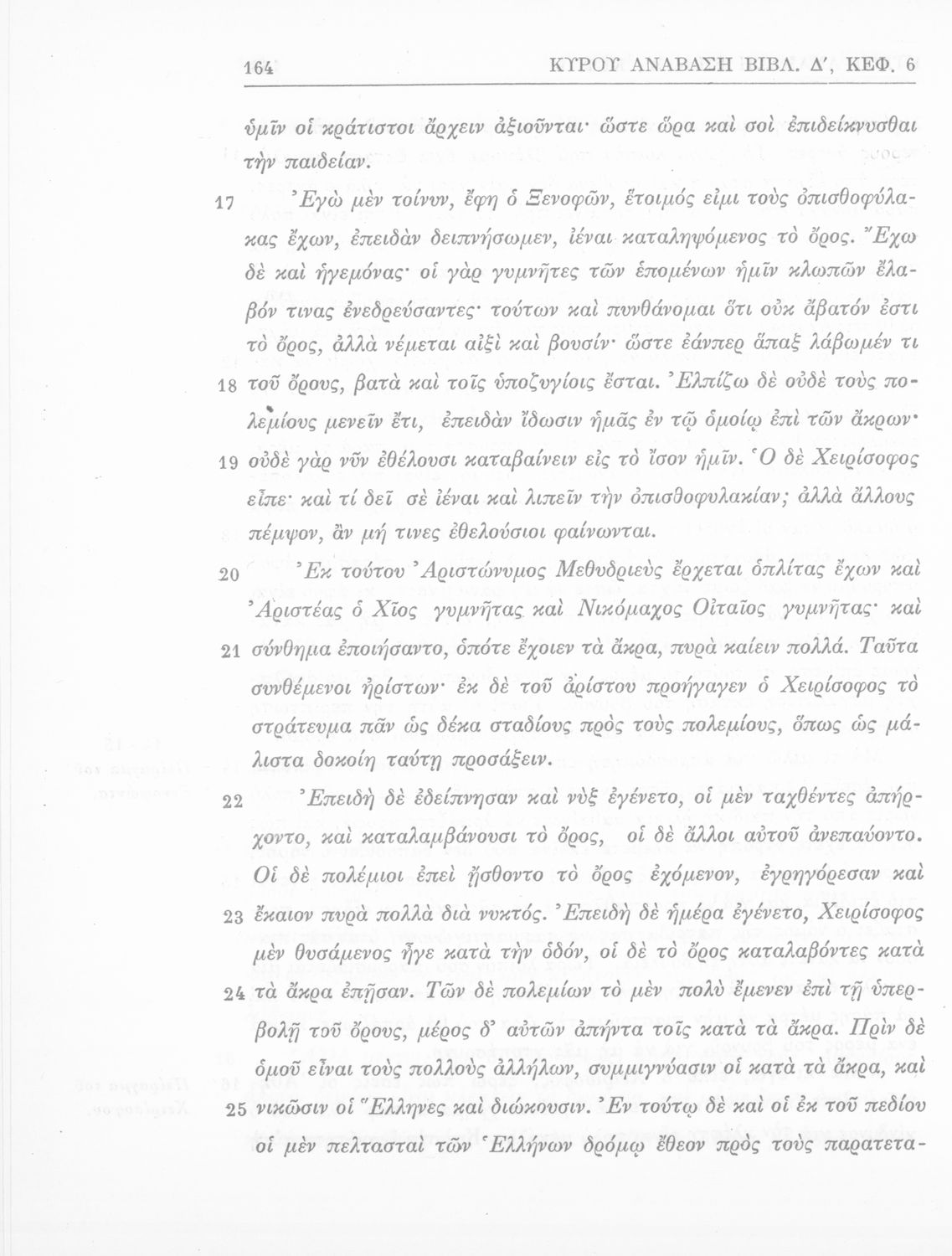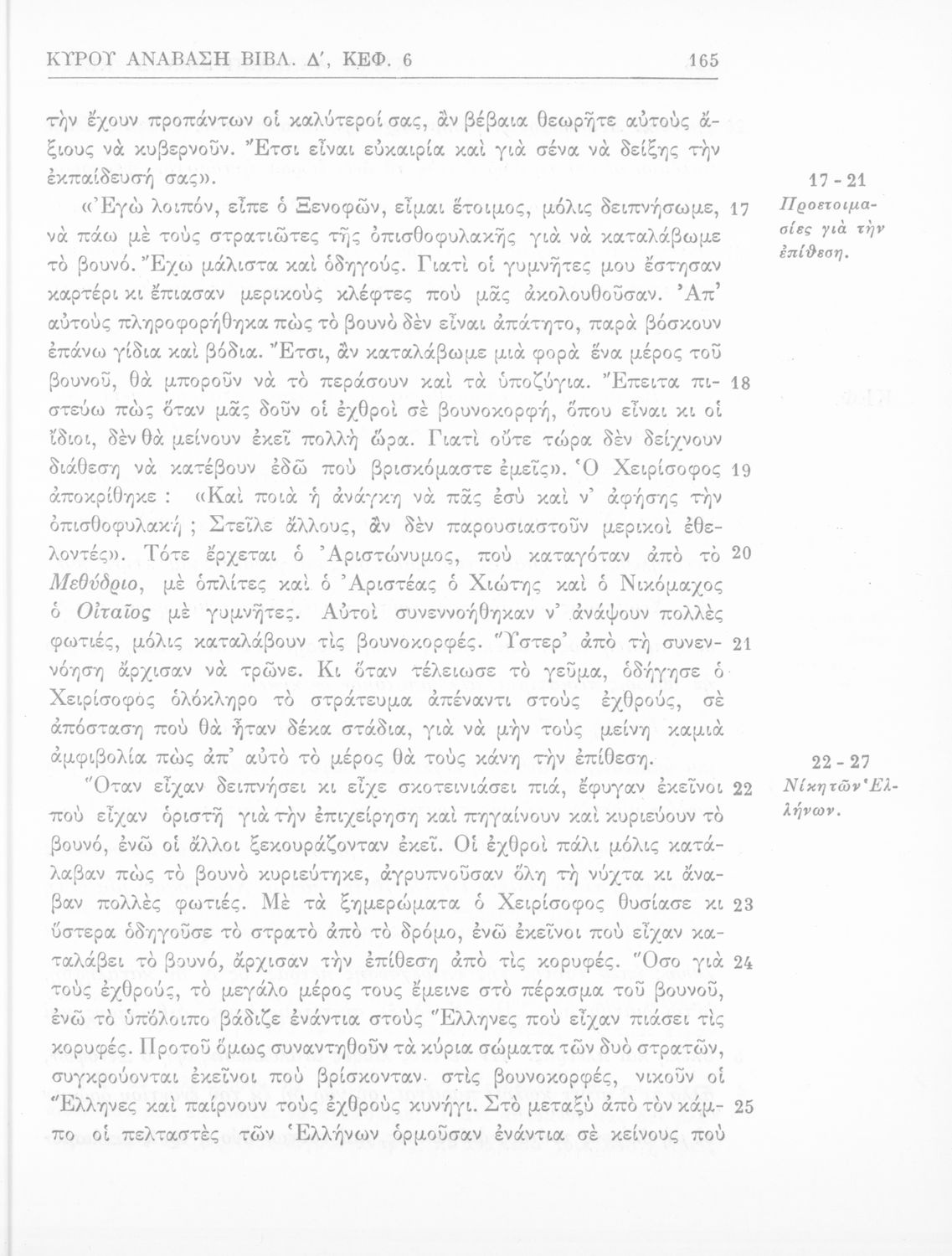 Σχολικό εγχειρίδιο της Γ' Ελληνικού Σχολείου και Αστικών Σχολείων για το μάθημα των Αρχαίων Ελληνικών. Το σύγγραμμα περιλαμβάνει κείμενα κατ΄ επιλογή από τα τέσσερα τελευταία βιβλία του έργου Κύρου Ανάβασις. ...