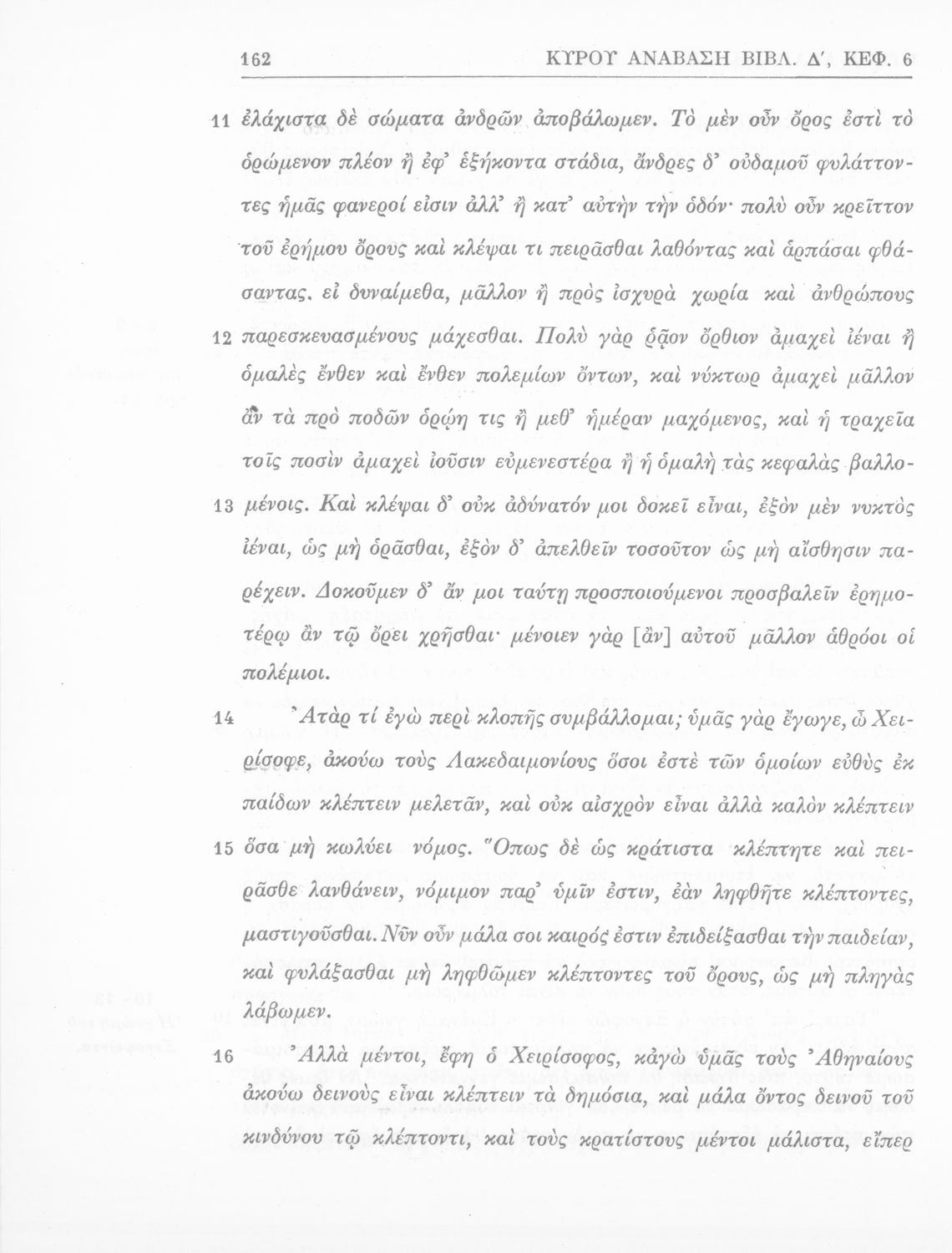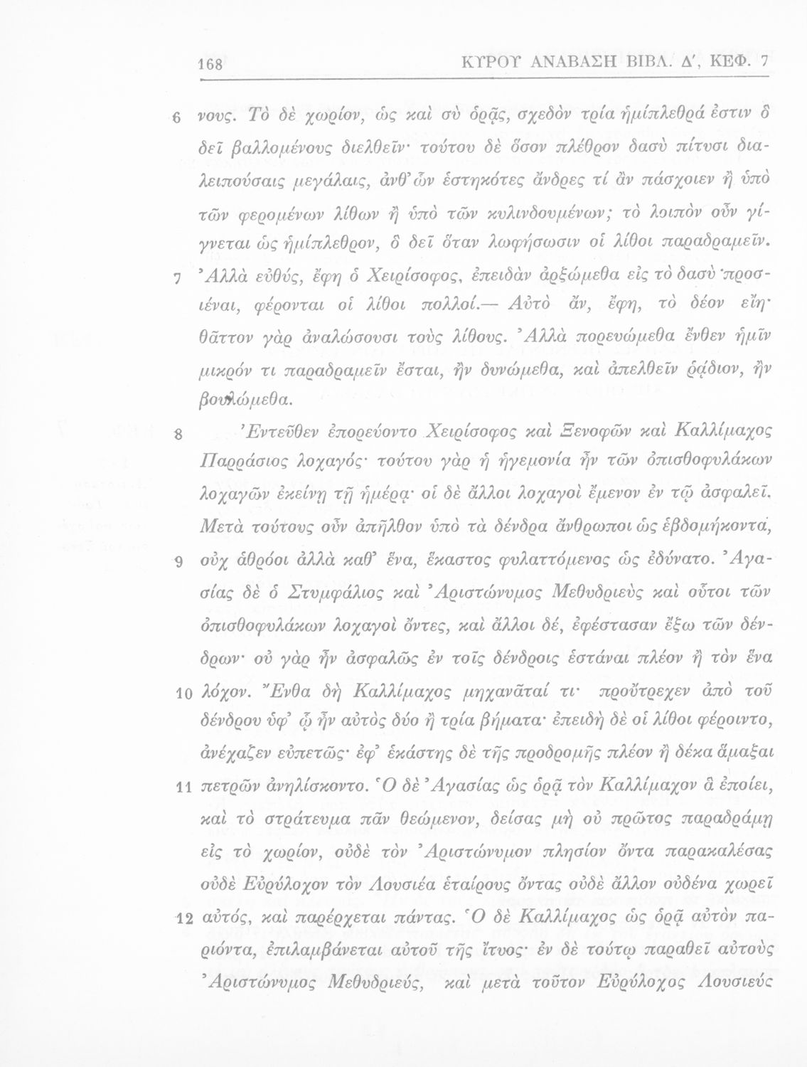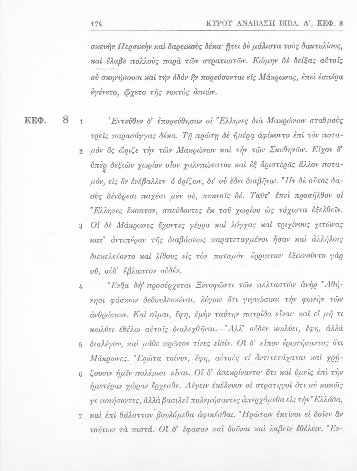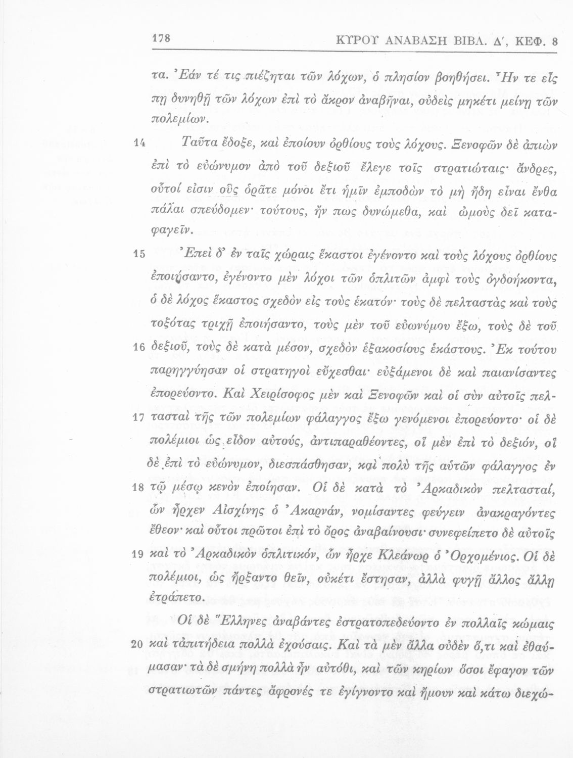 Σχολικό εγχειρίδιο της Γ' Ελληνικού Σχολείου και Αστικών Σχολείων για το μάθημα των Αρχαίων Ελληνικών. Το σύγγραμμα περιλαμβάνει κείμενα κατ΄ επιλογή από τα τέσσερα τελευταία βιβλία του έργου Κύρου Ανάβασις. ...